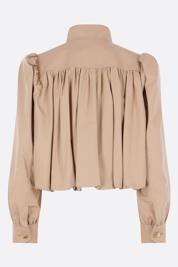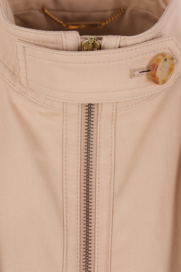 Chloé cropped jacket in beige cotton canvas. Featuring a high collar with buttoned tab, double-zip front closure, double-welt pockets, gathering on the shoulders and back, long puffed sleeves with buttoned cuffs, and balloon hem. Lined interior.