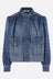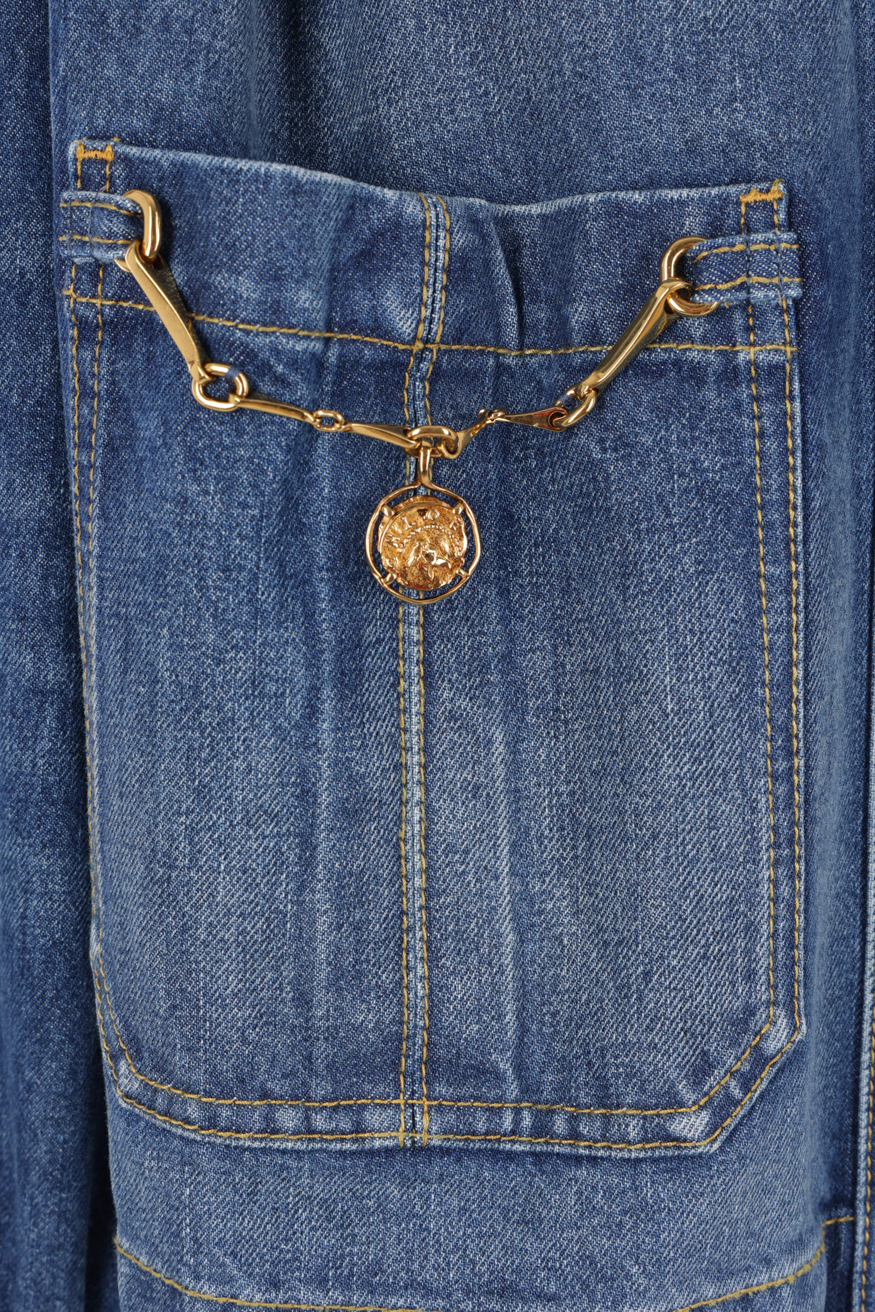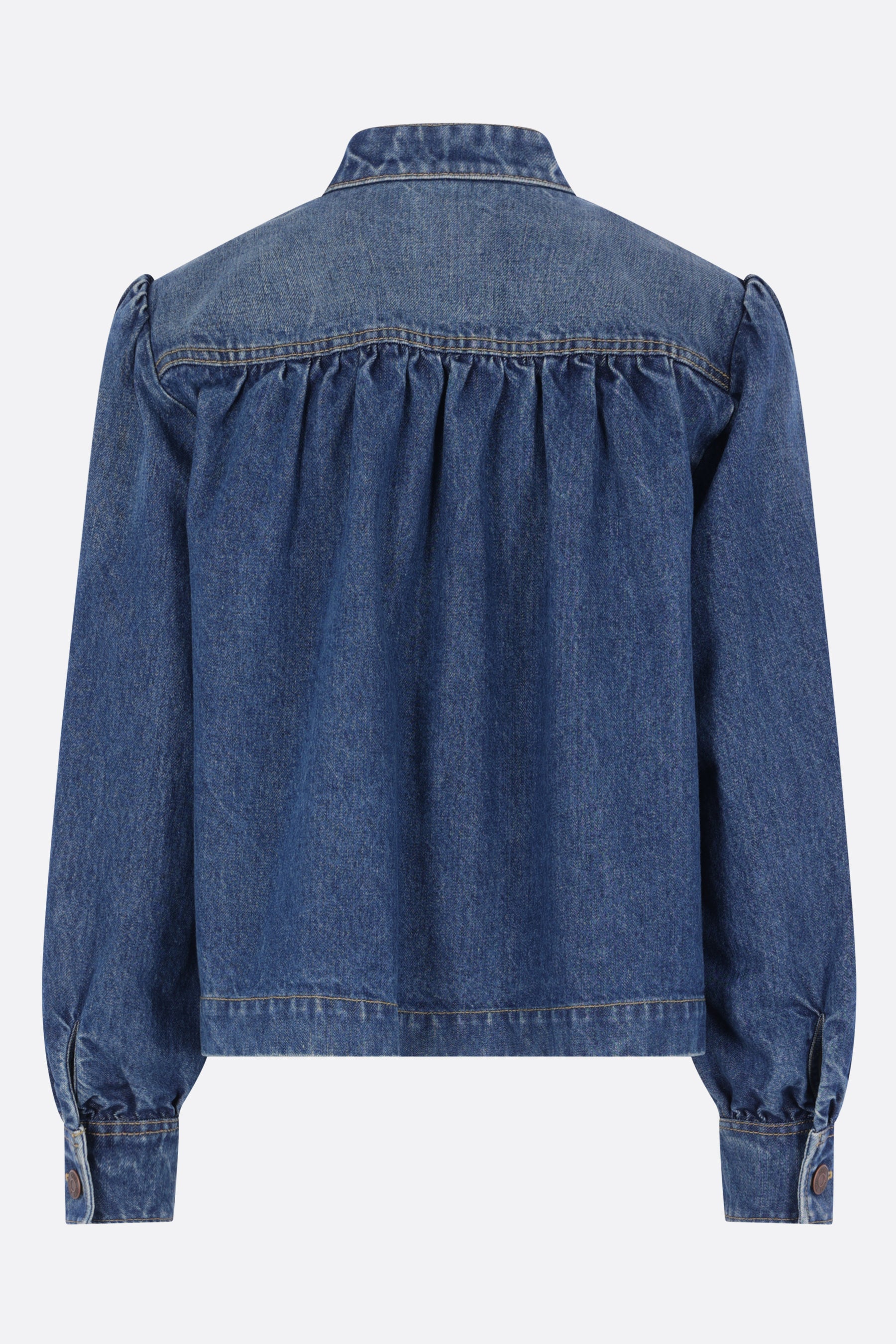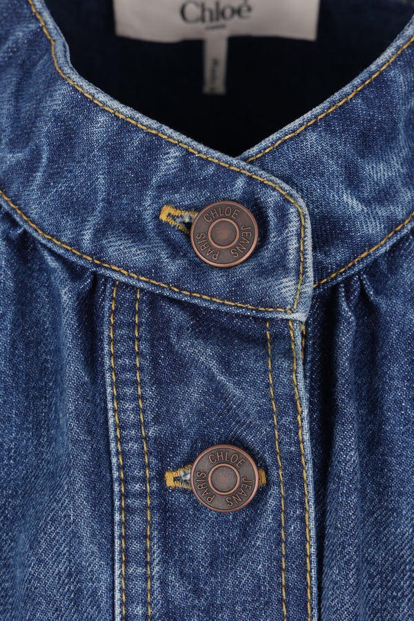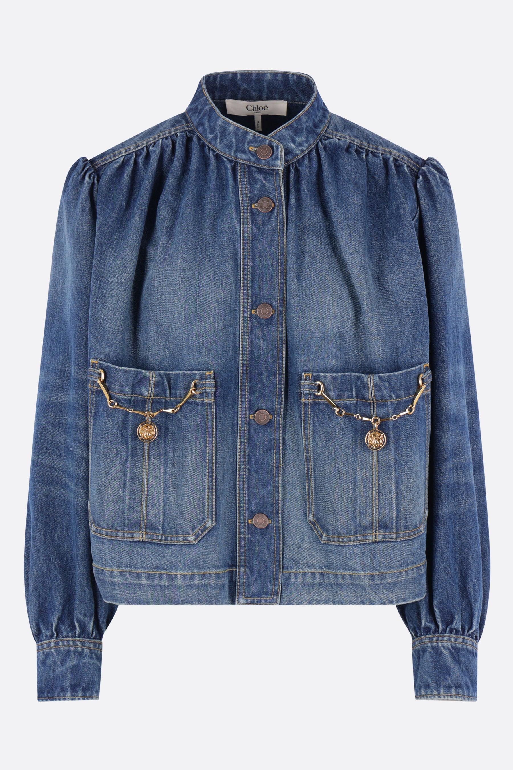 Chloé gathered jacket in indigo cotton denim. Featuring a high collar, front metallic button closure, patch pockets adorned with chains and Horse medallions, long puffed sleeves with buttoned cuffs, and a straight hem. Unlined interior.