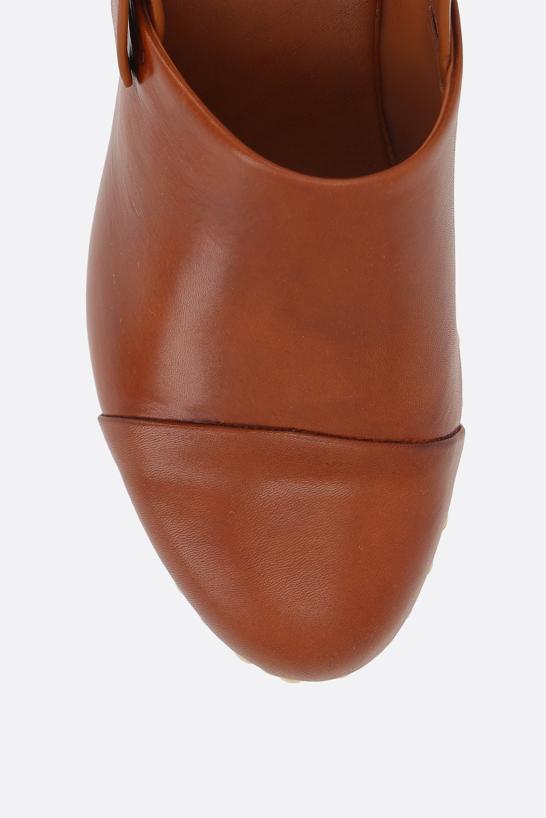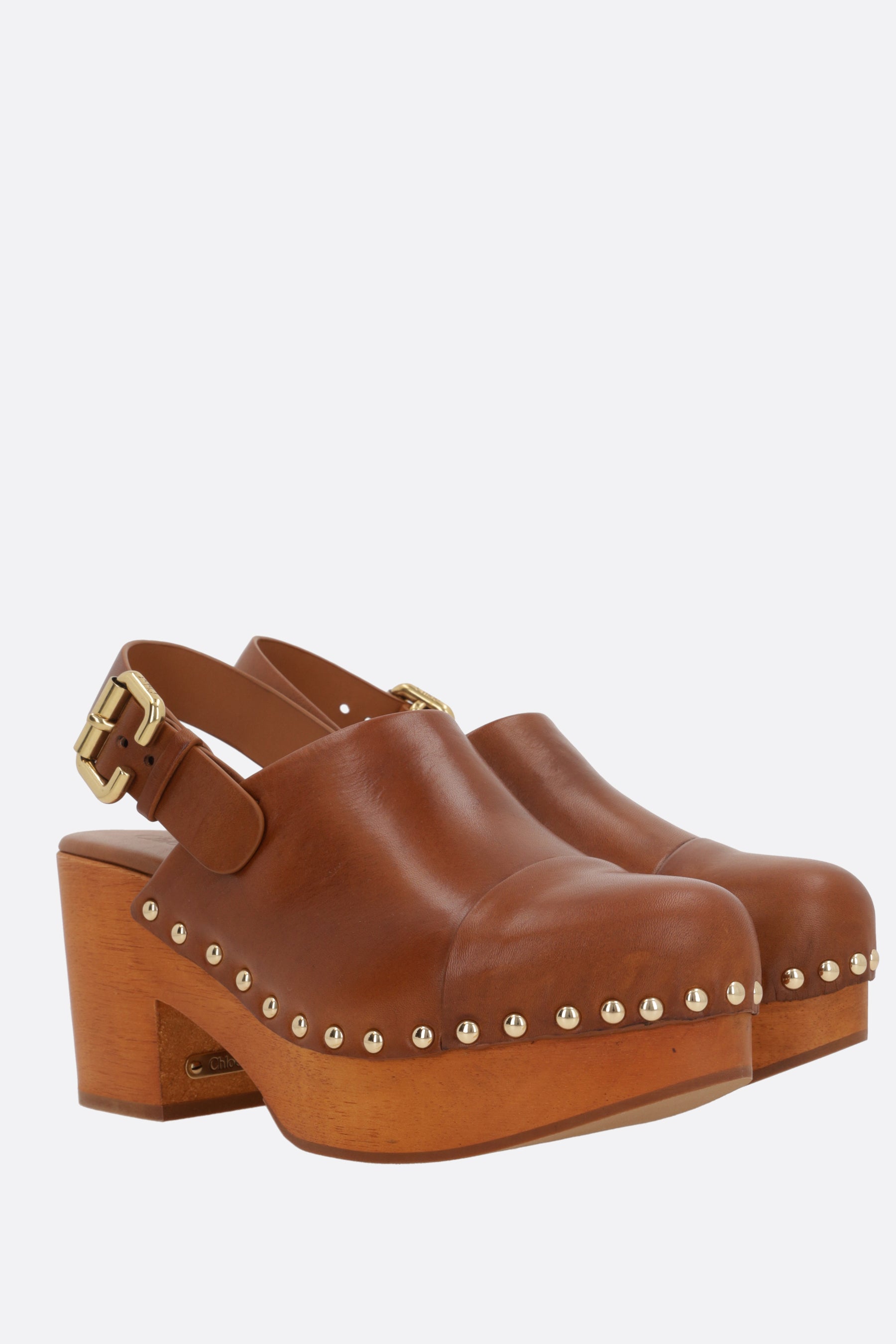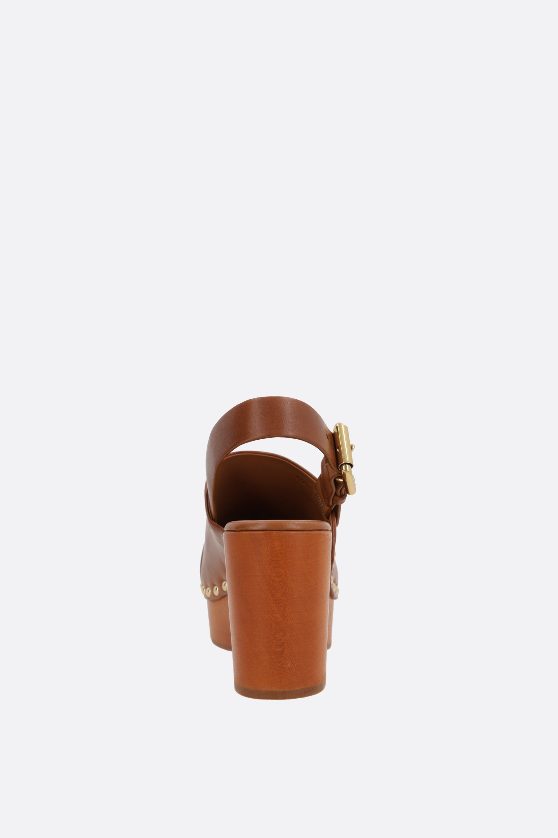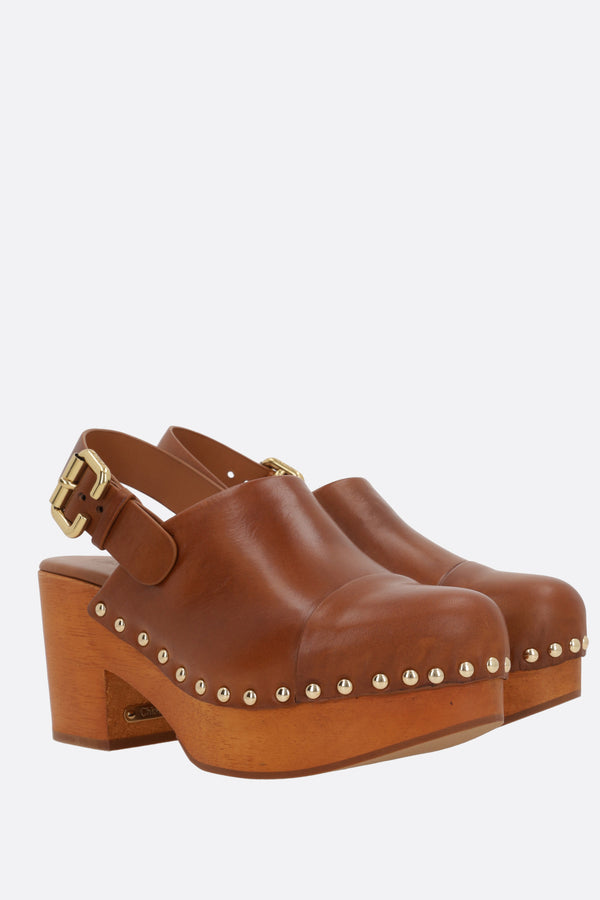 Chloé clogs crafted from shiny brown leather. Featuring an adjustable ankle strap with a metal buckle, almond toe, leather lining, thick platform with a wooden wedge, and a rubber sole.