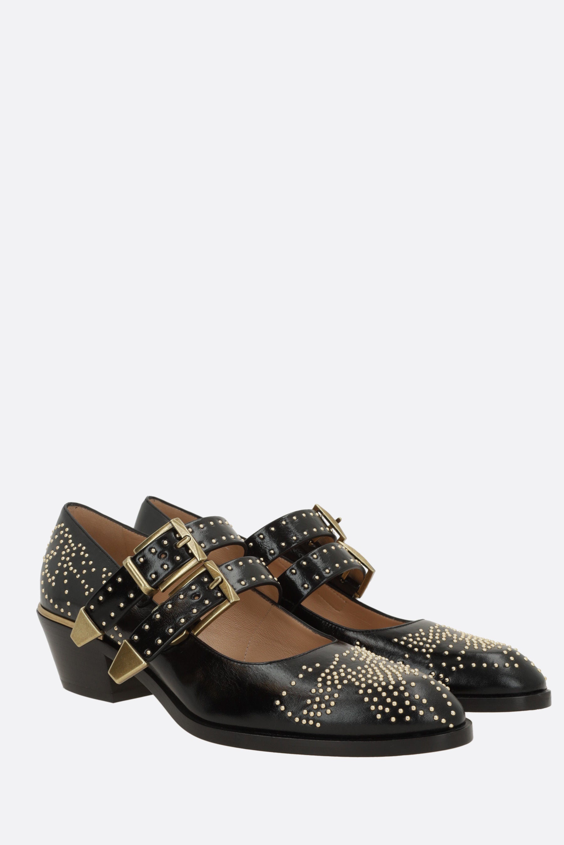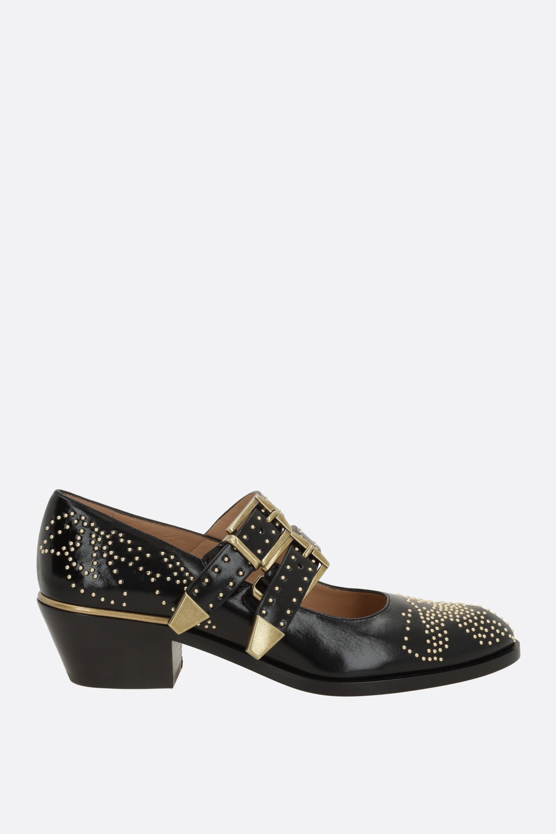 Chloé mary-jane pumps crafted from black shiny leather and adorned with metal studs. Featuring a pointed toe, adjustable side straps with metal buckles, leather lining, and leather sole. The design is completed by a wooden Cuban heel.
