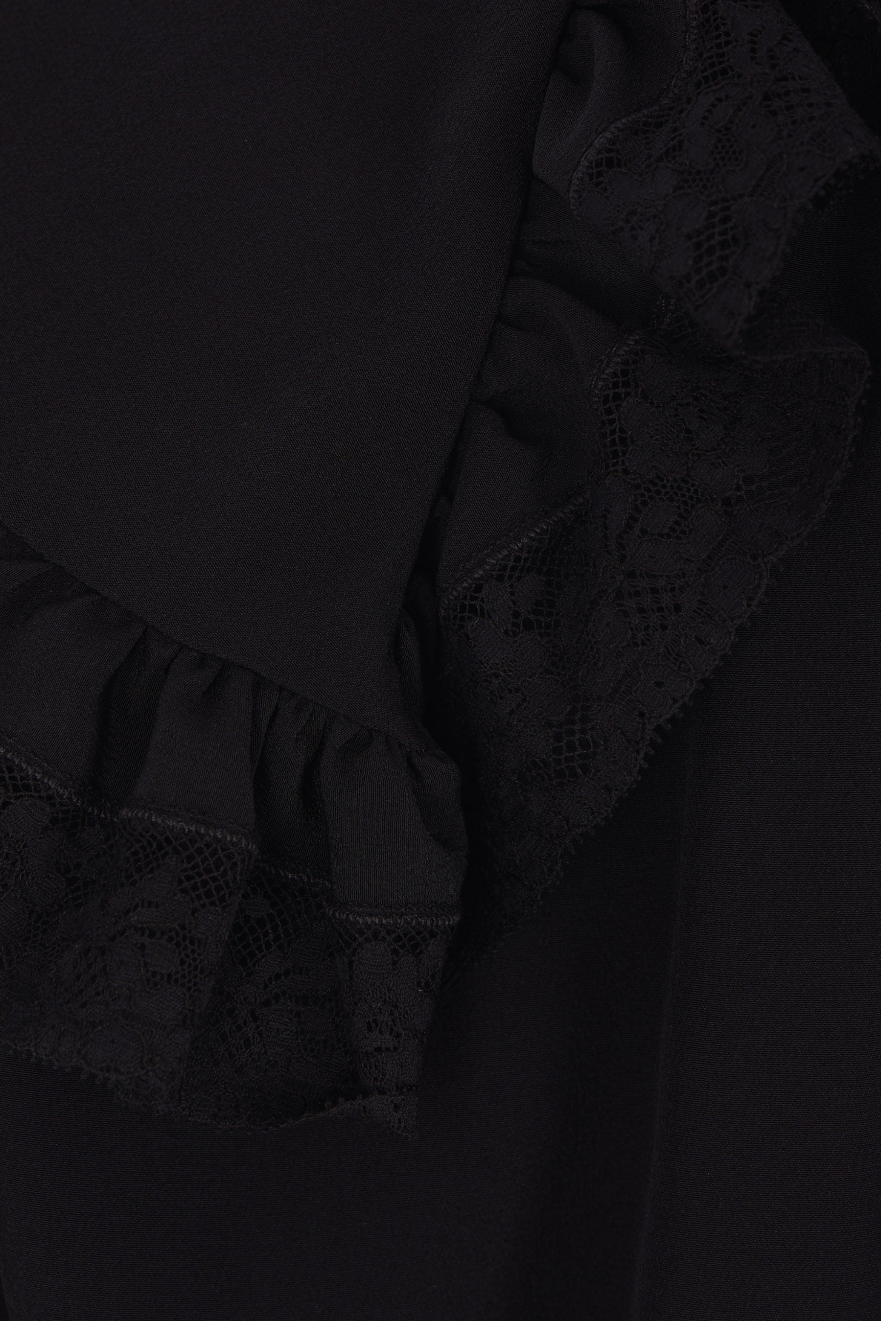 Chloé shirt made of black silk crepe. Features an oversized collar edged with lace, front button closure with tone-on-tone buttons, long sleeves with ruffled cuffs, and a straight hem.