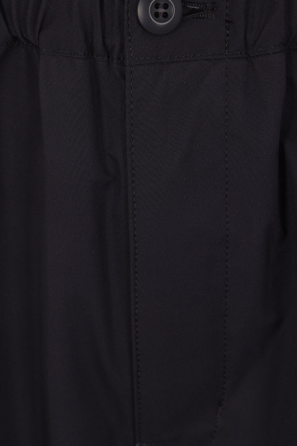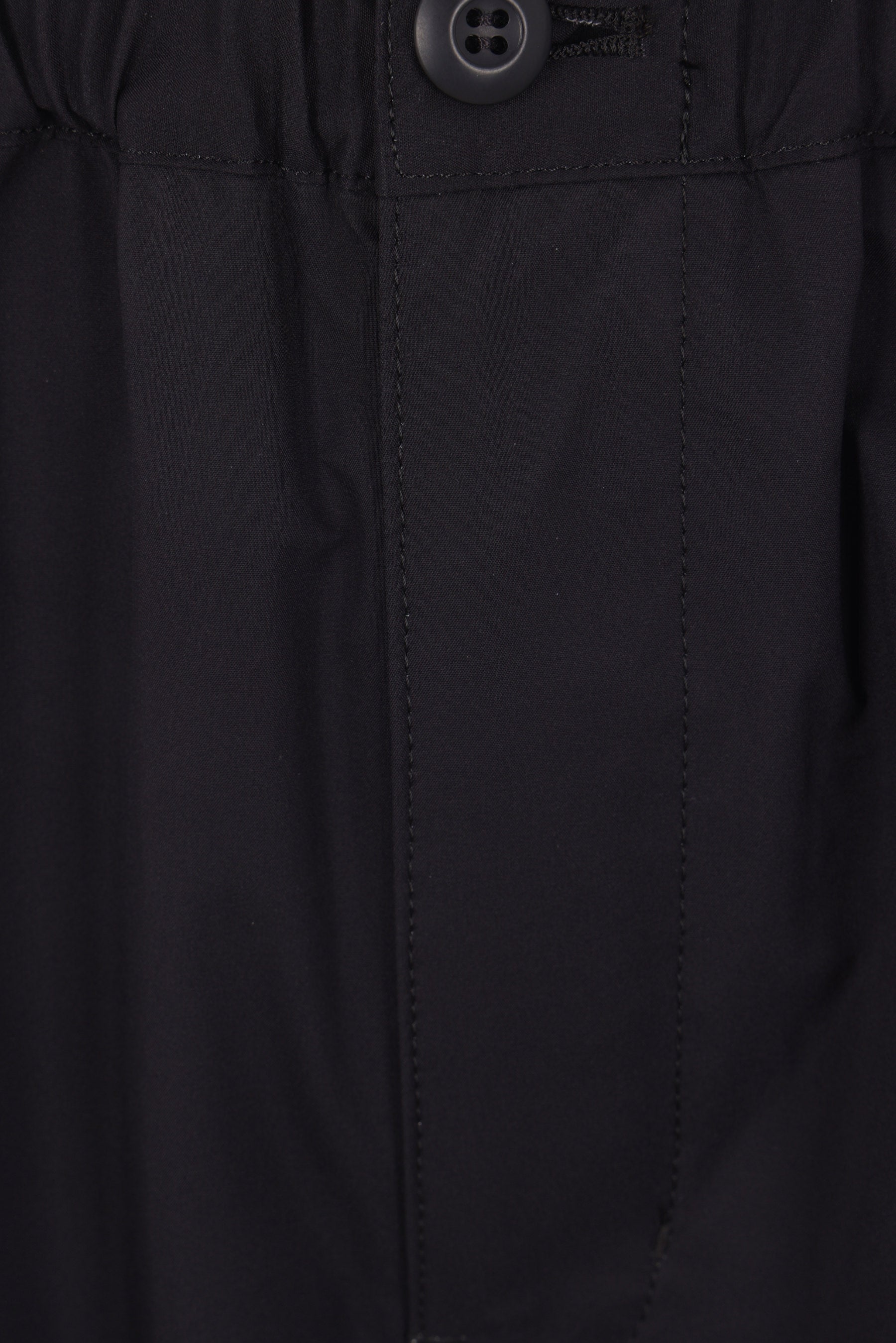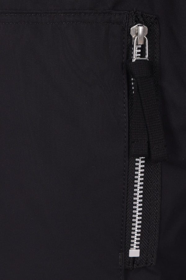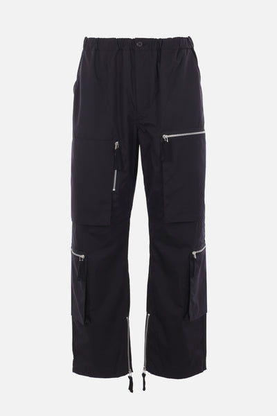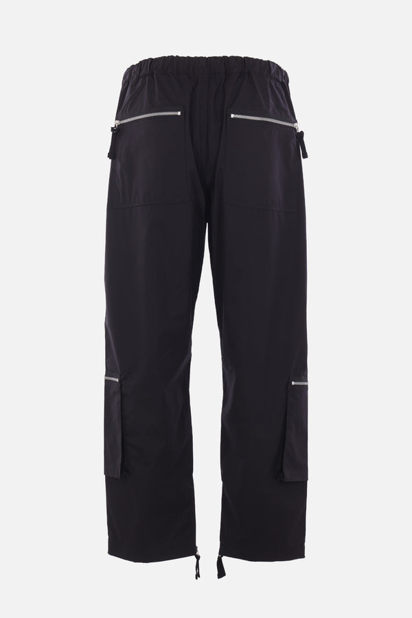 Comme des Garçons Homme cargo trousers made from black nylon. Features elasticated waistband with drawstring, front button and zip closure, multiple pockets, adjustable hem with drawstring, and partially mesh-lined interior.