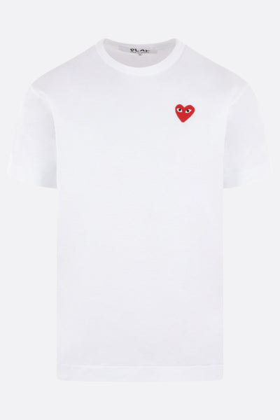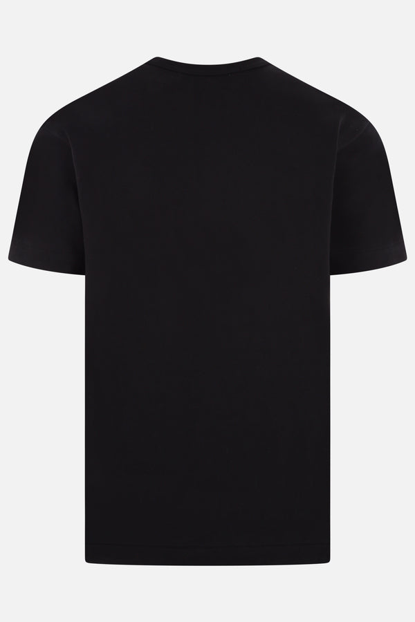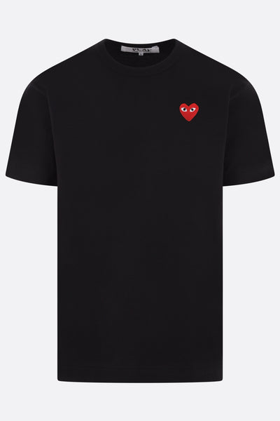 Comme des Garçons Play t-shirt crafted from black cotton jersey, featuring the iconic embroidered Heart patch on the chest. Designed with a crew neckline, short sleeves, and a straight hem.