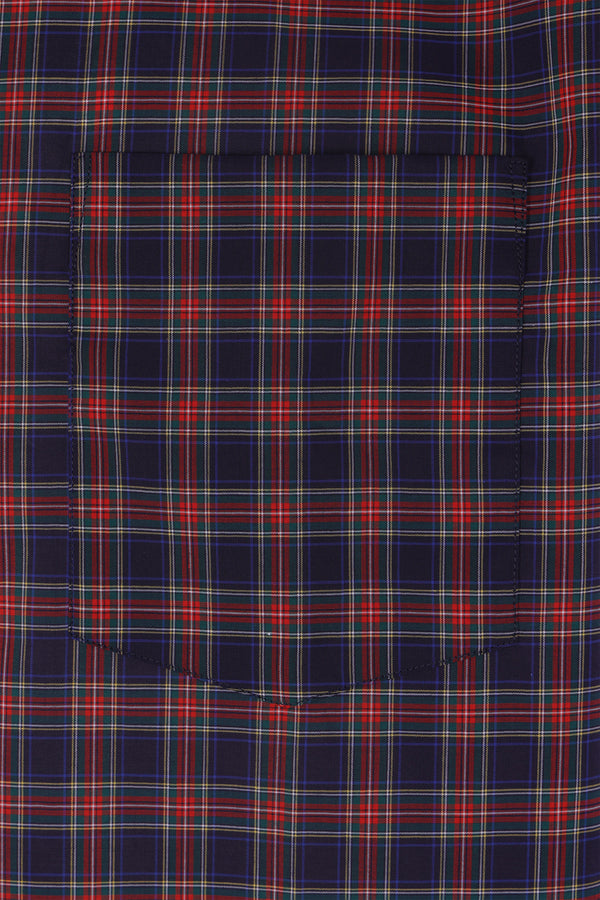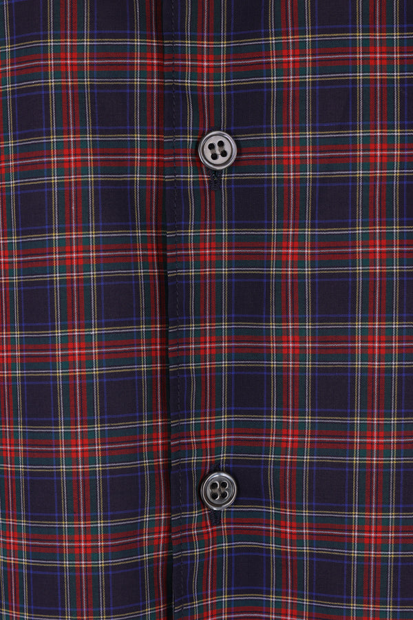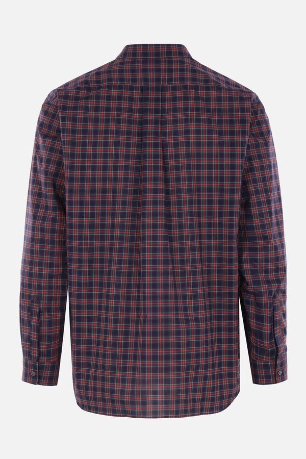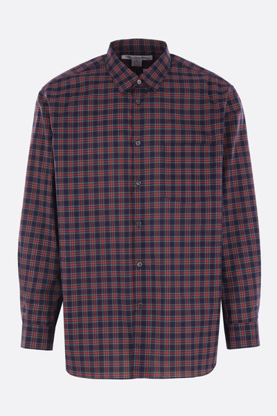 Comme des Garçons Shirt shirt made from blue cotton with multicolor tartan pattern. Features a classic collar, front button closure, chest patch pocket, long sleeves with buttoned cuffs, and rounded hem.