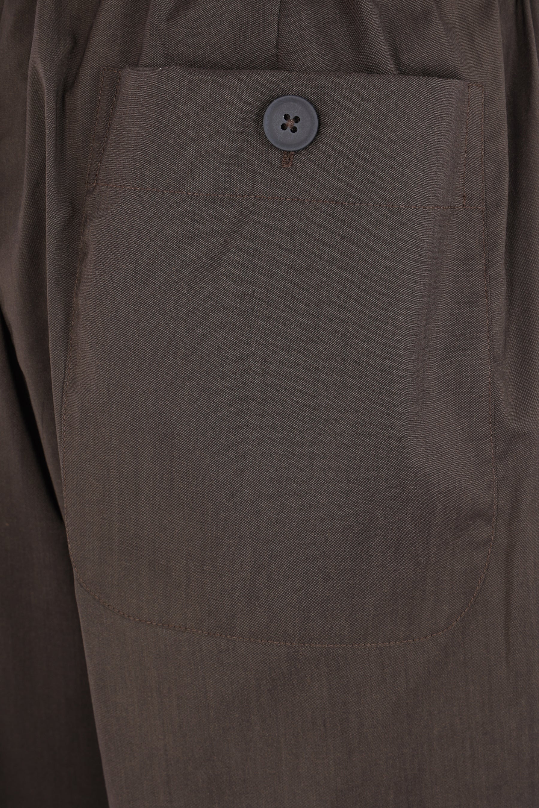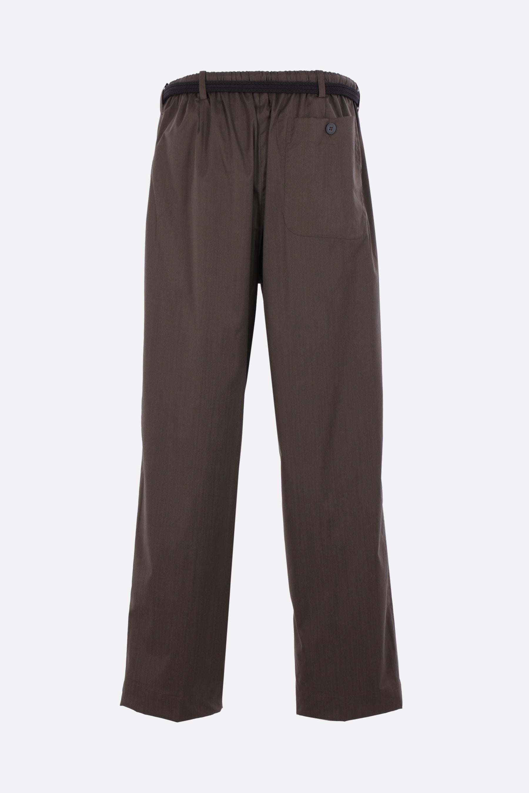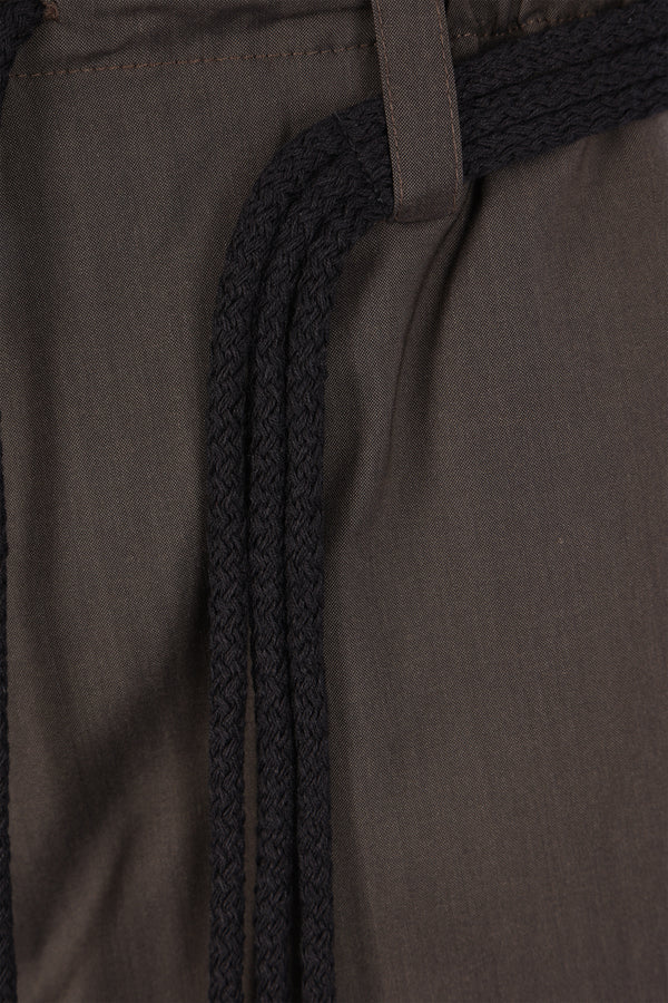 Craig Green worker trousers crafted from brown technical wool. Featuring an elasticated waistband with drawstring, front button/zip closure, belt loops with rope belt, multiple pockets, and unlined interior.