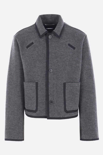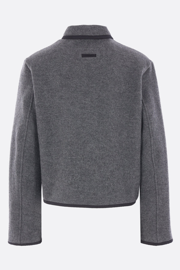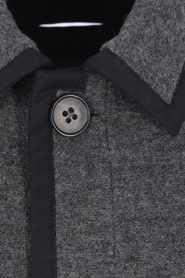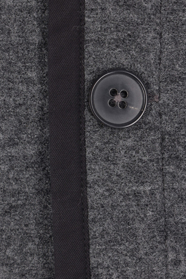 Diomene jacket crafted from dark grey boiled wool with contrast piping. Featuring a pointed collar, button closure, multiple pockets, long sleeves, and a straight hem. Unlined interior.