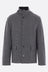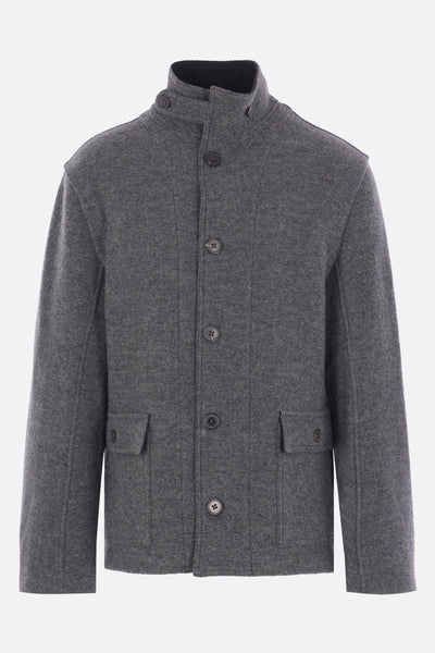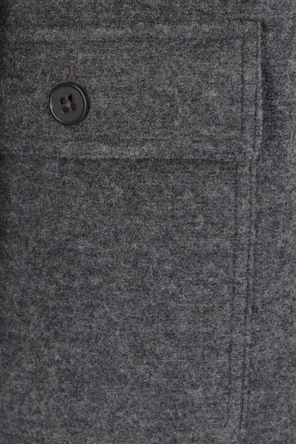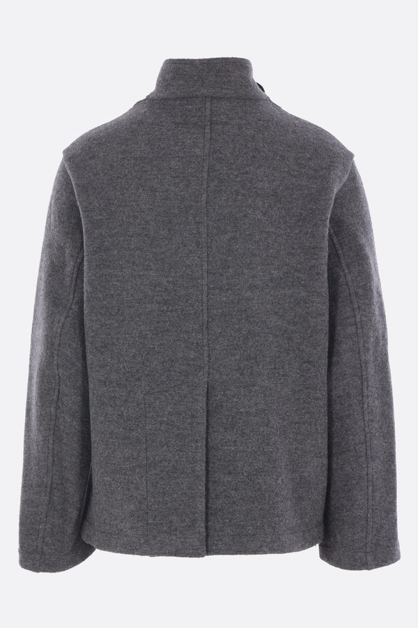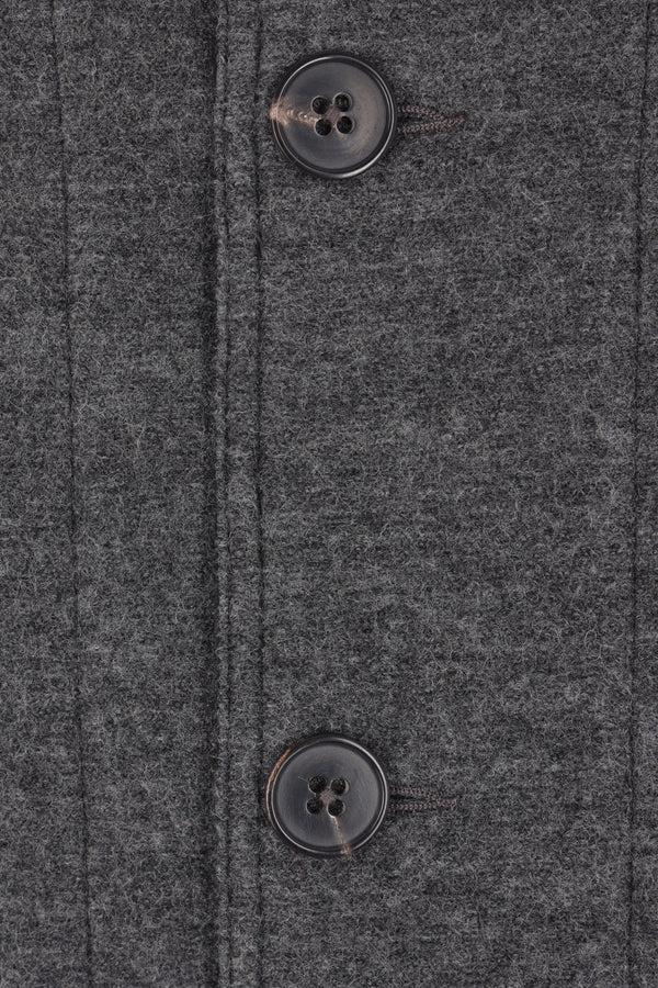 Diomene jacket made from dark grey boiled wool. Features a high collar, button closure, flap pockets, long sleeves, and straight hem with central vent. Unlined interior.