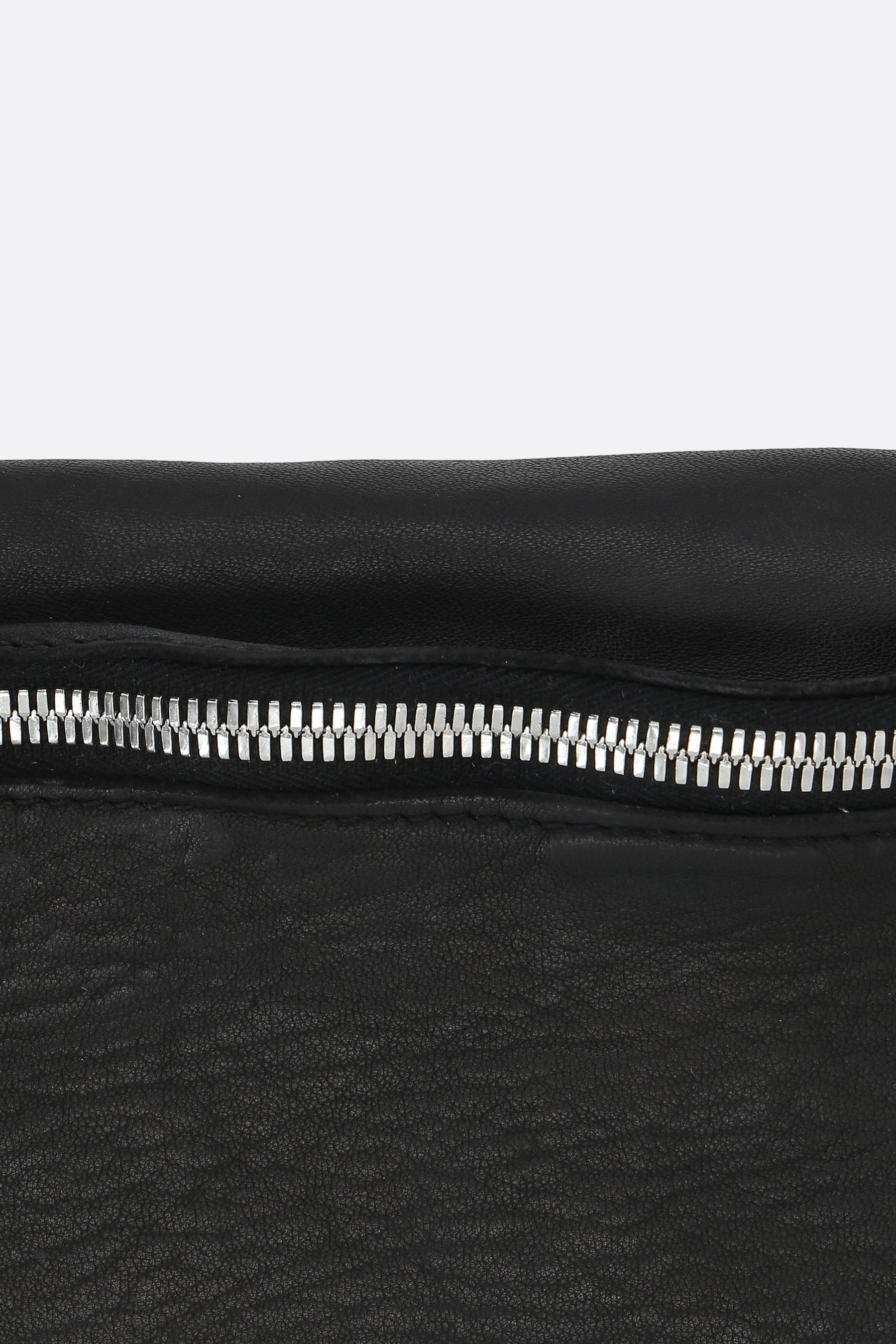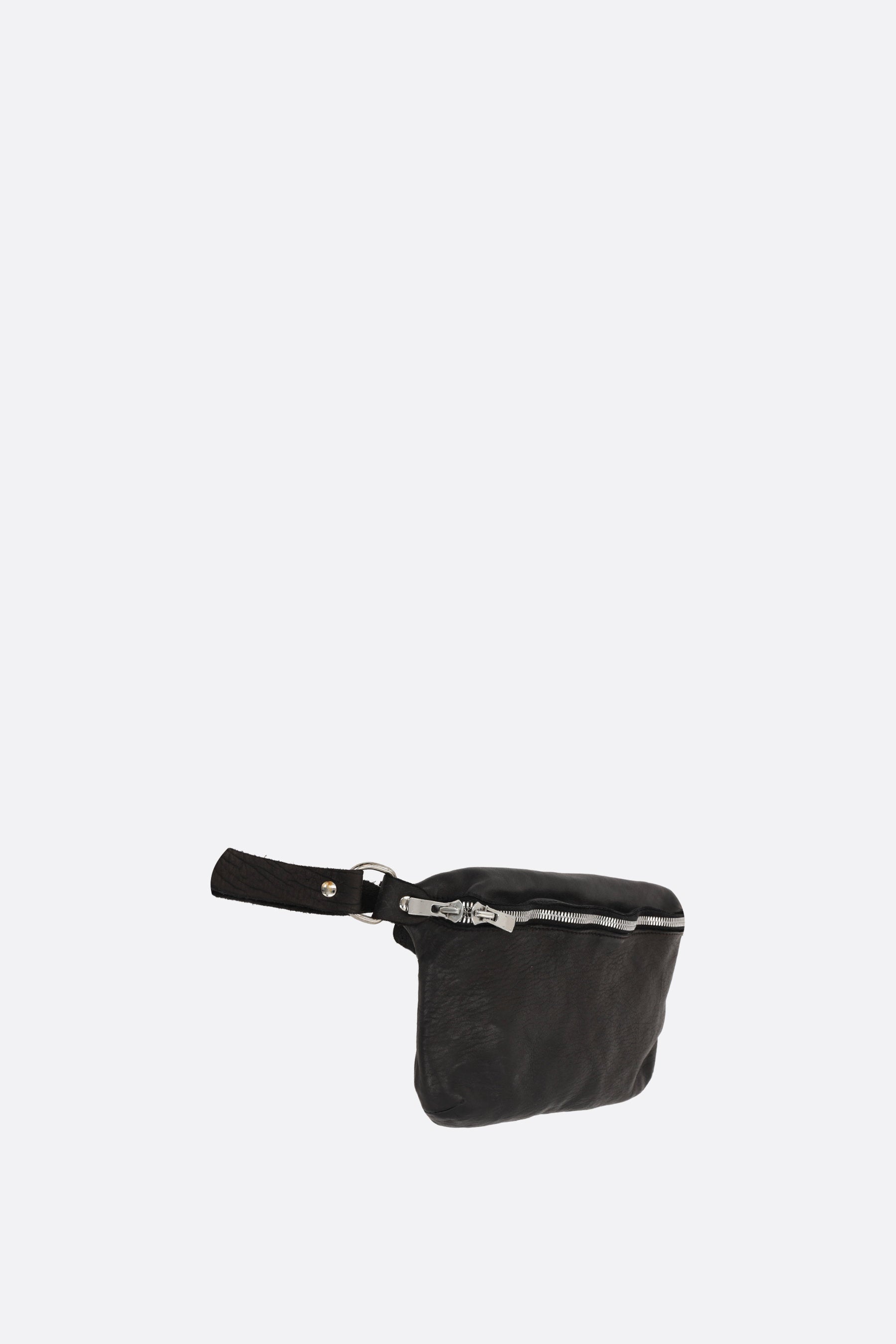 Guidi belt bag made of lightly grained black leather. Featuring antique silver-tone hardware, a front closure with a double-slider zipper, and an adjustable belt with a metal buckle. The interior is lined in black suede.