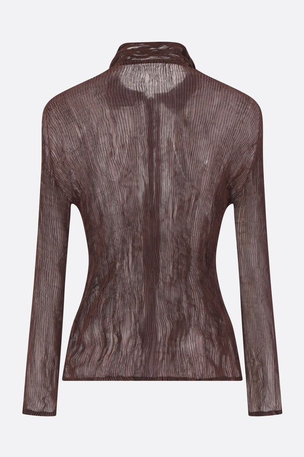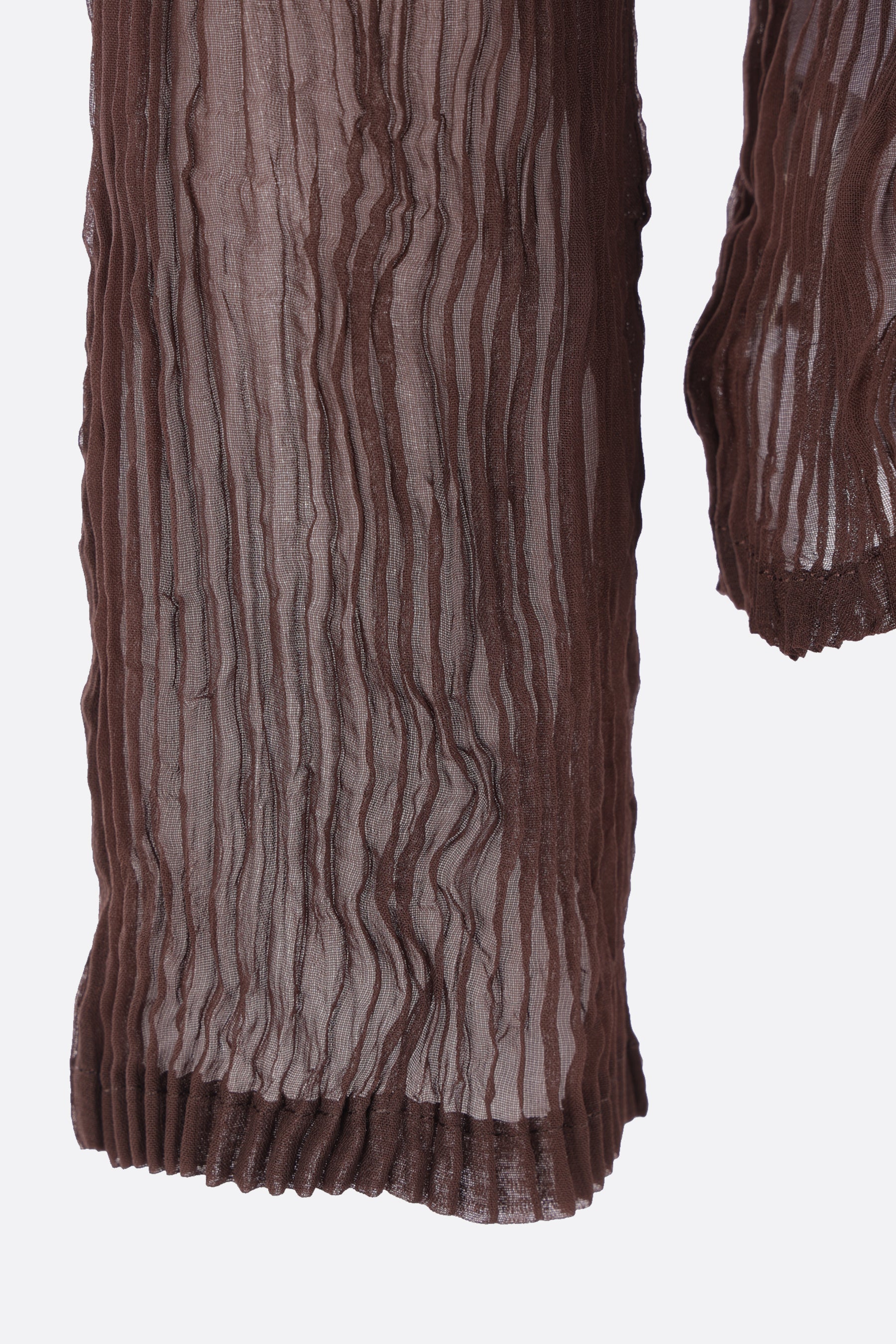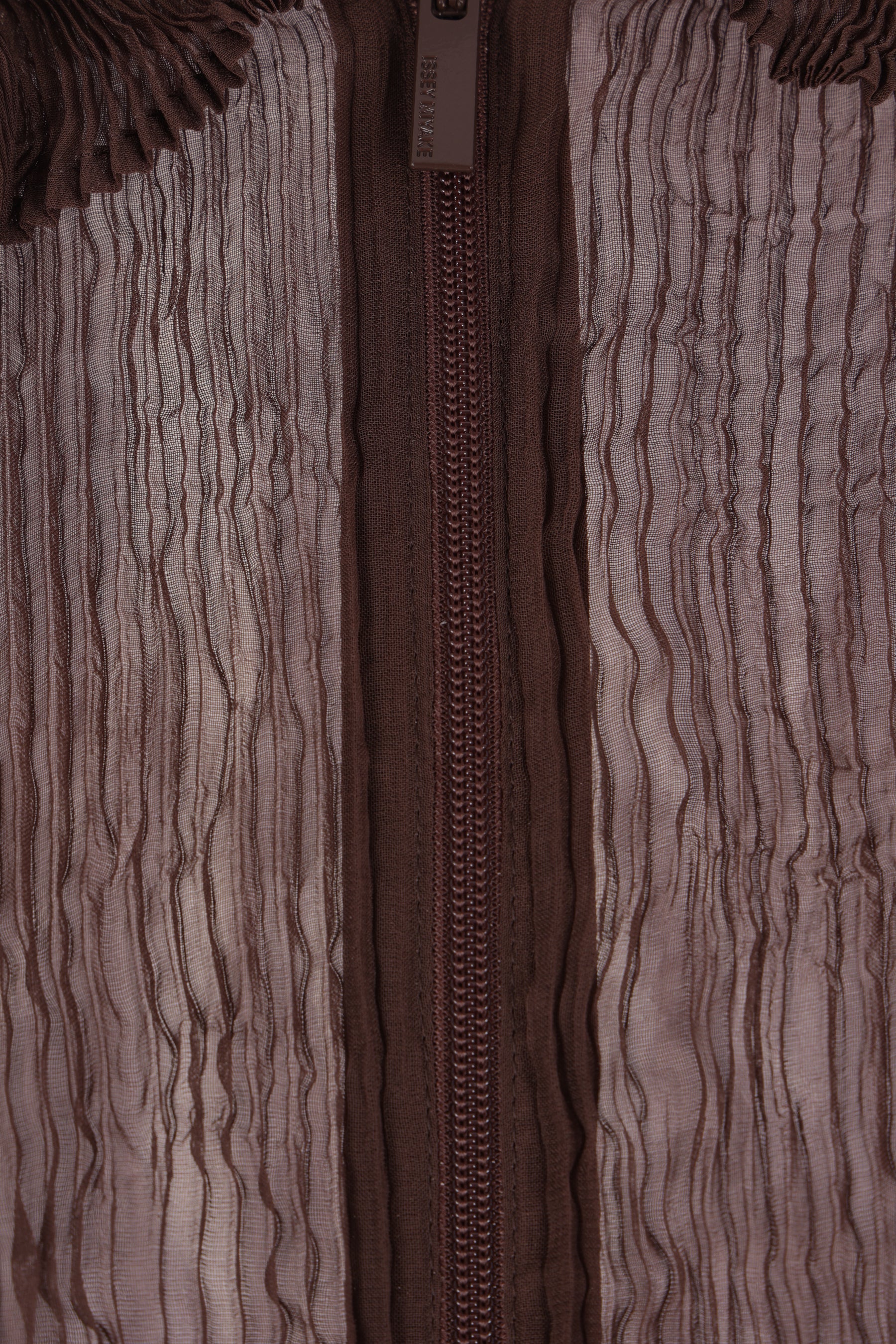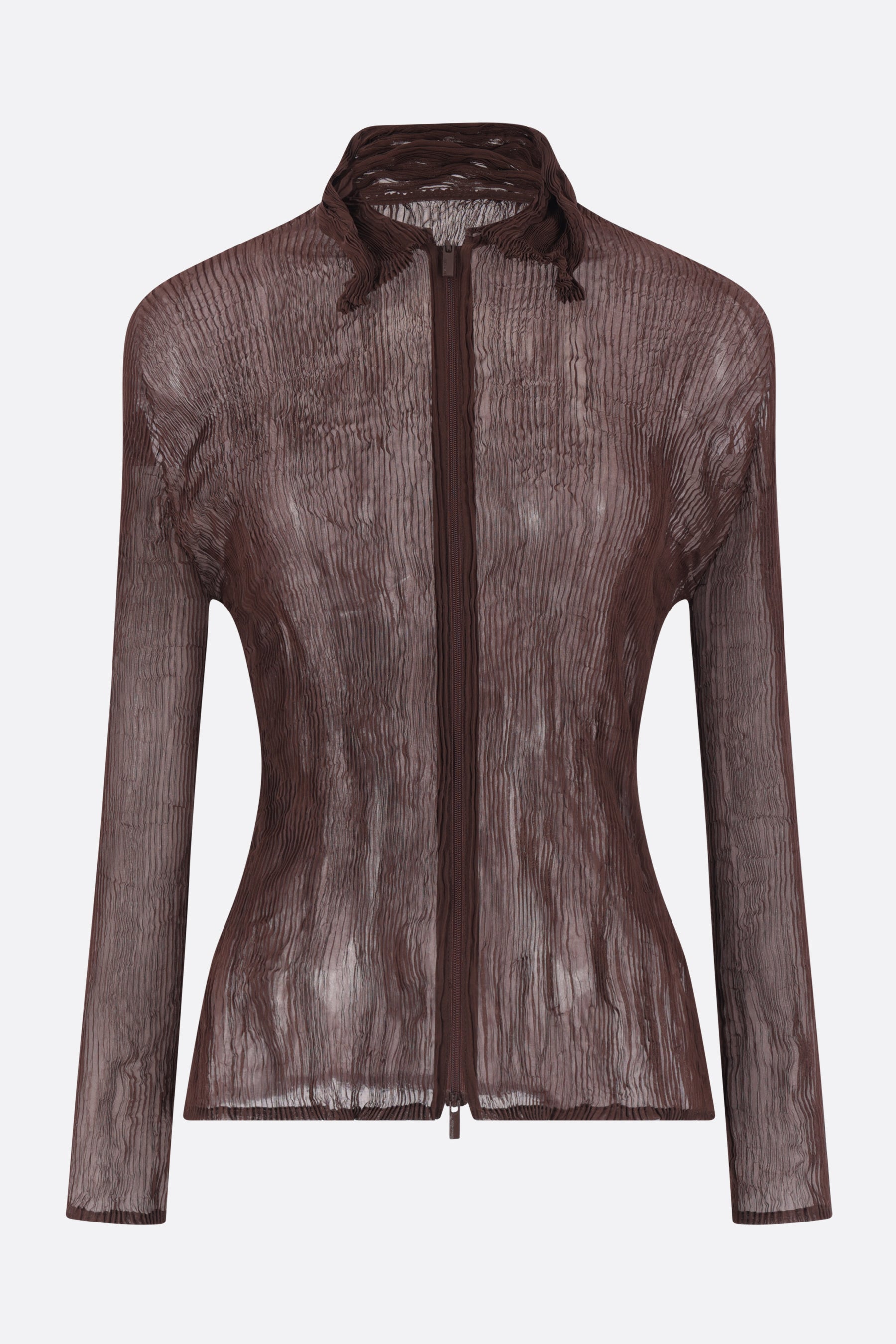 Issey Miyake blouse crafted from brown pleated chiffon. Featuring a pointed collar, front double-slider zip closure, long sleeves, and a straight hem.