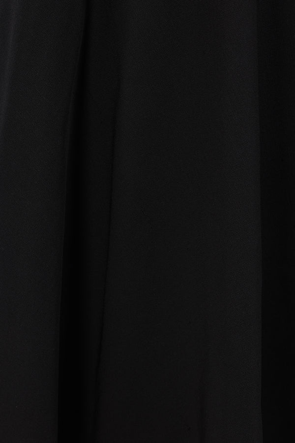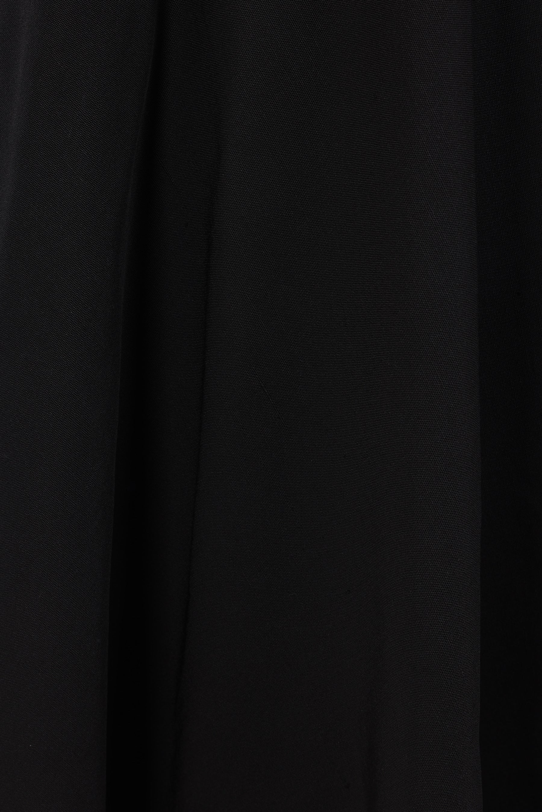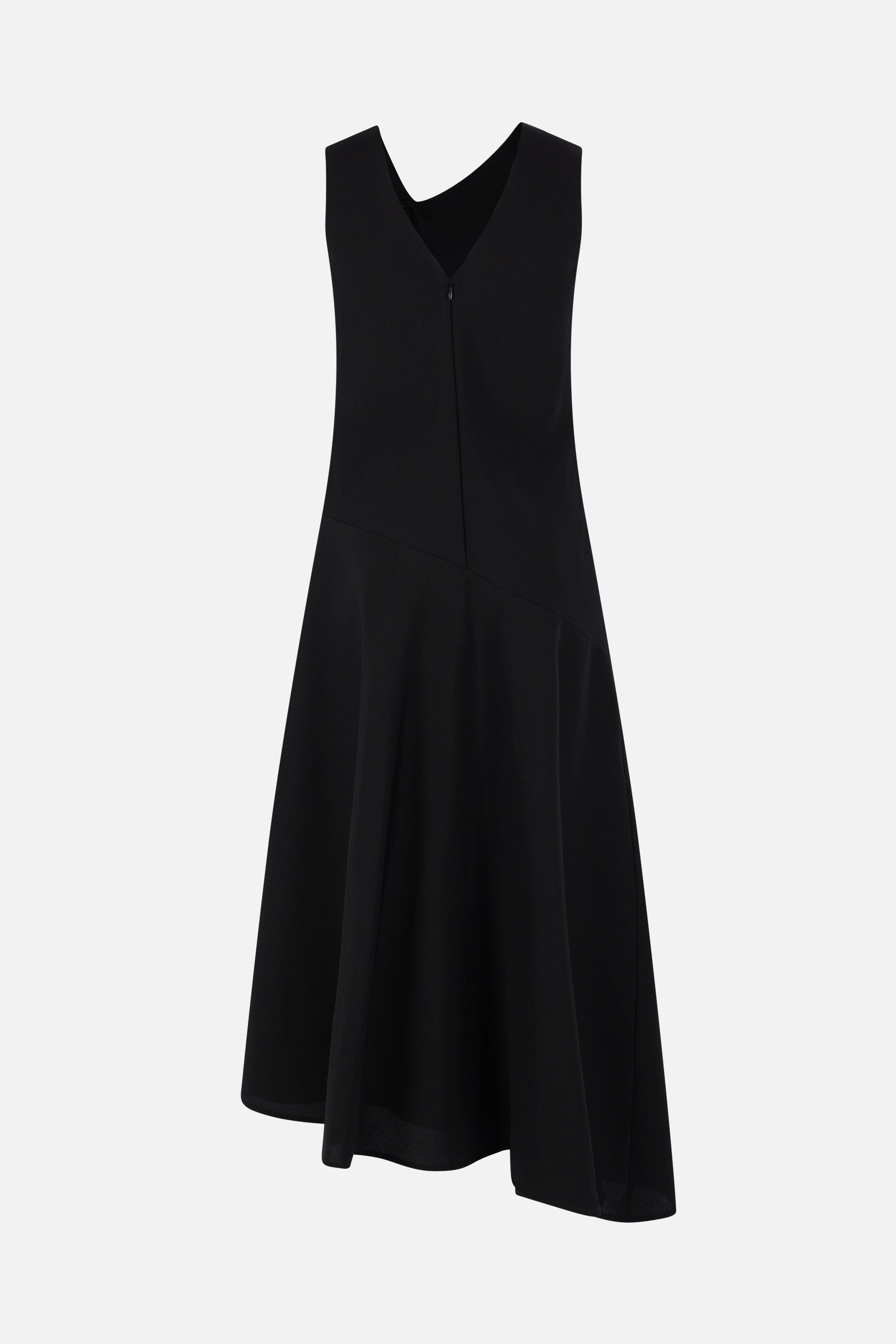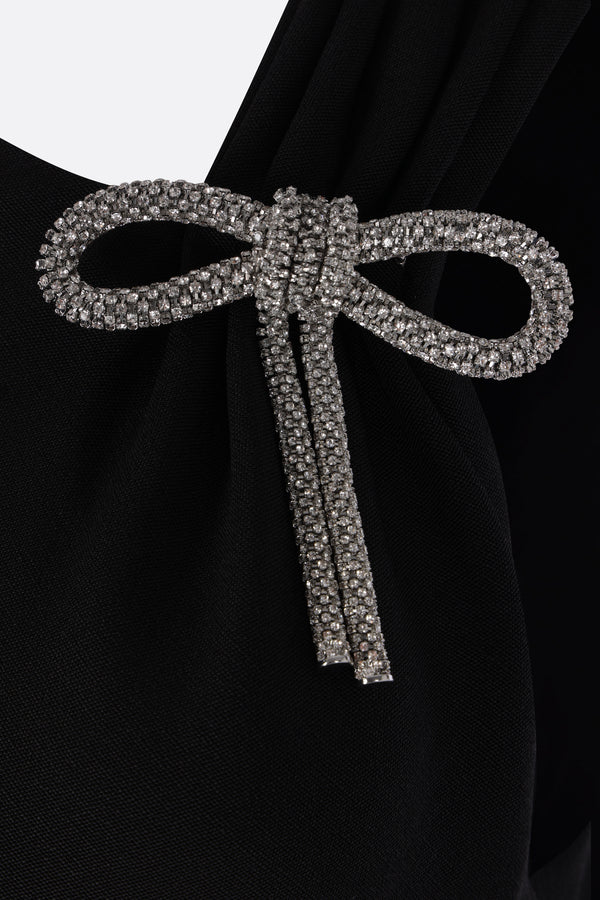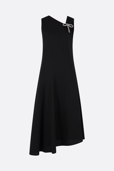 Jil Sander sleeveless dress crafted in black silk blend, featuring a removable jeweled bow on the shoulder. It has an asymmetric neckline, central back zip with a V opening, pleated detail on one shoulder, and a flared skirt with an asymmetric hem. Fully lined interior.