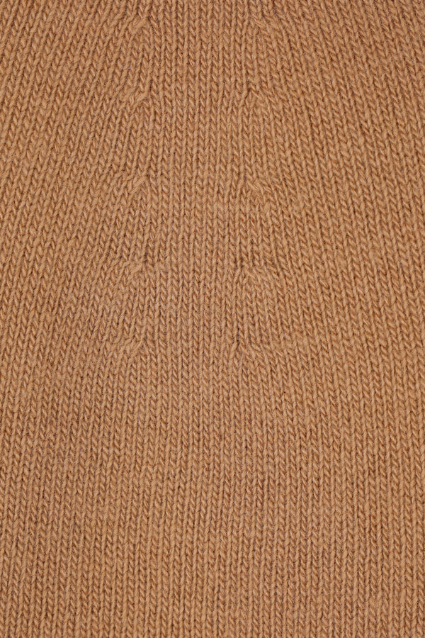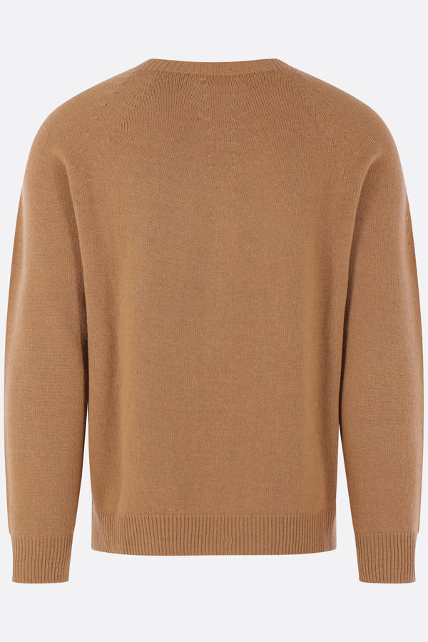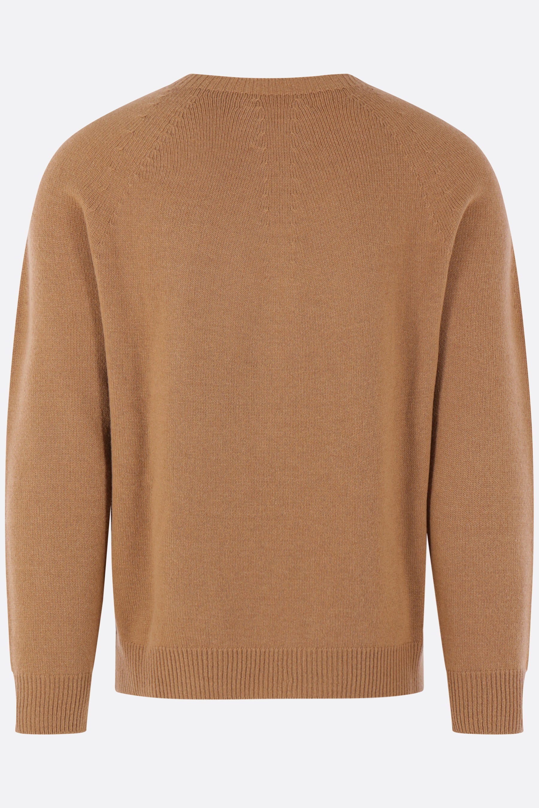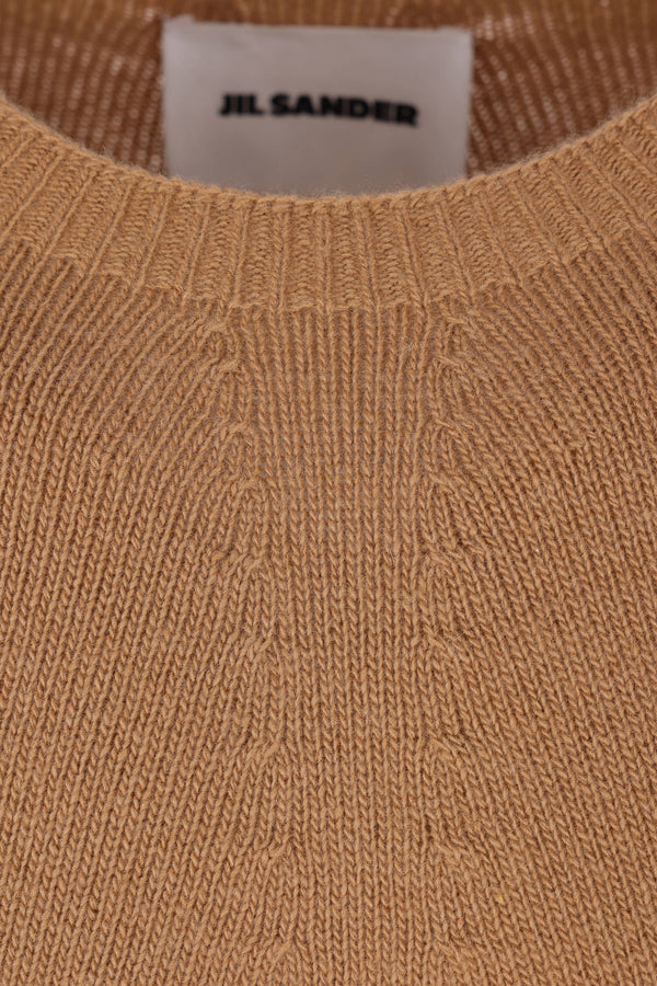 Jil Sander sweater crafted in camel-colored wool and cashmere knit. It features a round neckline, long raglan sleeves, and ribbed edges.