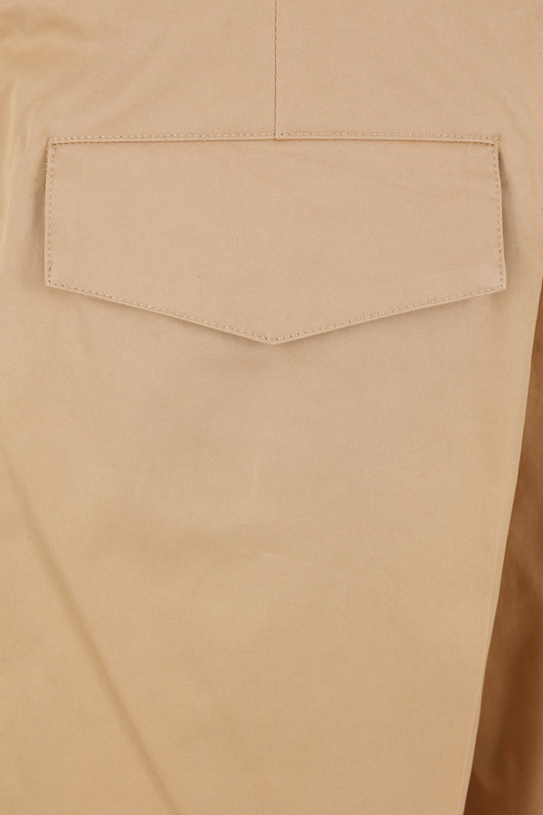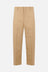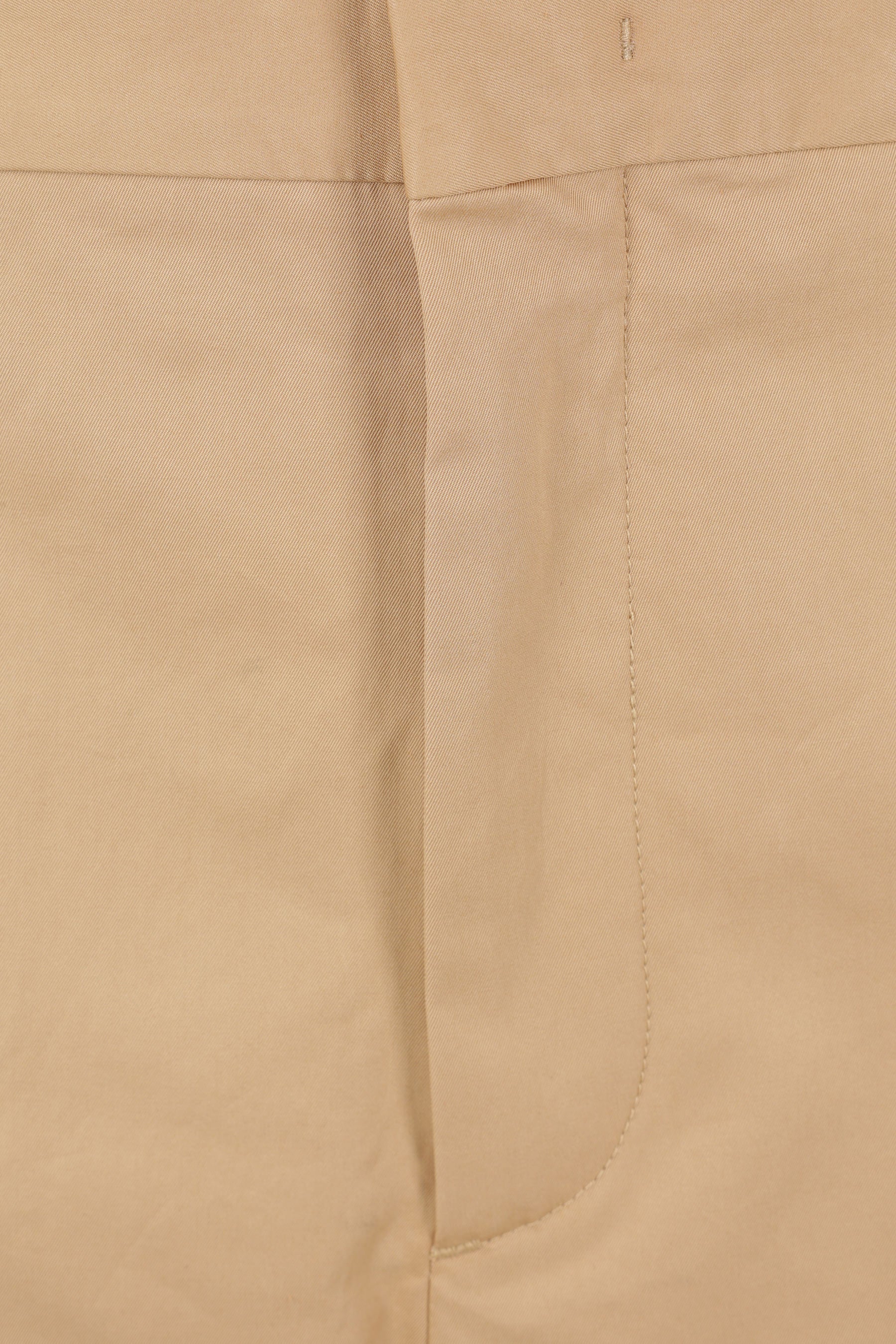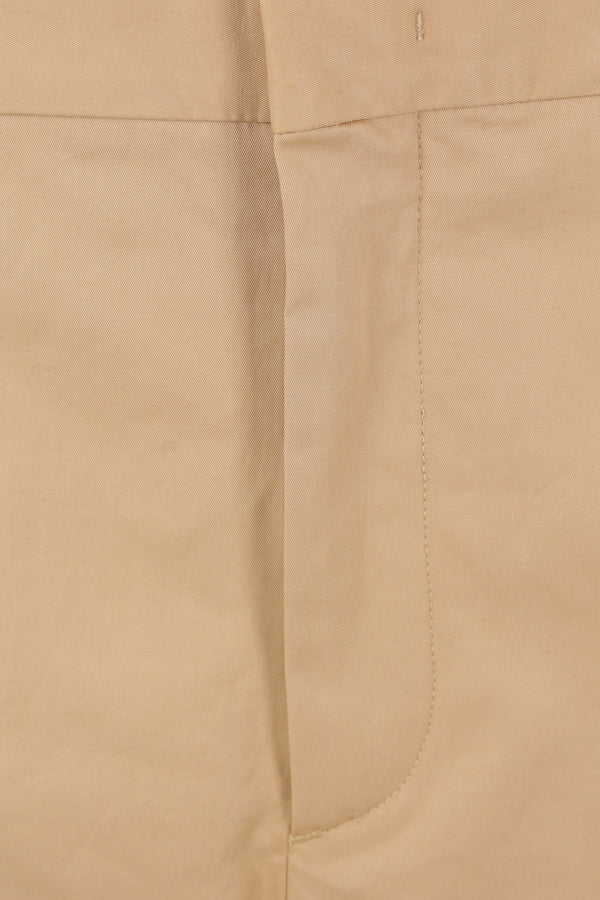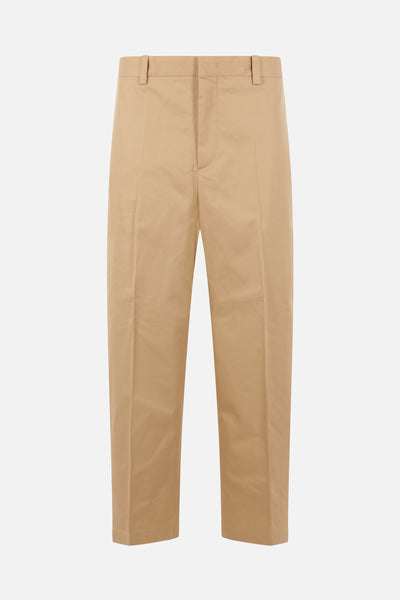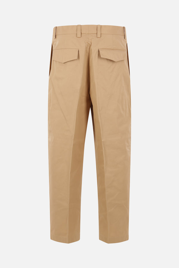 Jil Sander relaxed-fit trousers crafted in beige cotton twill. They feature a front hook/button/zip closure, belt loops, multiple pockets, and a center crease.