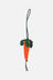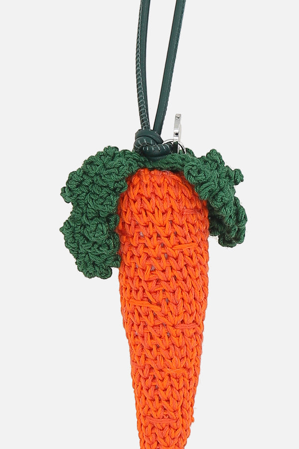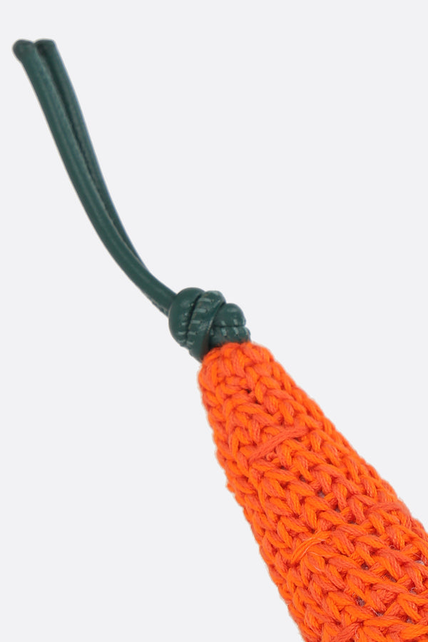 JW Anderson carrot-shaped bag charm crafted in cotton crochet, featuring a green leather strap and a silver-tone metal logo medallion.