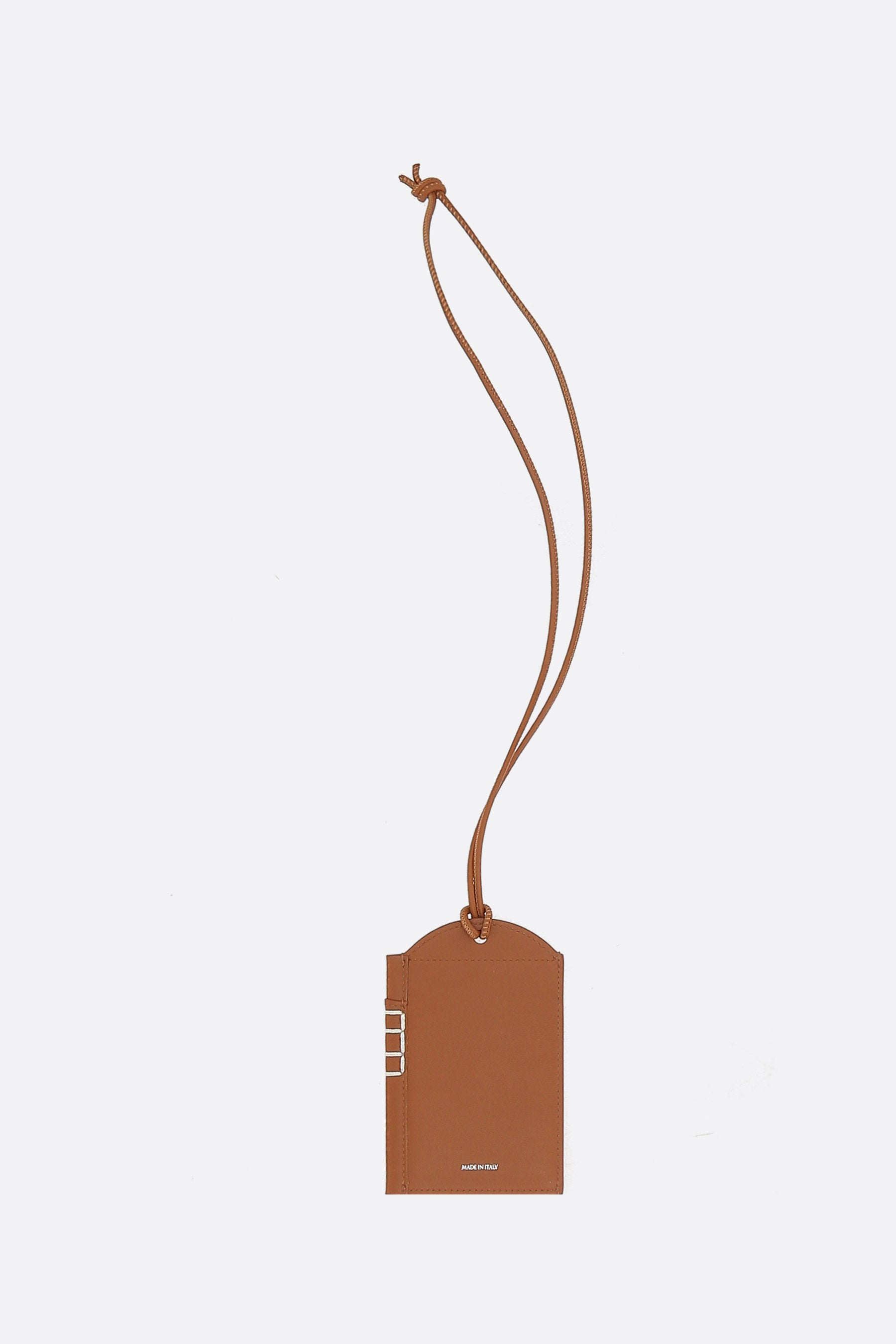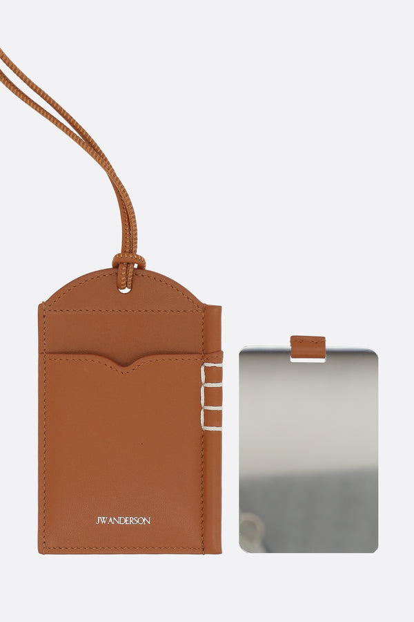JW Anderson mirror case charm crafted from smooth tan leather with embossed logo lettering on the front and a tie strap.