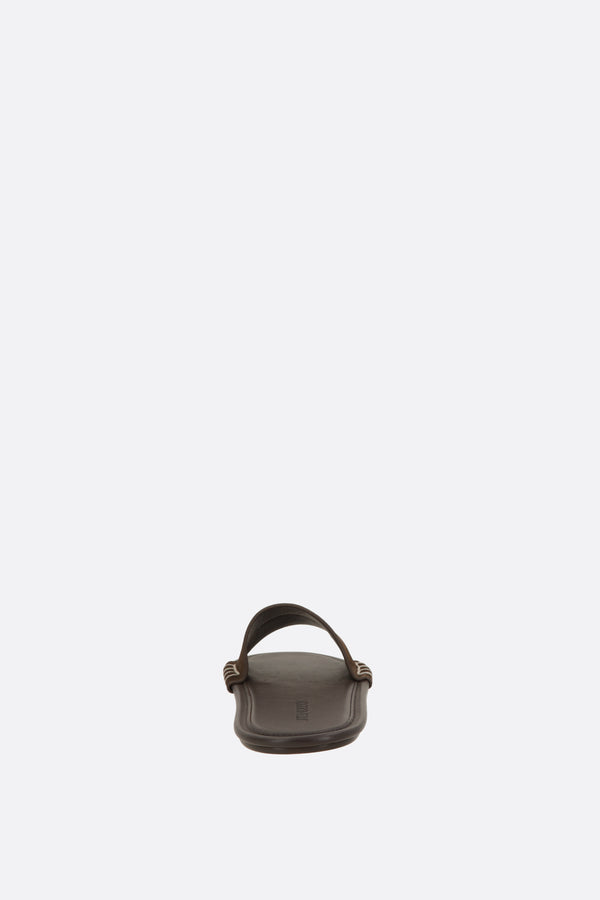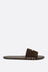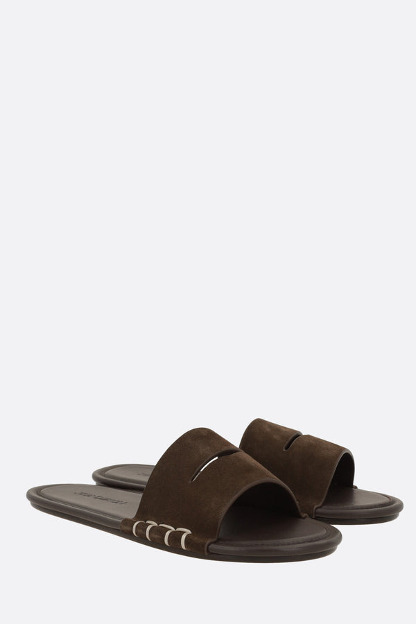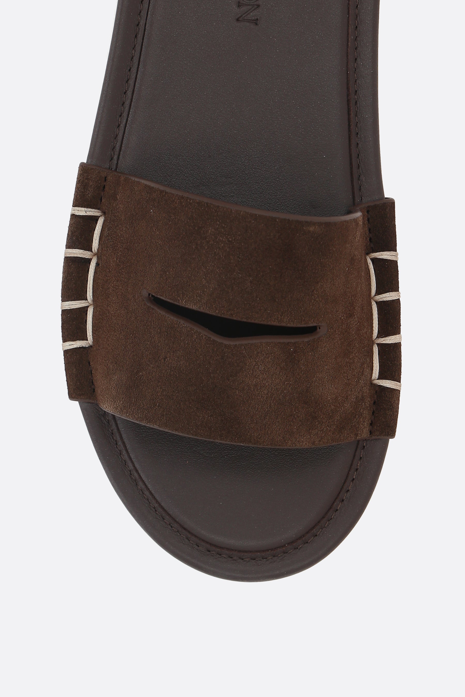 JW Anderson slide sandals made of brown suede with contrast stitching in a loafer style. Featuring a rounded toe, leather linings, and a leather sole.