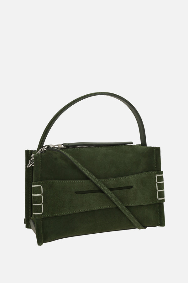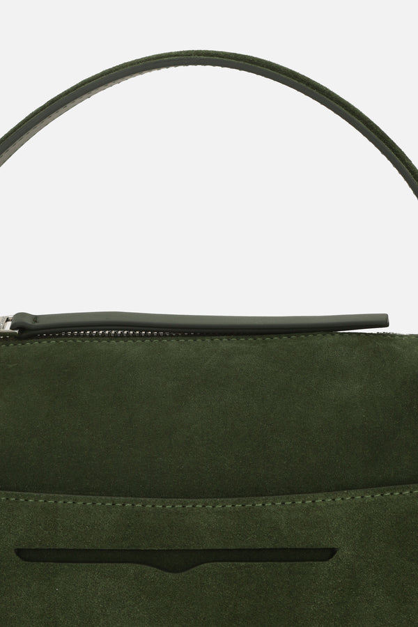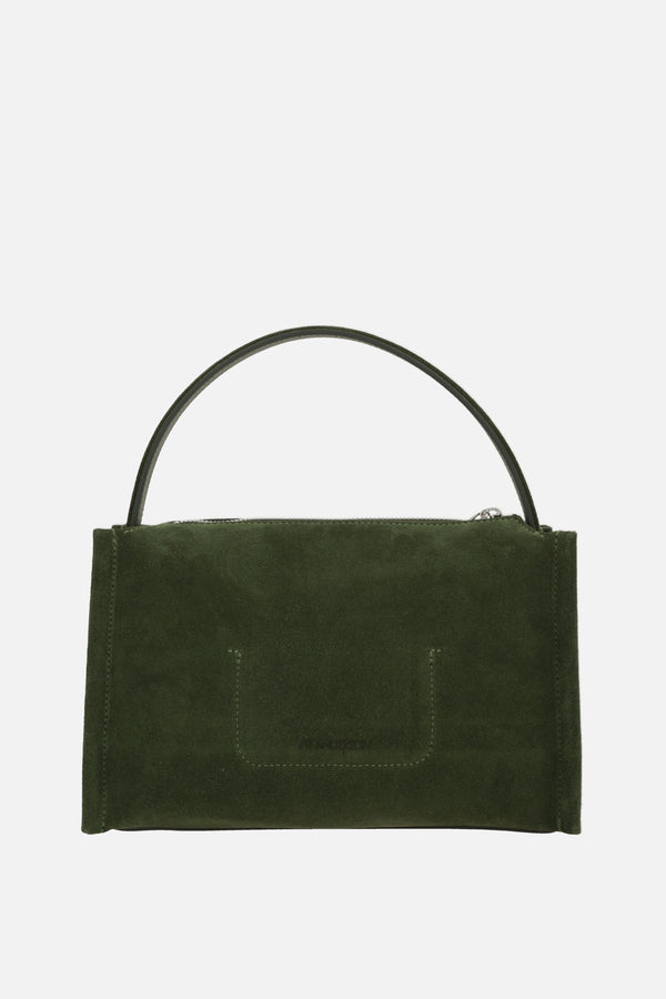 JW Anderson handbag crafted from khaki green suede with a loafer-style front band. Featuring silver-tone hardware, zip closure, top handle, and adjustable/removable shoulder strap. The tone-on-tone leather-lined interior includes a card slot. The design is completed with an embossed logo lettering on the back.