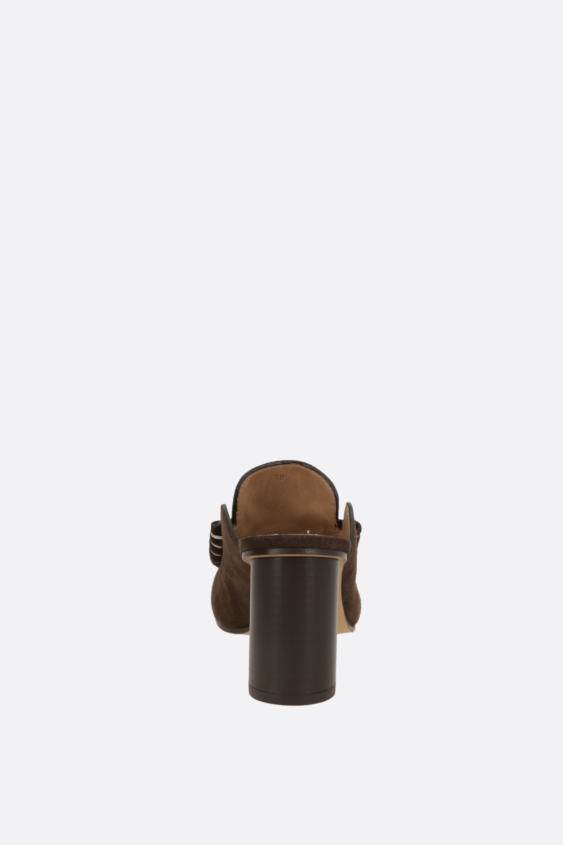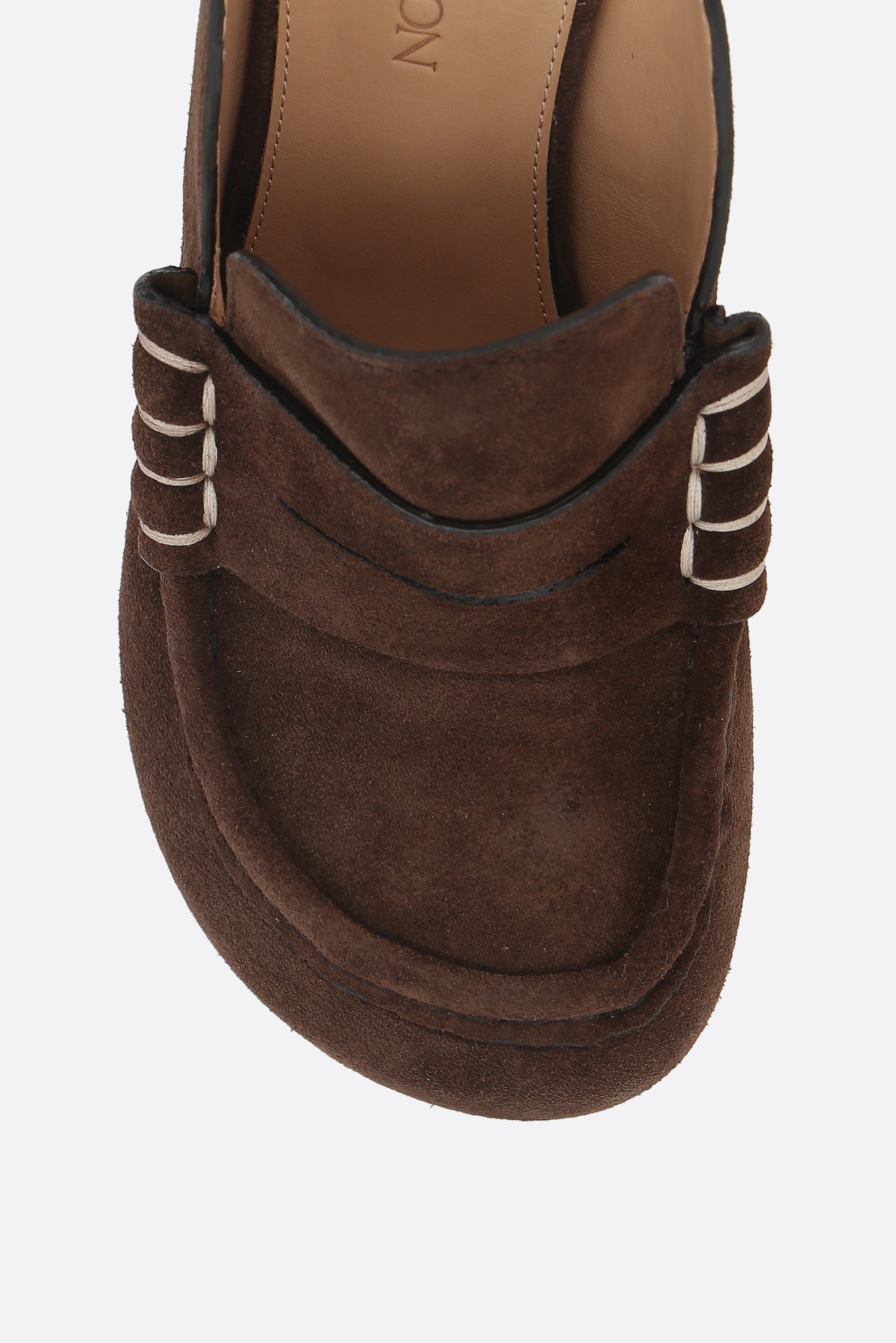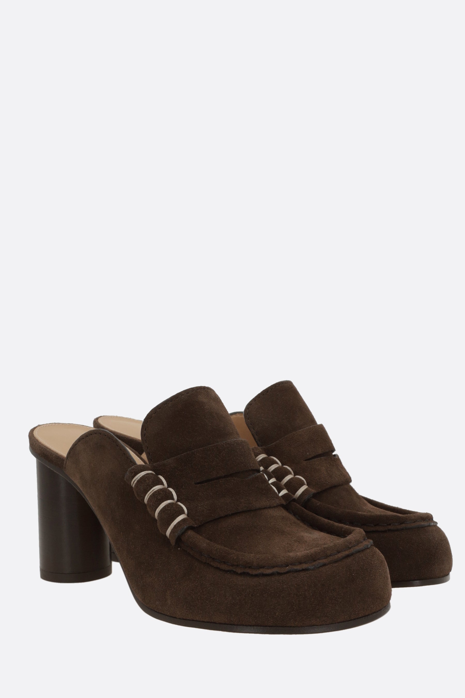 JW Anderson mules made of brown suede with contrast stitching in a laofer style. Featuring a rounded toe, leather linings, and a leather sole. The design is completed with a round wooden heel.
