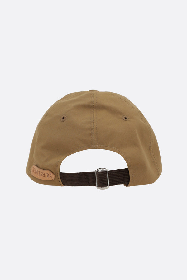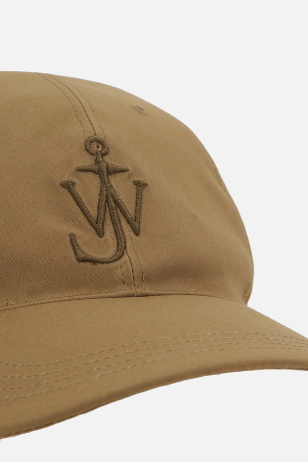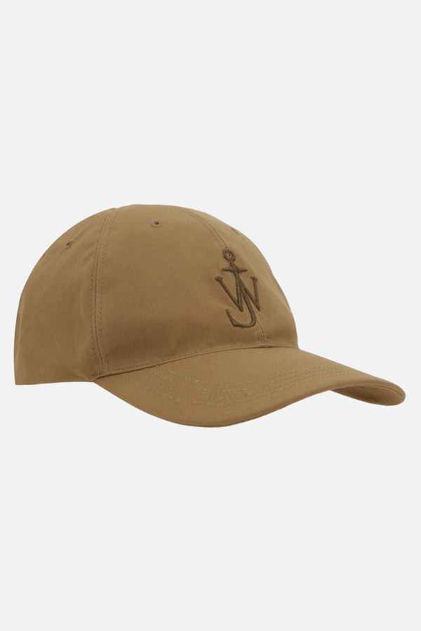 JW Anderson baseball cap crafted from beige coated cotton with tone-on-tone JW Anchor embroidery. Featuring an adjustable rear strap with metal buckle, leather logo patch, and tartan-patterned twill lining.