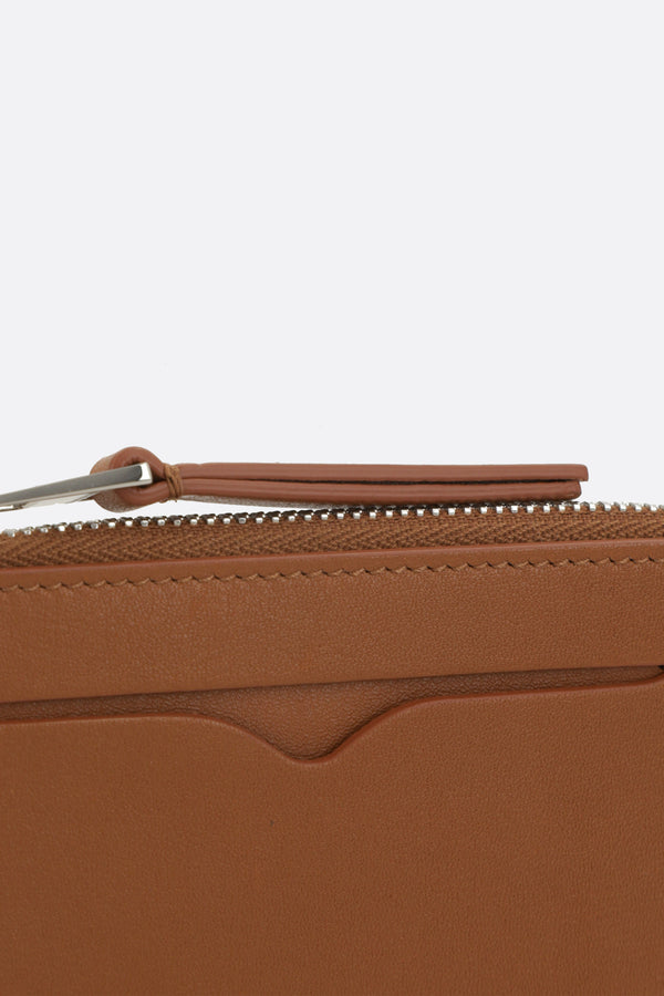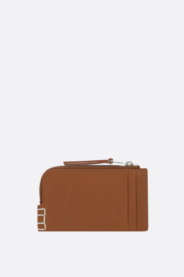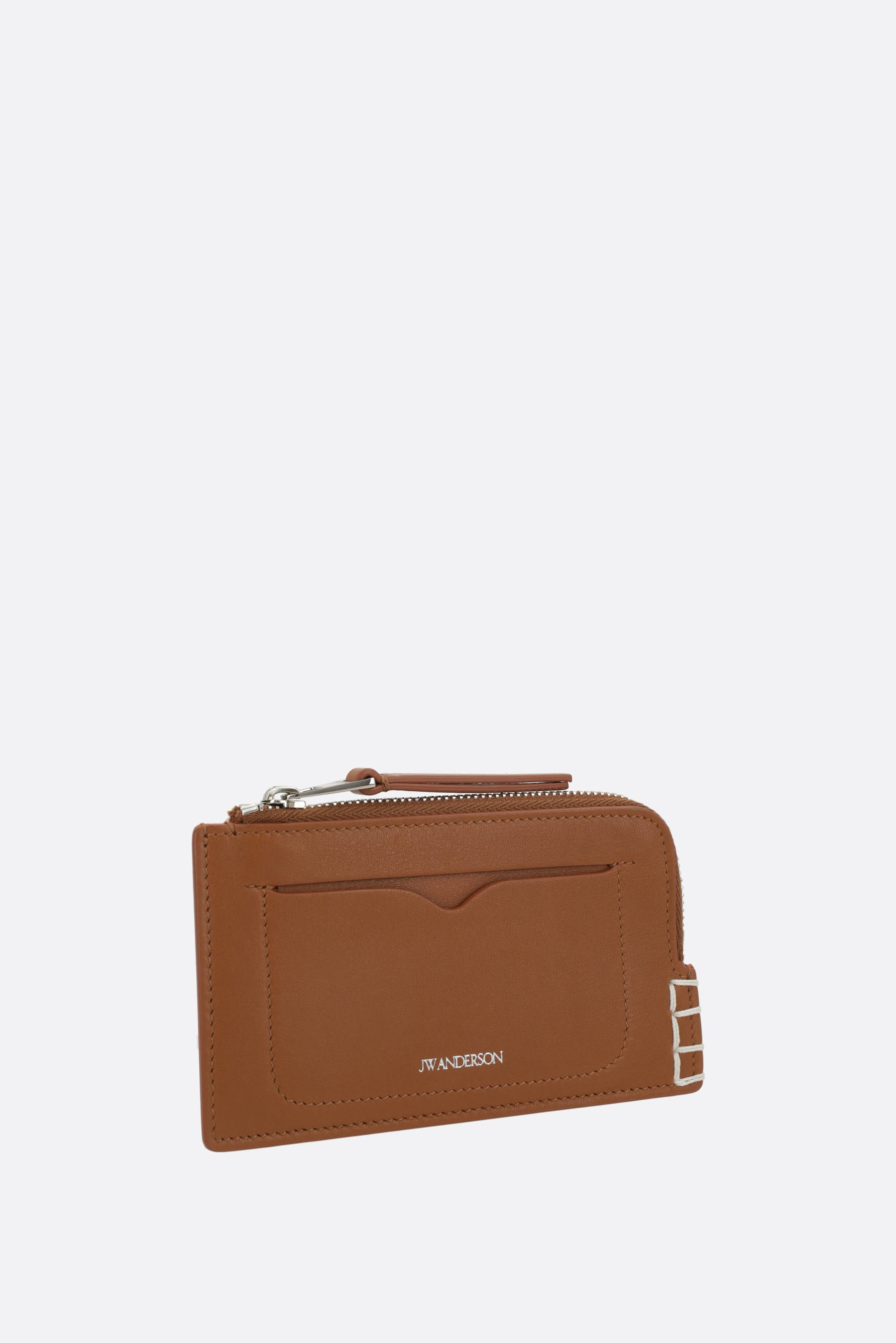 JW Anderson credit card holder crafted from smooth tan leather with embossed logo lettering on the front. Featuring silver-tone hardware, zip coin pocket, and three card slots. The interior is lined with leather and fabric.