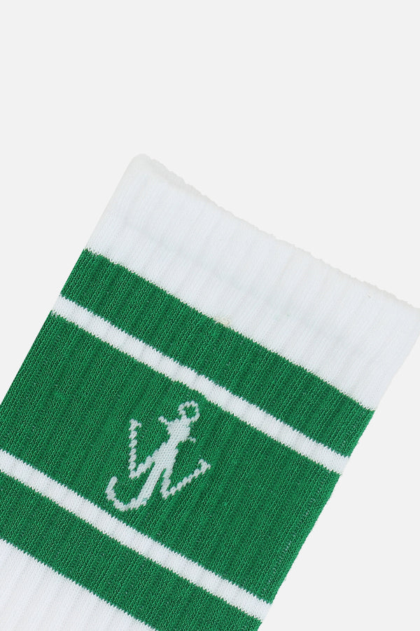 JW Anderson socks crafted in white cotton blend with contrasting green stripes and JW Anchor logo.
