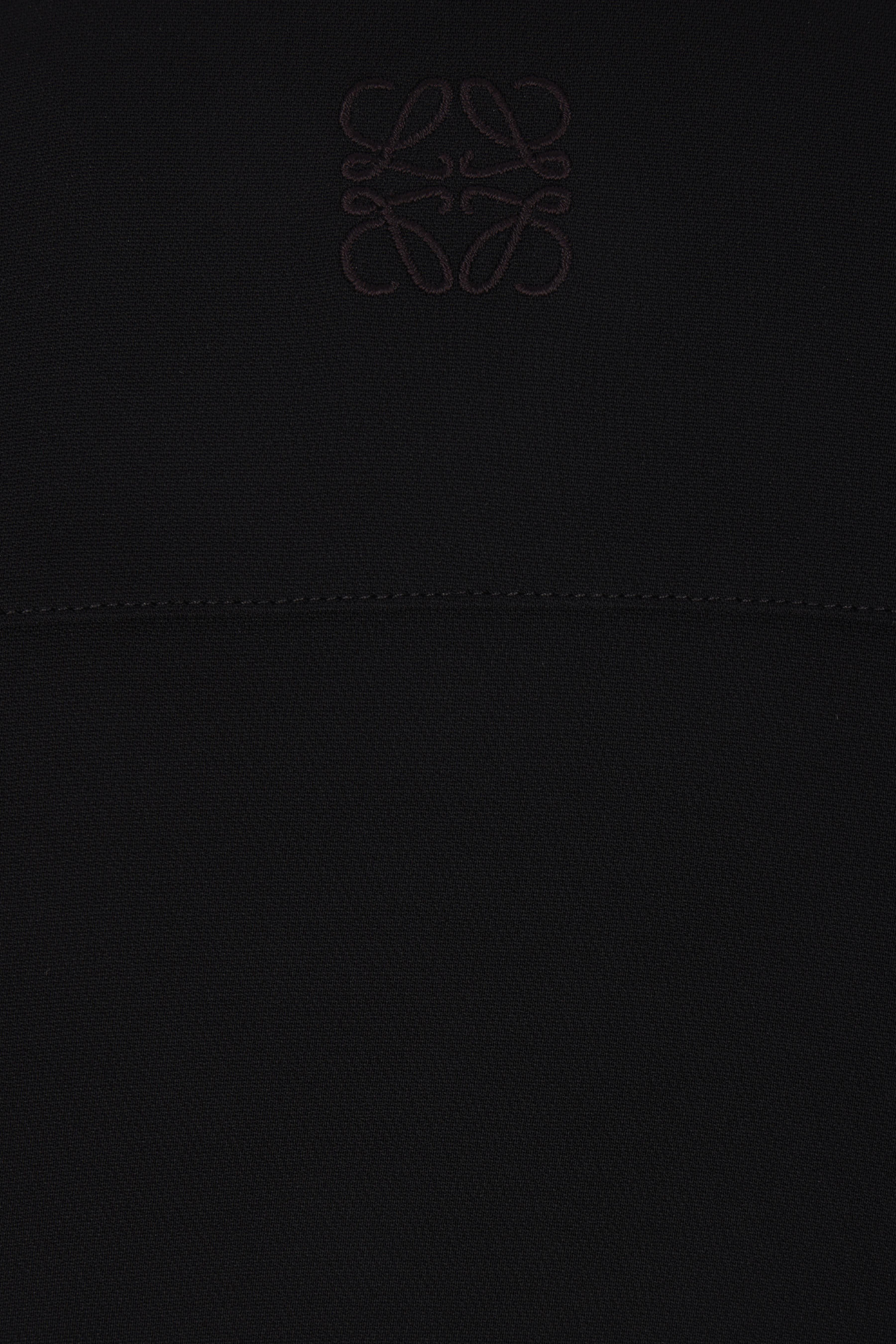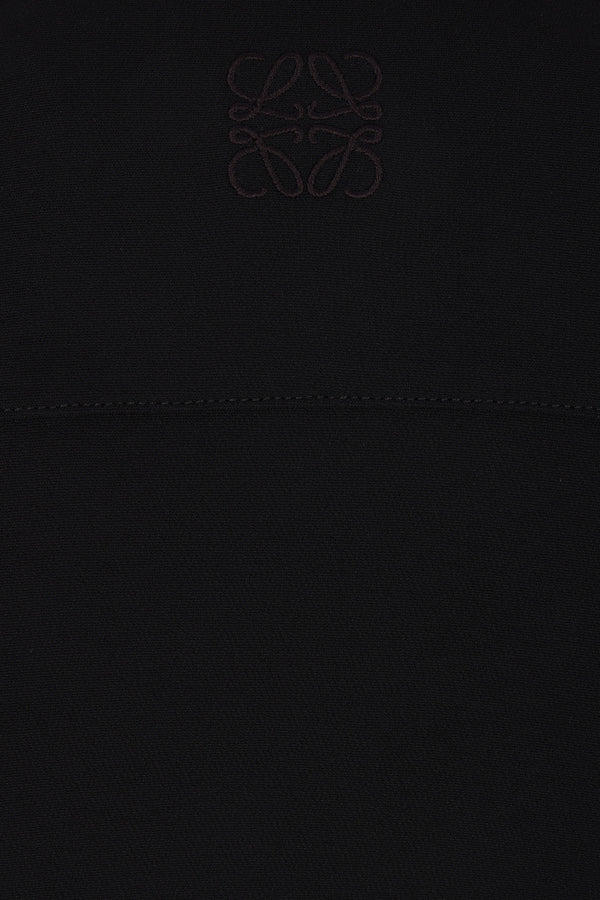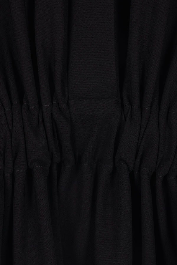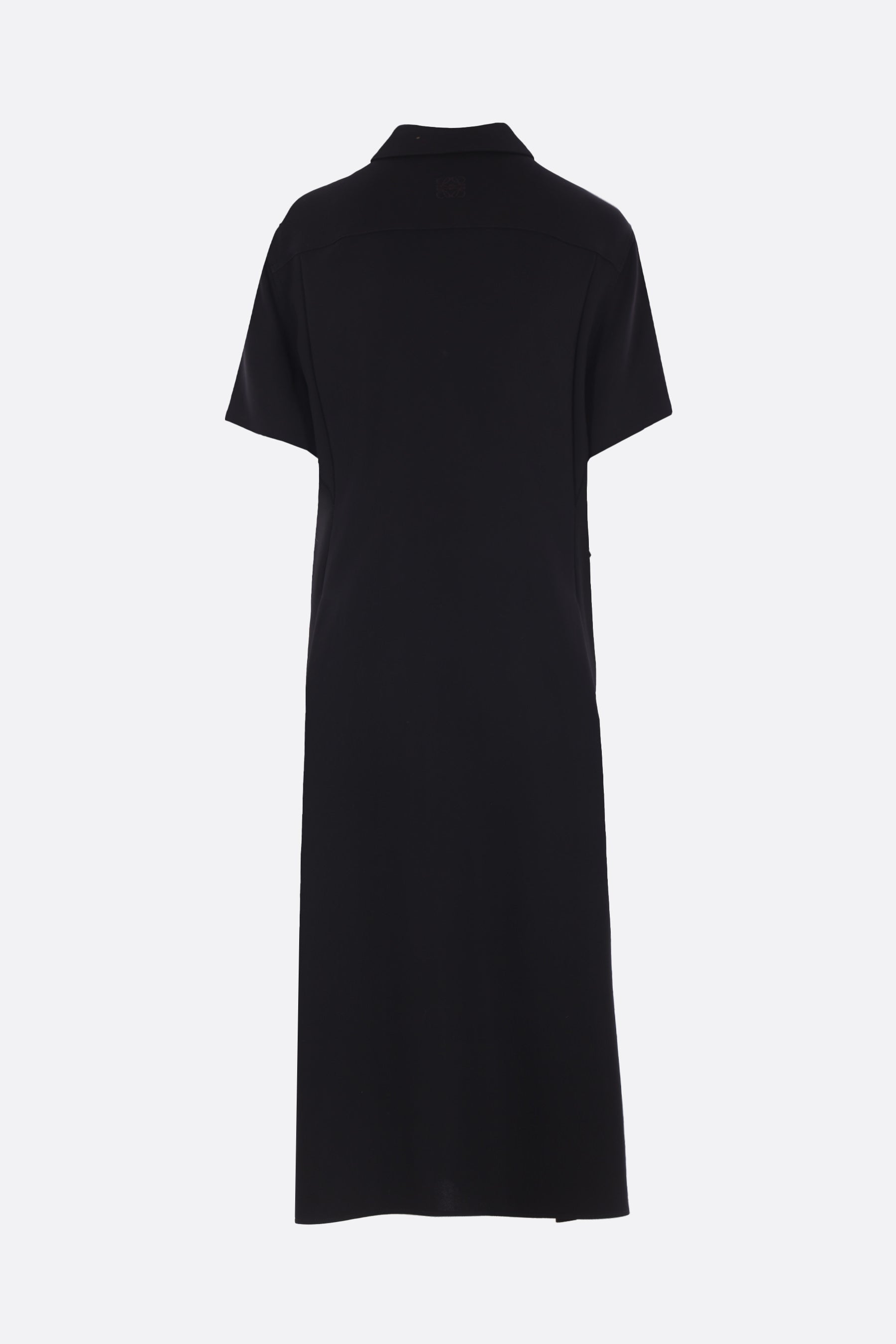 Loewe midi dress crafted from black stretch viscose. Featuring a pointed collar, hidden front button closure, short sleeves, waist draping with adjustable belted straps, and a flared skirt.