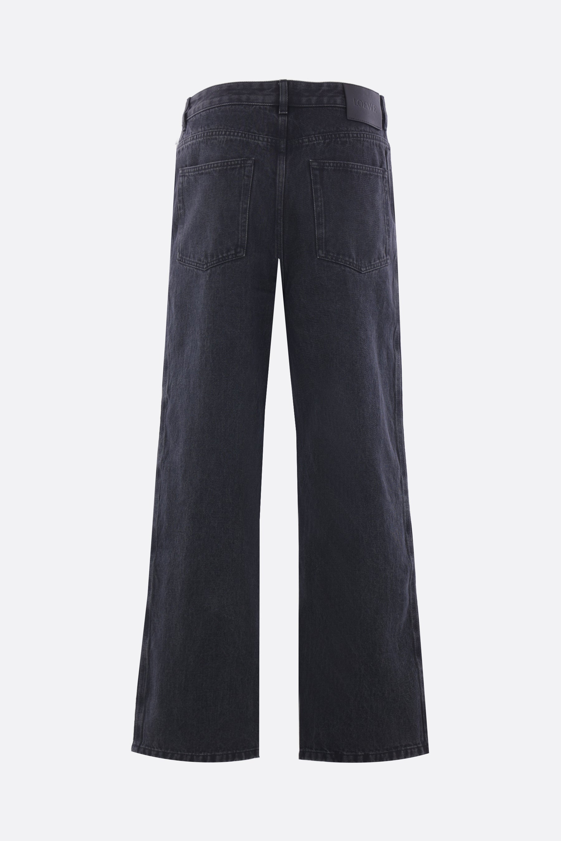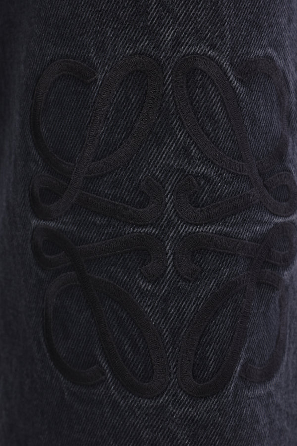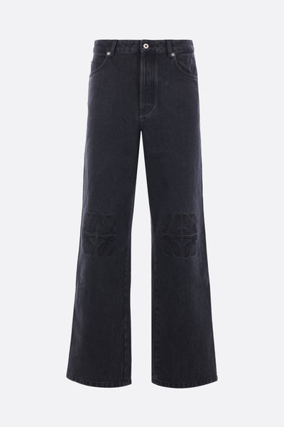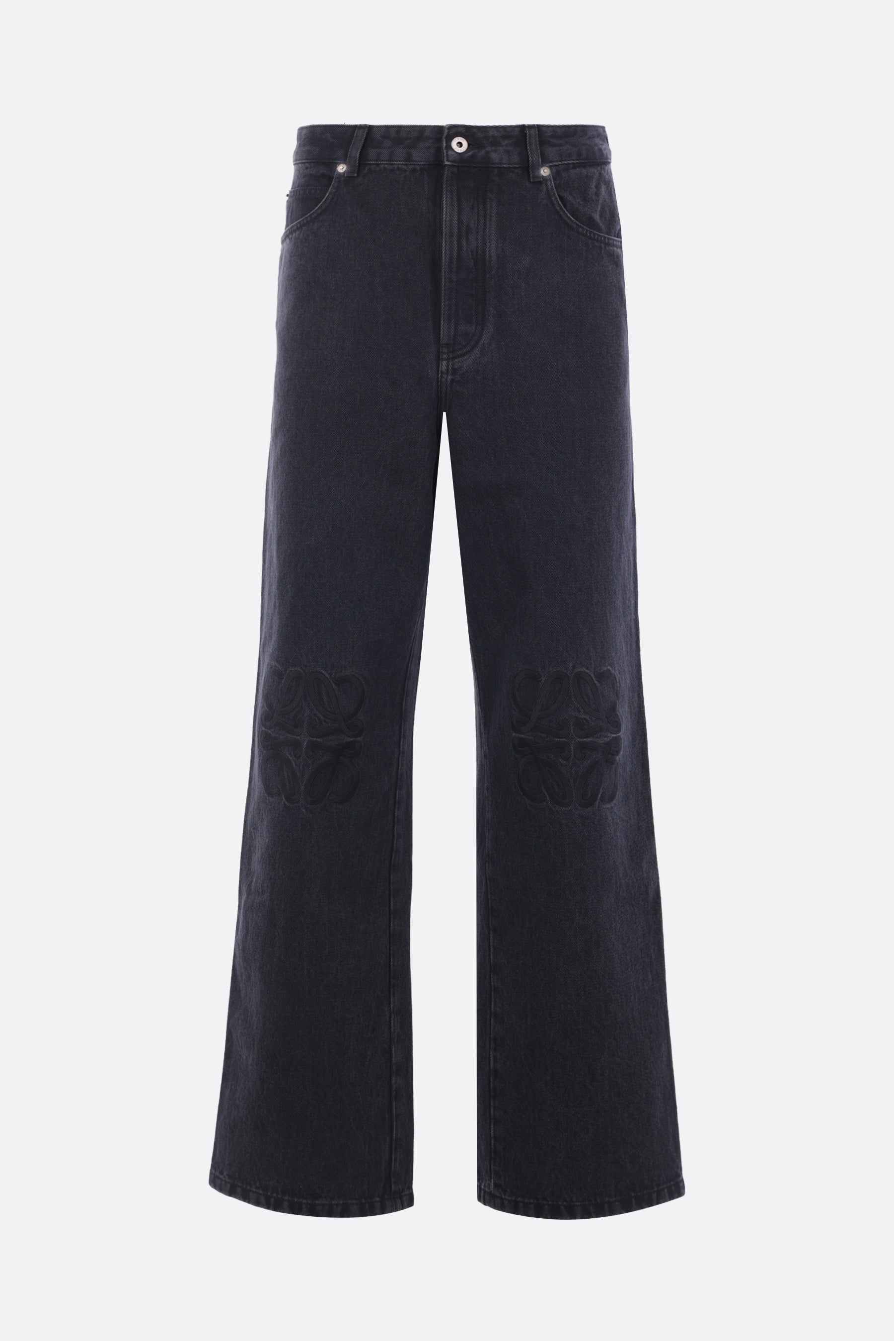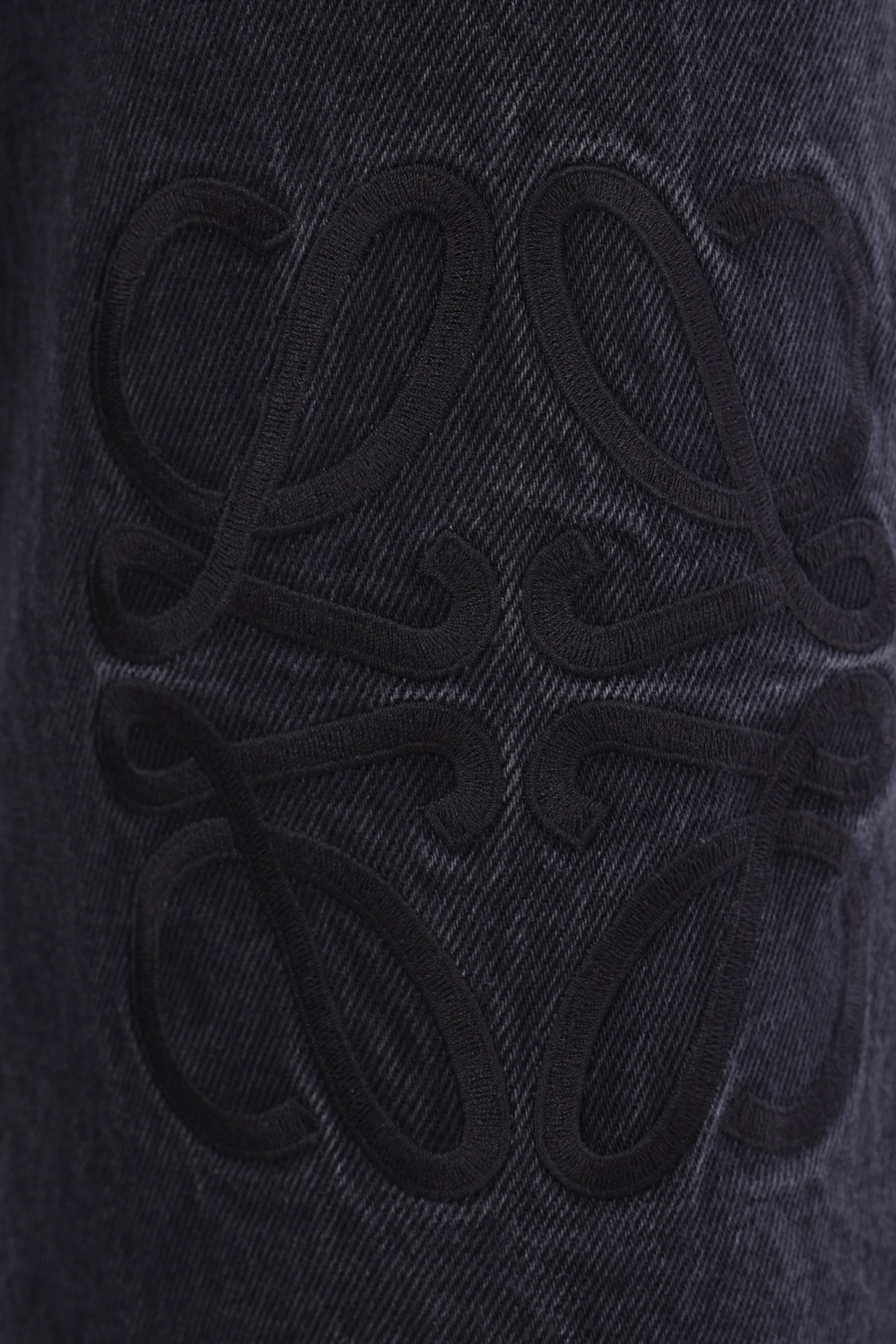 Loewe baggy jeans crafted from washed black cotton denim with Anagram embroidery on the knees. Featuring front metal button and zip closure, belt loops, classic five-pocket design, and a leather logo patch on the back.