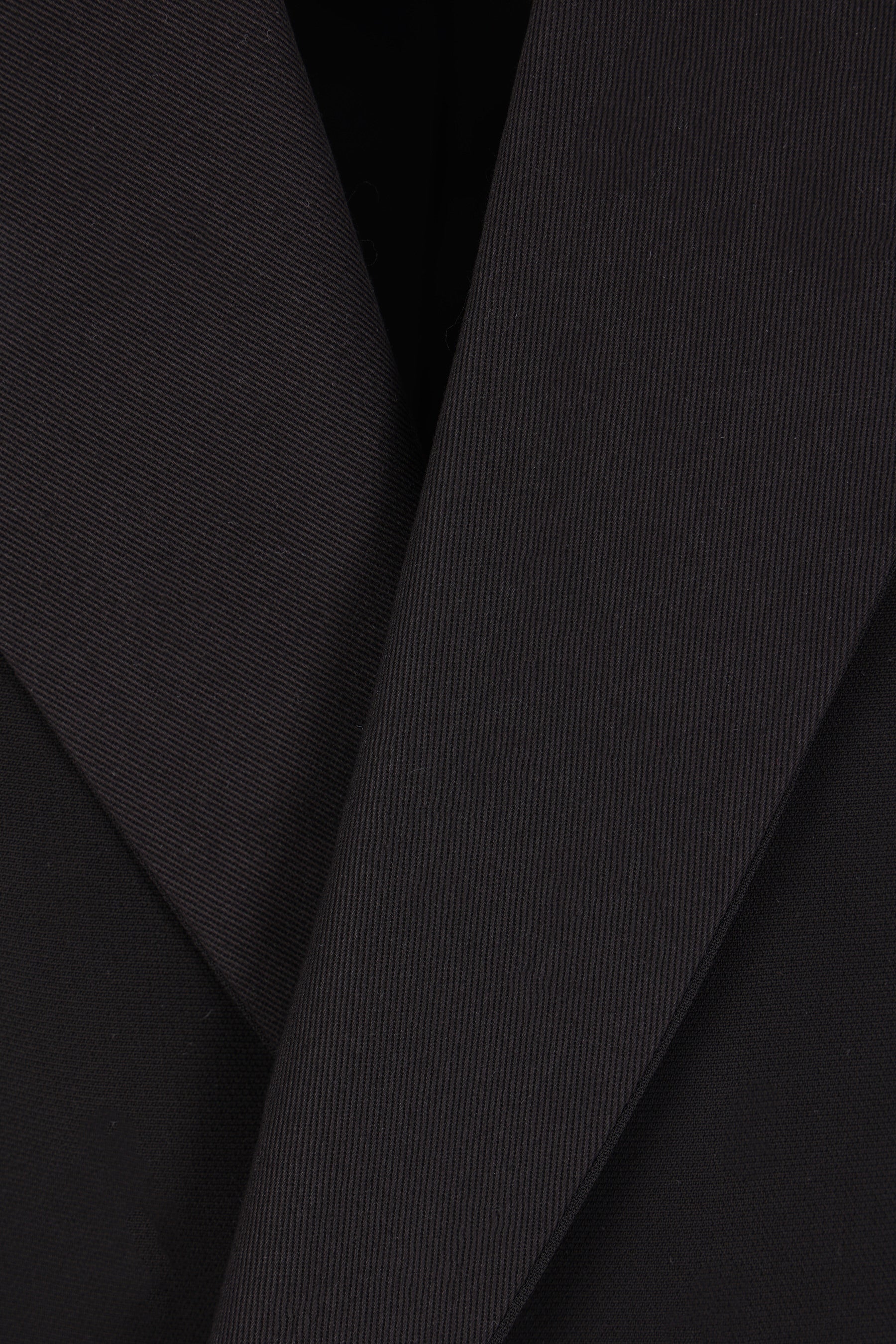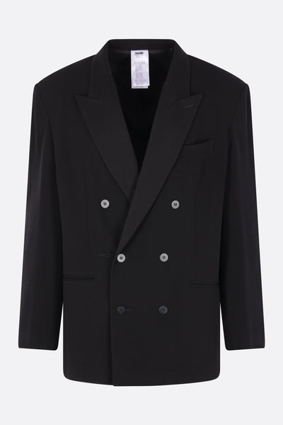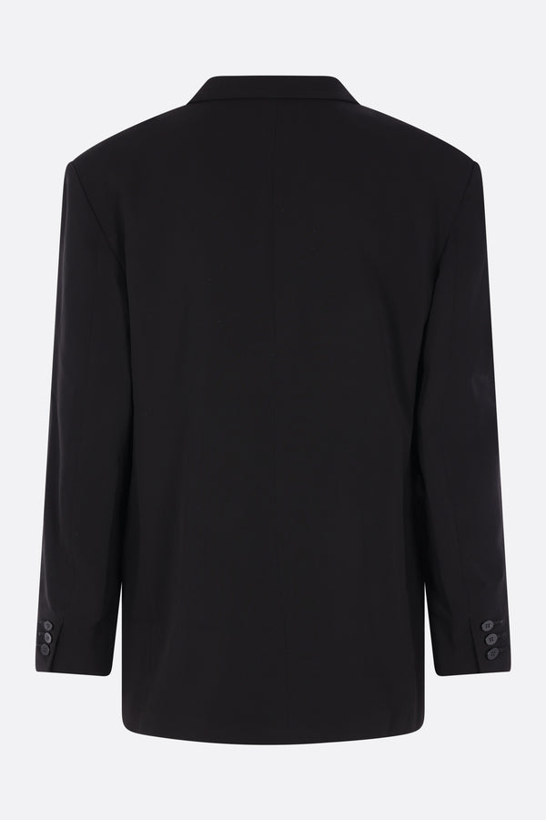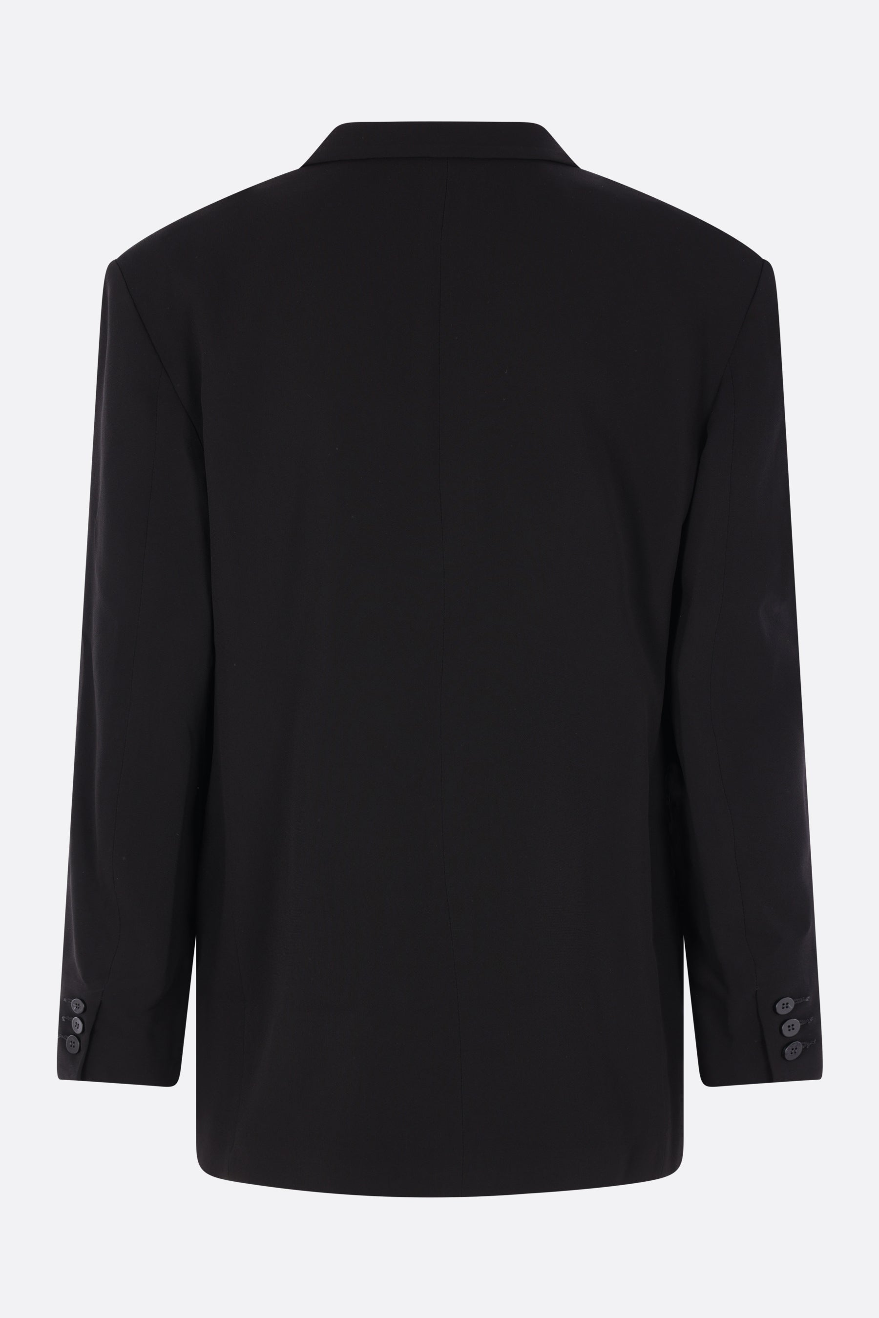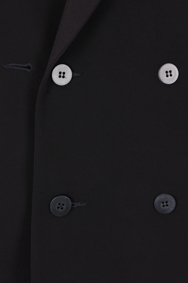 Magliano double-breasted jacket made of black stretch viscose. It features peak lapels, front button closure, multiple pockets, structured shoulders, long sleeves with buttoned cuffs, and a straight hem. Fully lined interior.