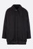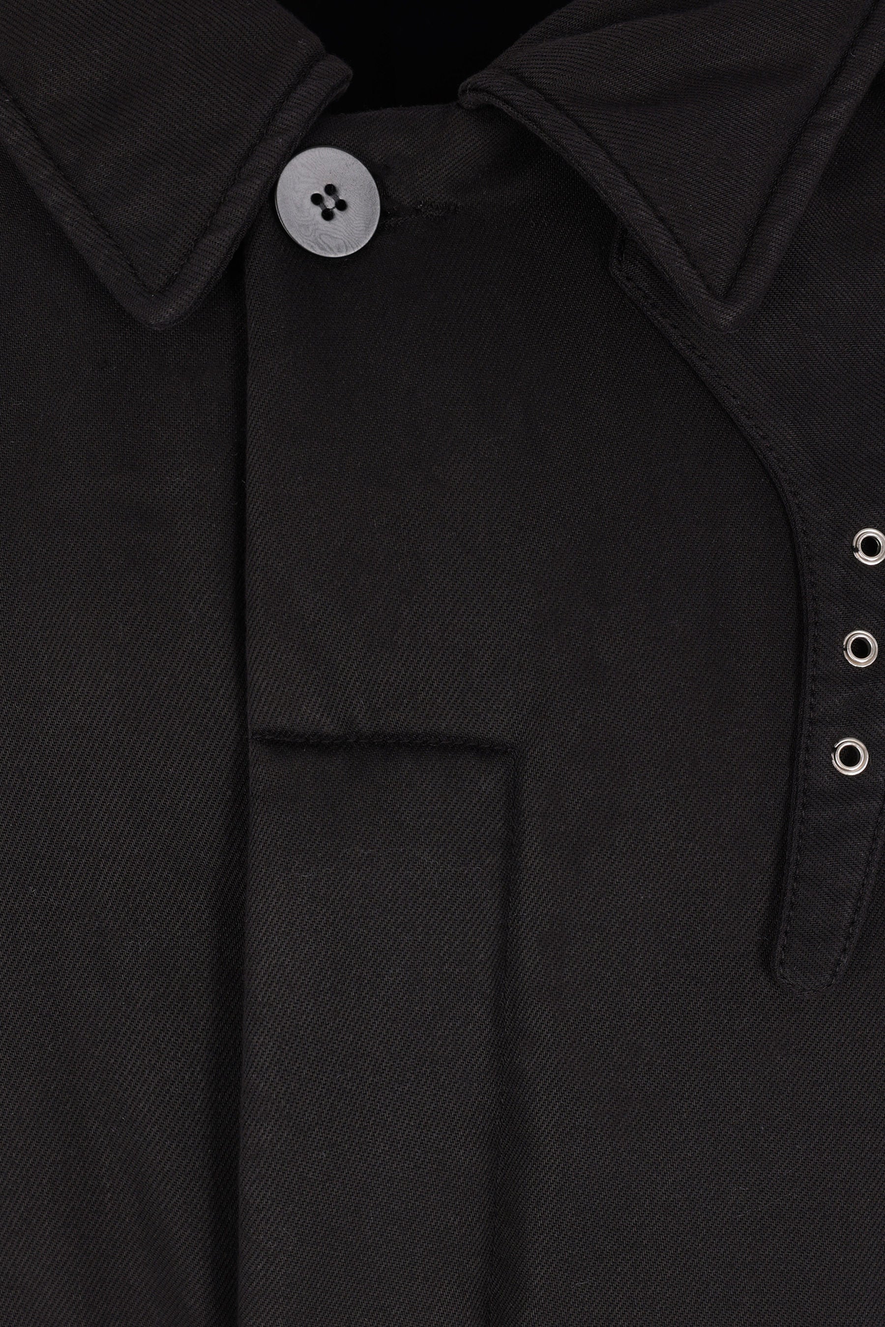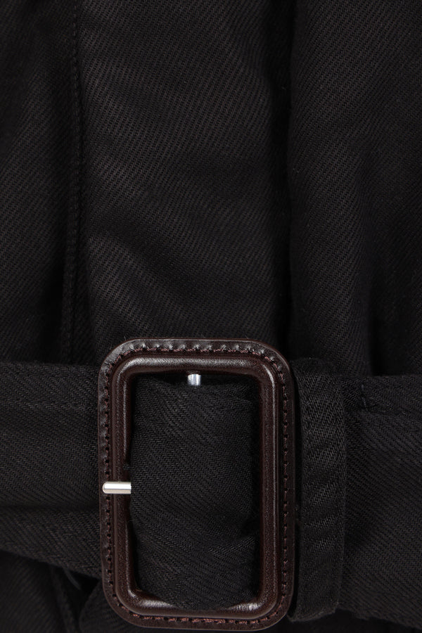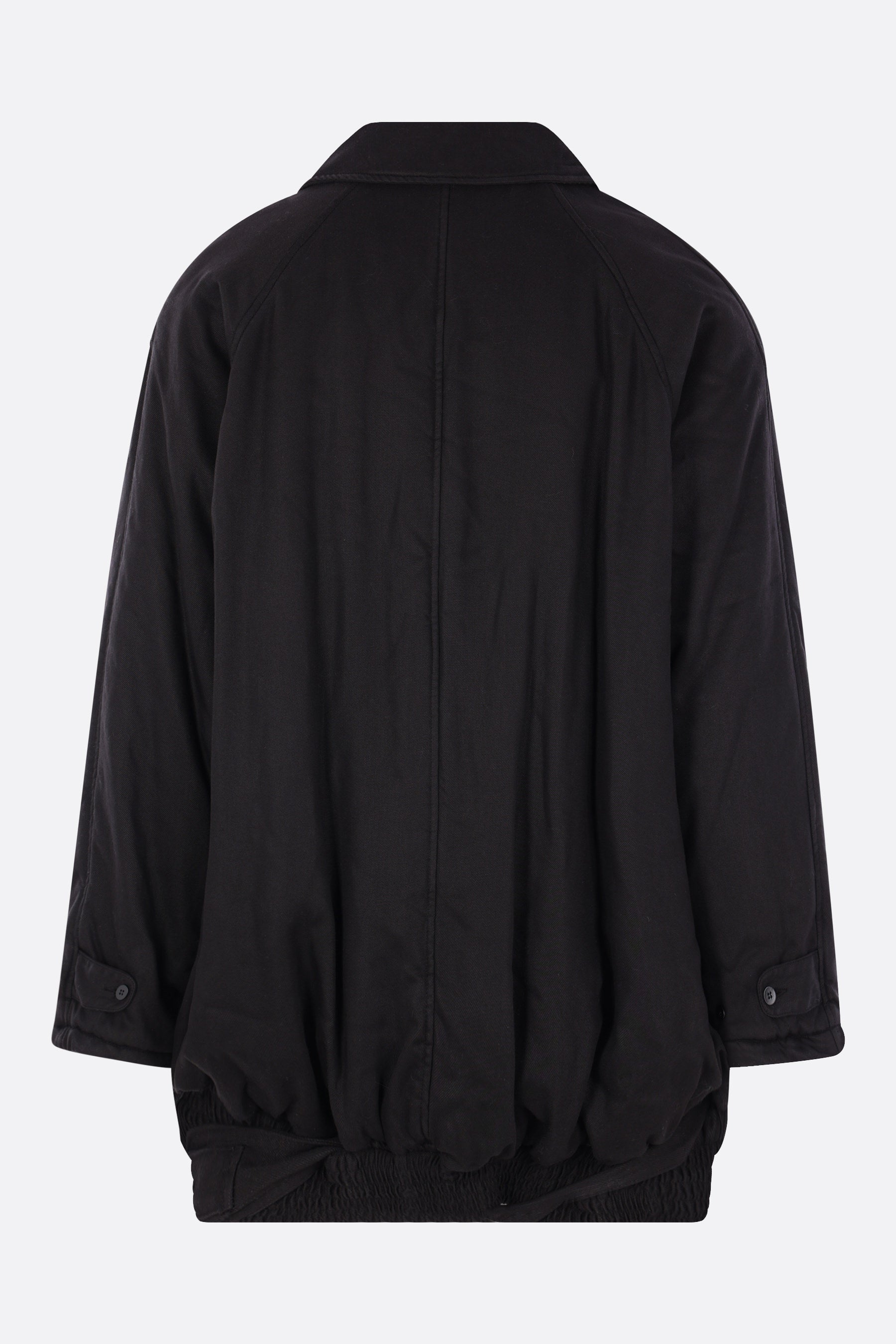 Magliano oversized padded bomber jacket made of black flannel. It features a pointed collar, hidden front button closure, welt pockets, long sleeves with wrist tabs, and an elasticated hem with a belt.