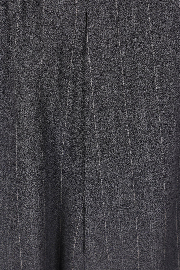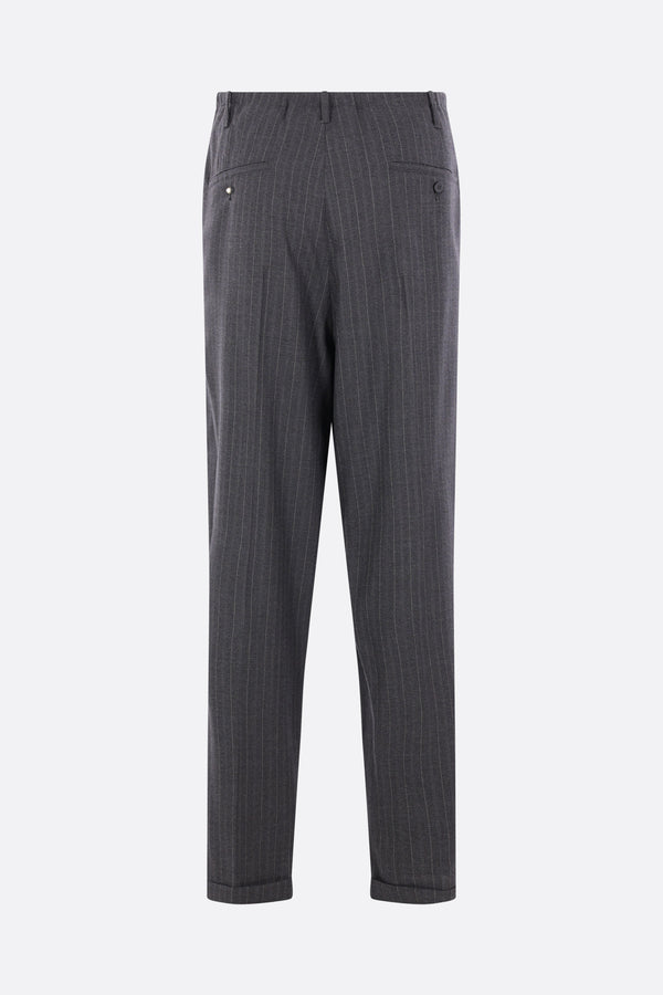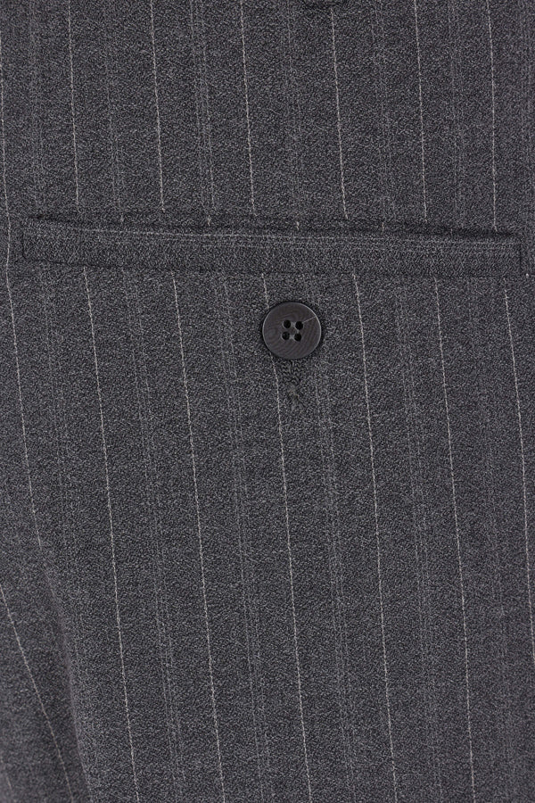 Magliano trousers made of grey pinstripe wool blend. They feature an elasticated waistband with drawstring, zip closure, belt loops, multiple pockets, front pleats, center crease, cuffed hems, and an unlined interior.