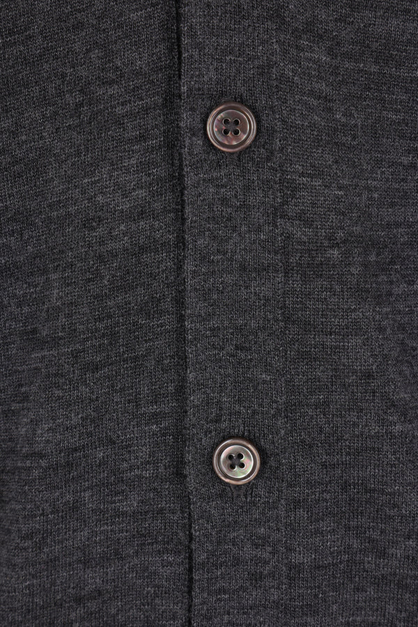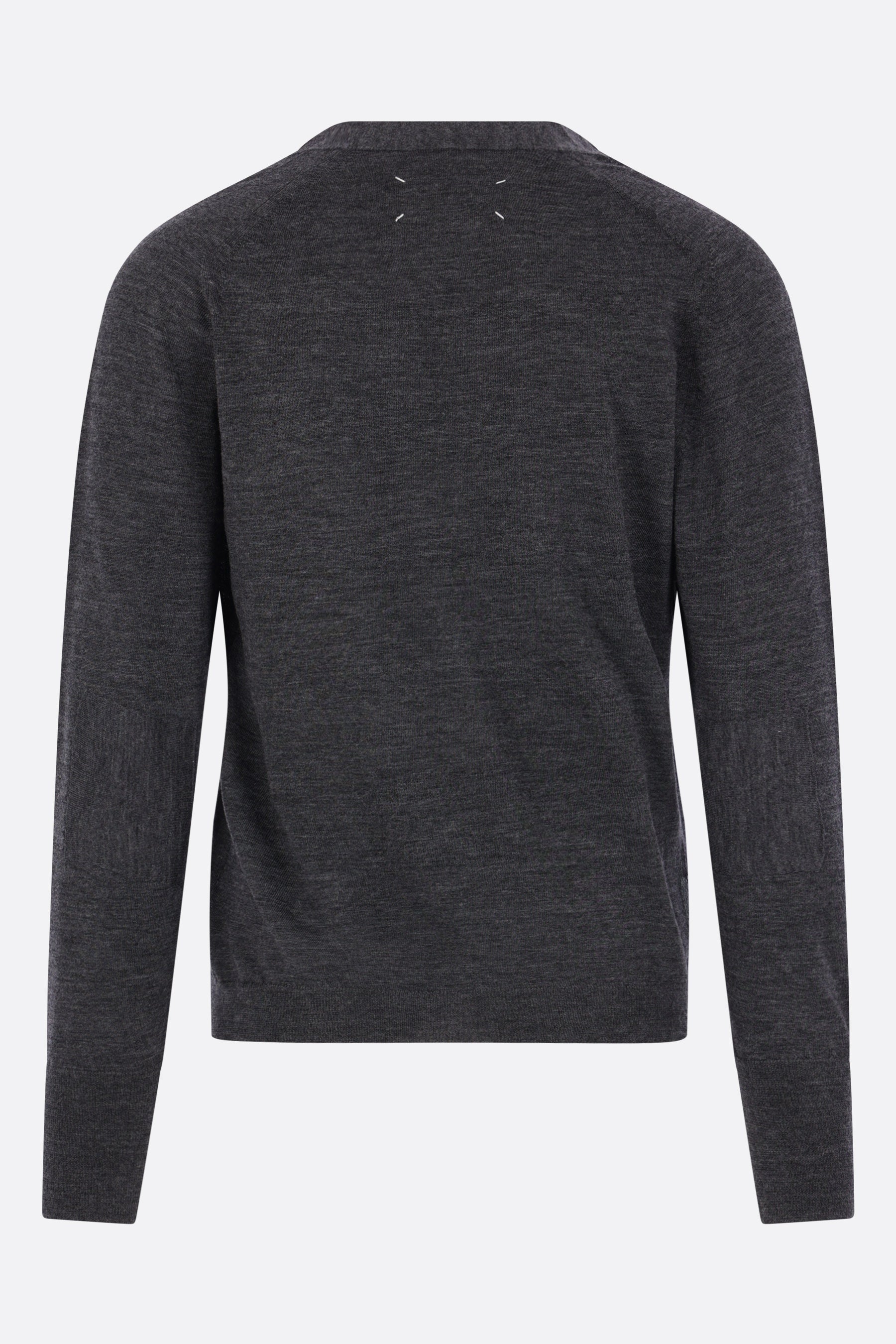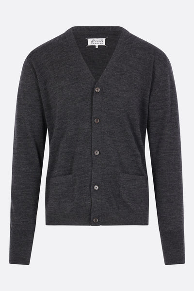 Maison Margiela cardigan made of grey wool-blend knit with repair-detailing on the sides. Featuring a V-neckline, button closure, long sleeves with elbow patches, front pockets, and ribbed edges. Finished with the brand's signature four back stitches.