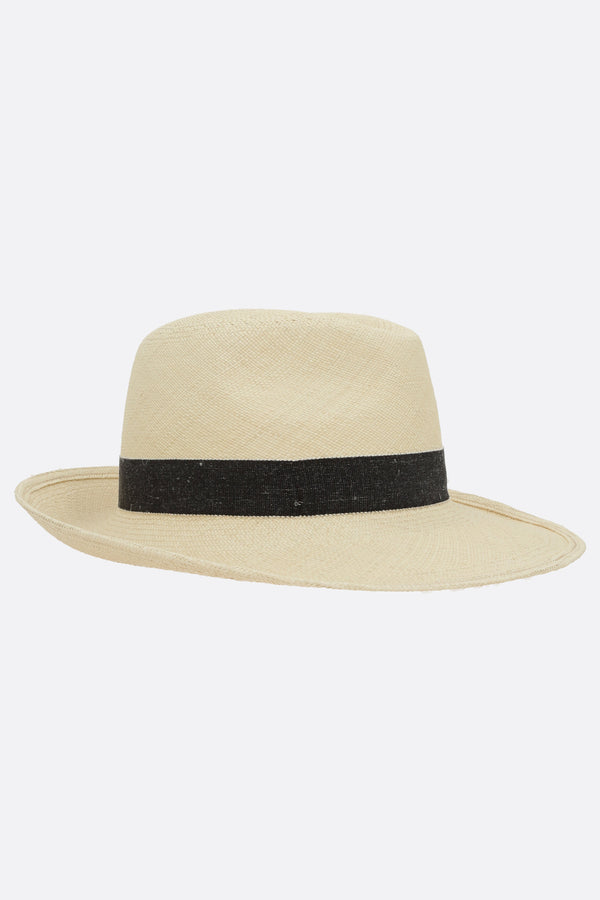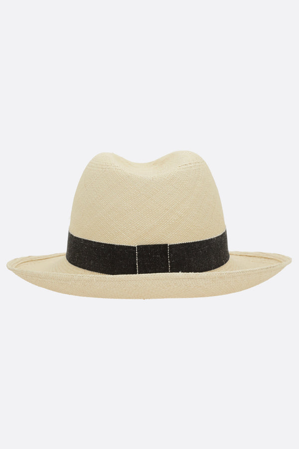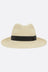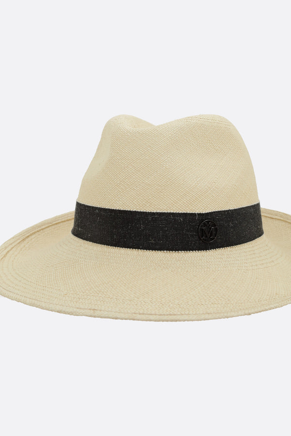 Maison Michel fedora hat crafted in natural straw and adorned with a black grosgrain ribbon featuring a tone-on-tone enameled metal logo.