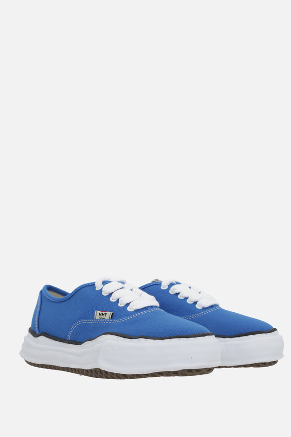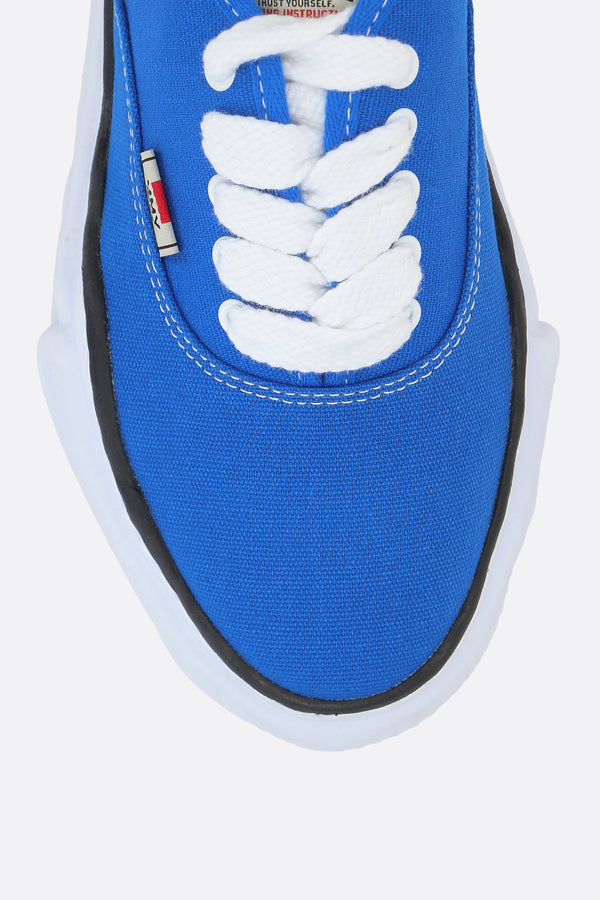 Maison Mihara Yasuhiro low-top sneakers crafted in bright blue canvas. Featuring lace-up closure, a round-toe silhouette, fabric lining and irregular rubber sole. The design is completed by the iconic MMY label on tongue.