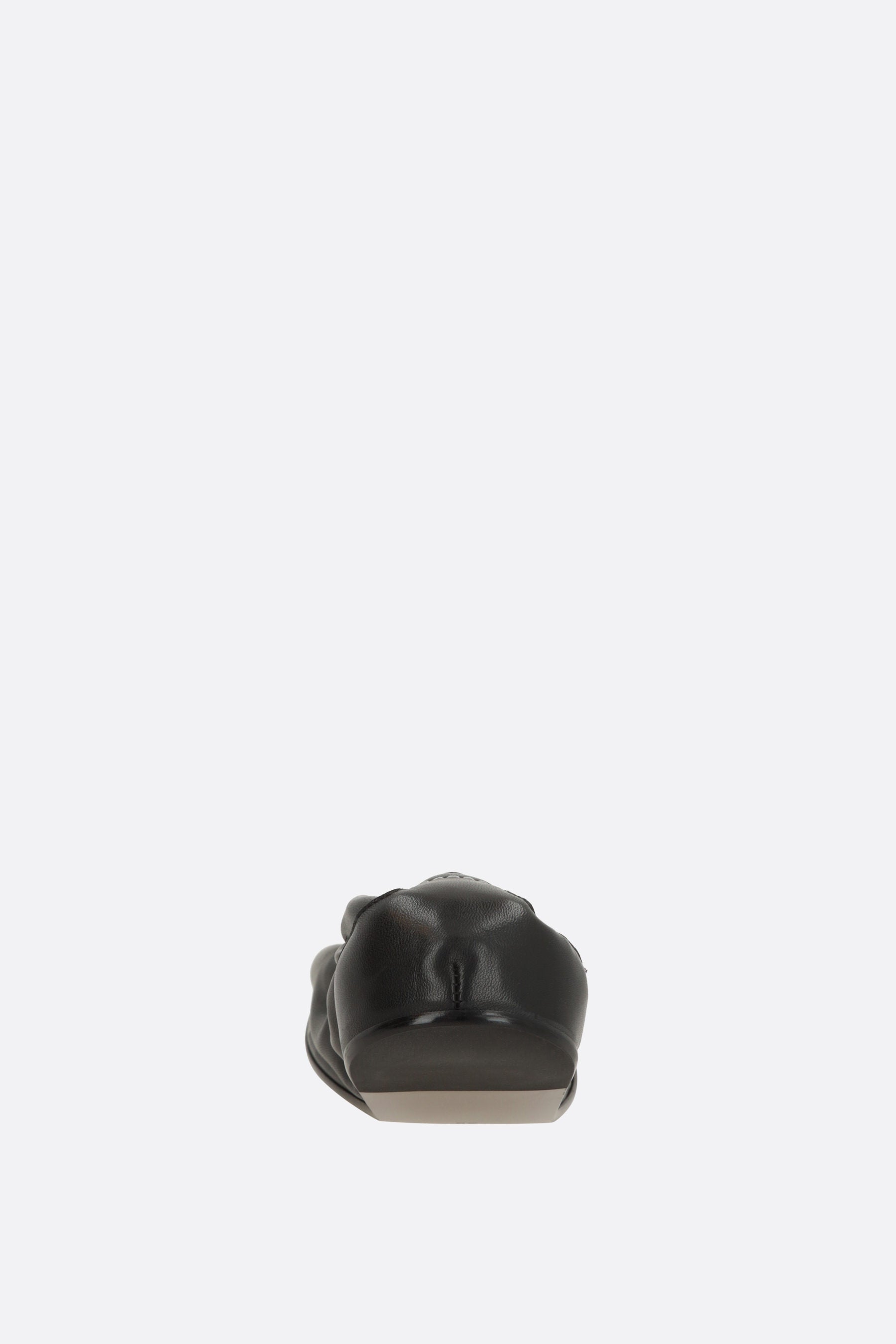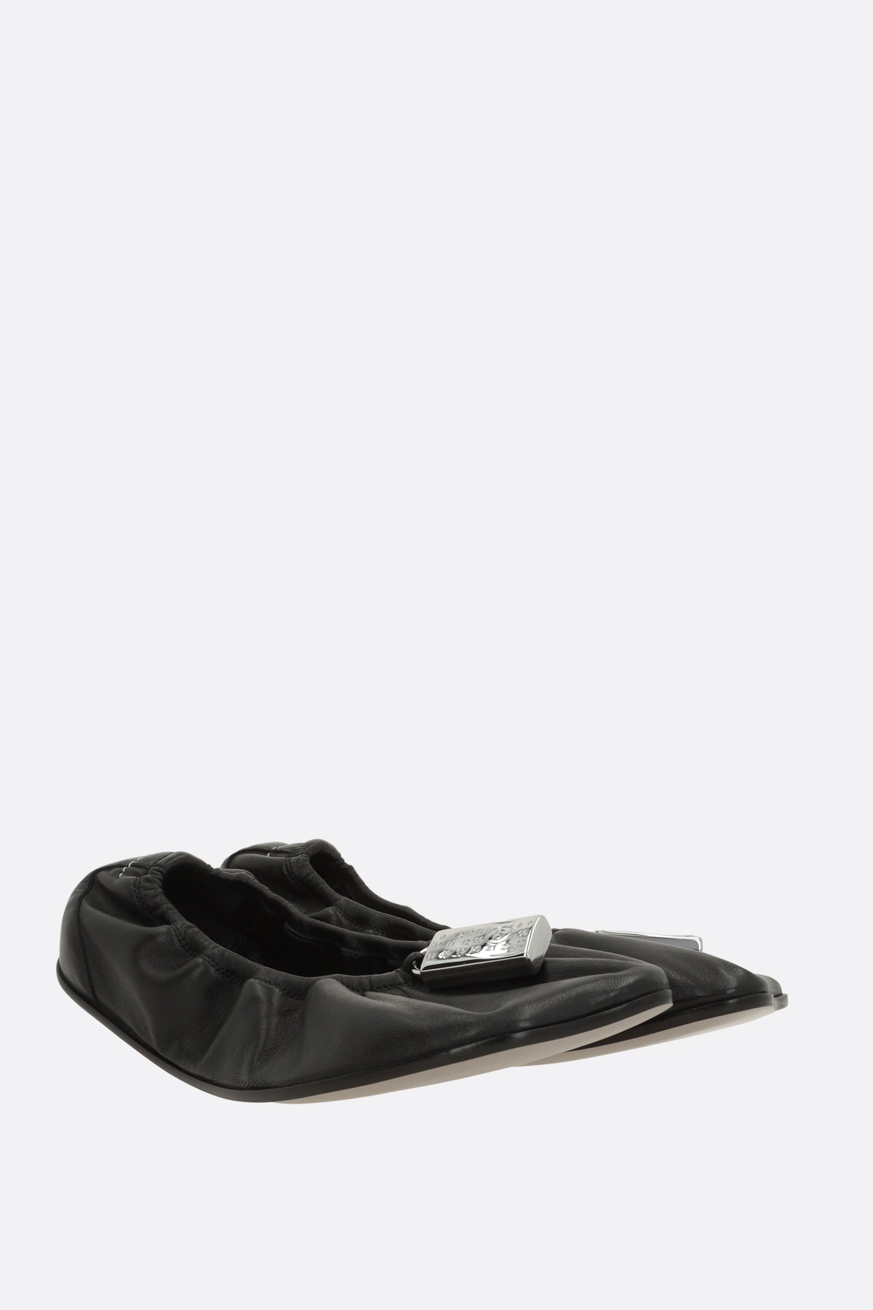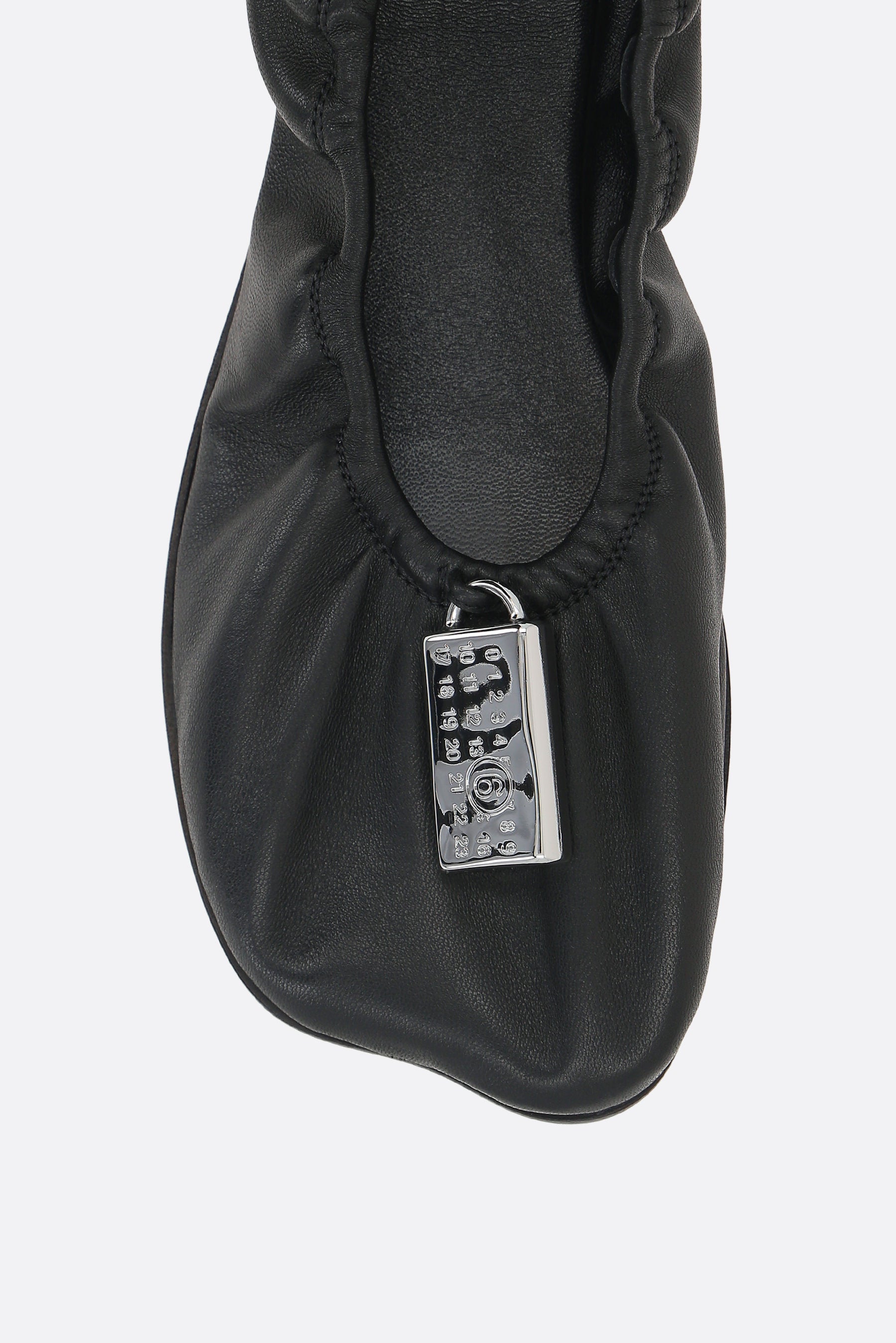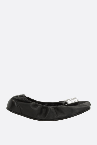 MM6 ballerinas made from black nappa leather. Featuring an anatomical toe, elasticized edges, leather linings, and leather sole. The design is completed with a metal detail engraved with the numeric logo and the Maison's signature white stitching on the back.