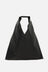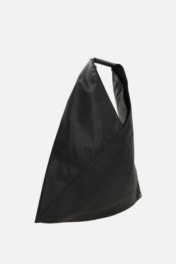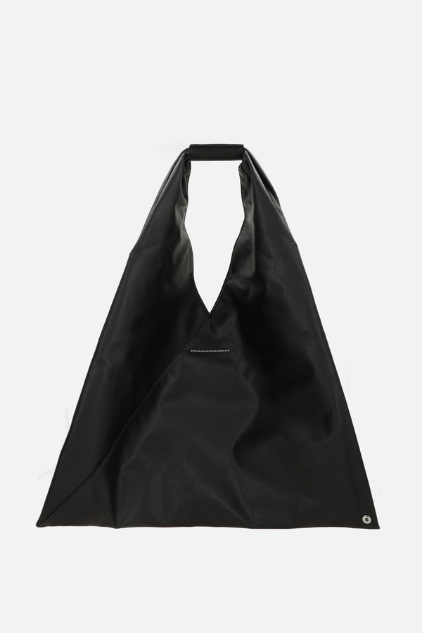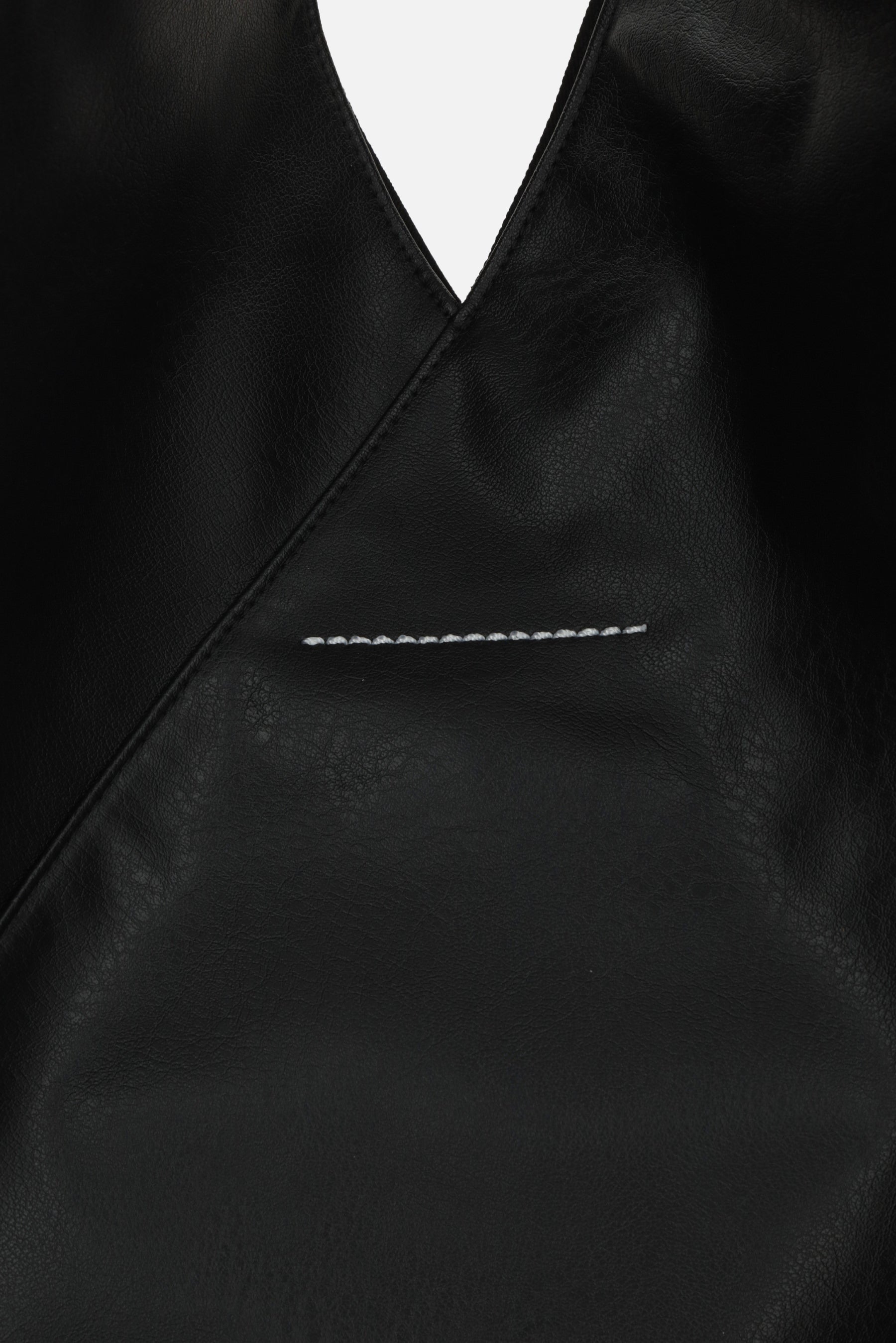 MM6 handbag crafted in black faux leather. Featuring silver-tone hardware, internal snap closure, and a leather handle embossed with the Maison's signature numerical logo. The black canvas-lined interior includes a flat pocket. The design is completed with the Maison's iconic white stitching on the back.