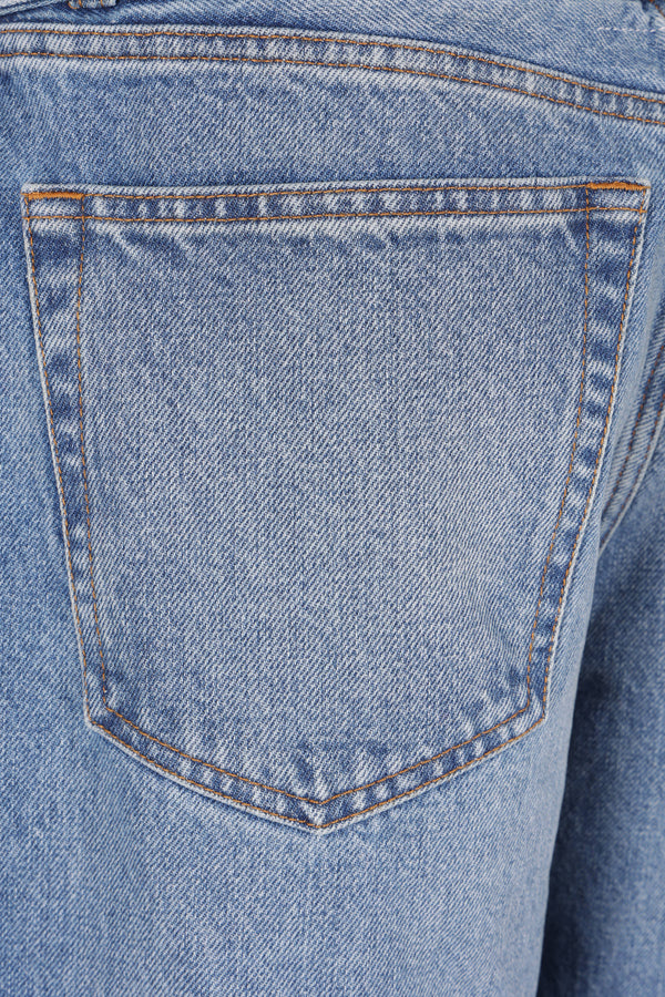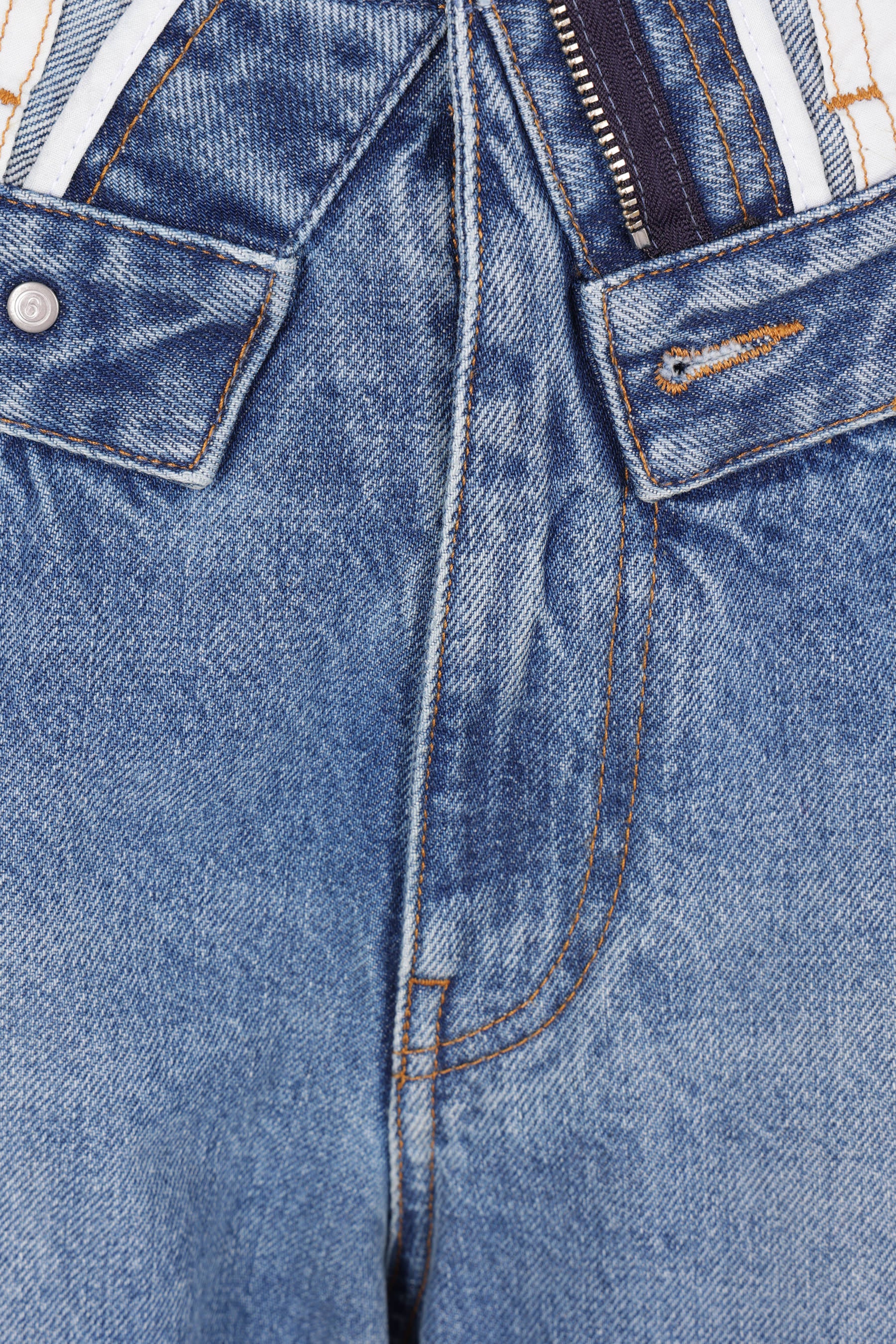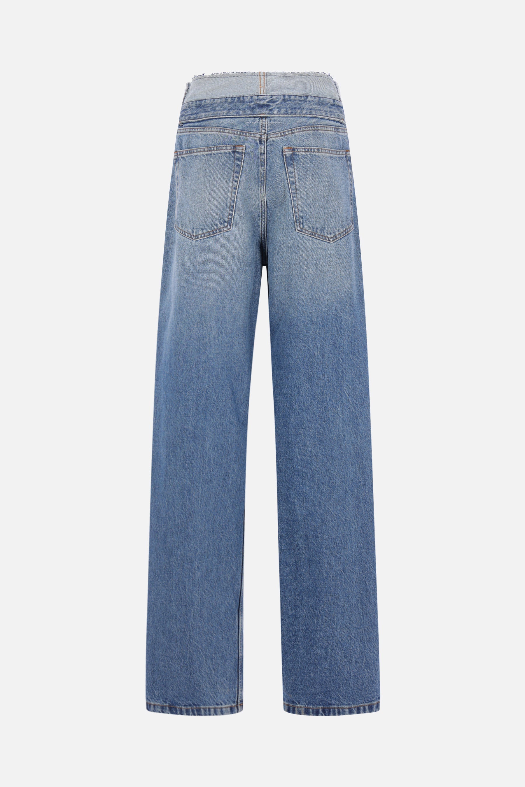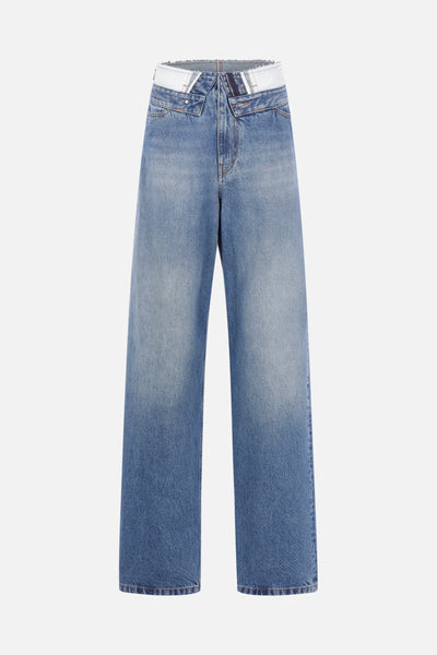 MM6 wide-leg jeans crafted in light blue cotton denim with a layered waistband insert creating a double-layer effect. Featuring a front hook, button, and zip closure, and multiple pockets. The design is completed with the Maison's signature white stitching on the back.