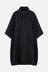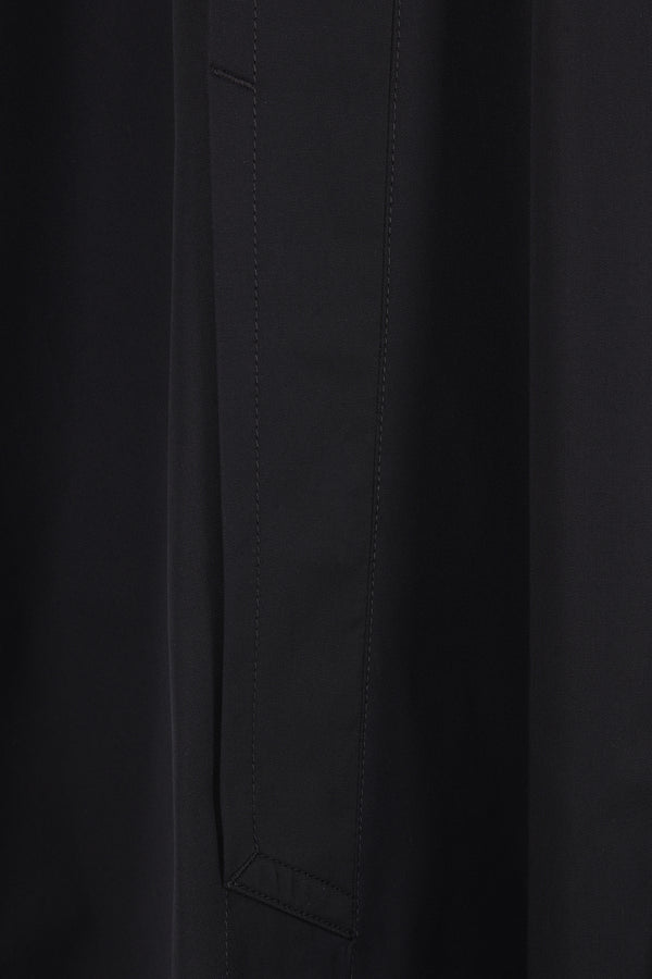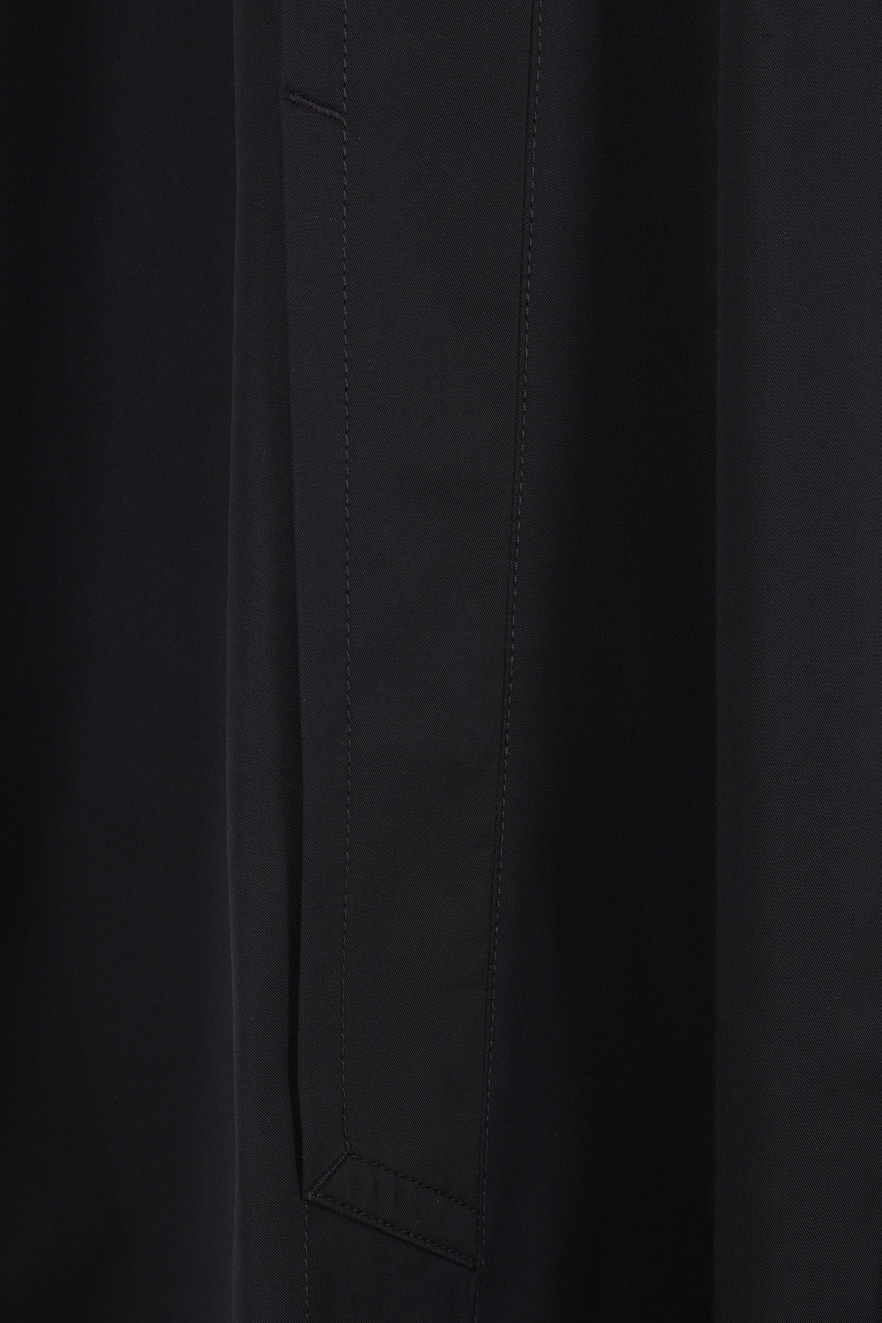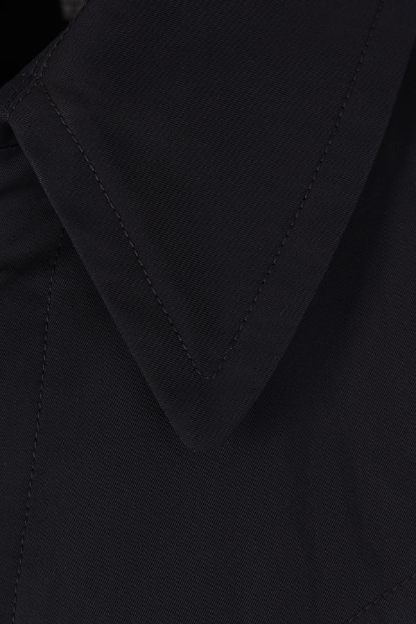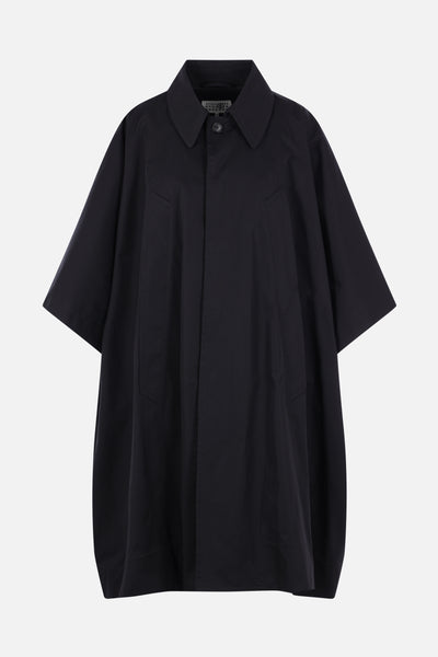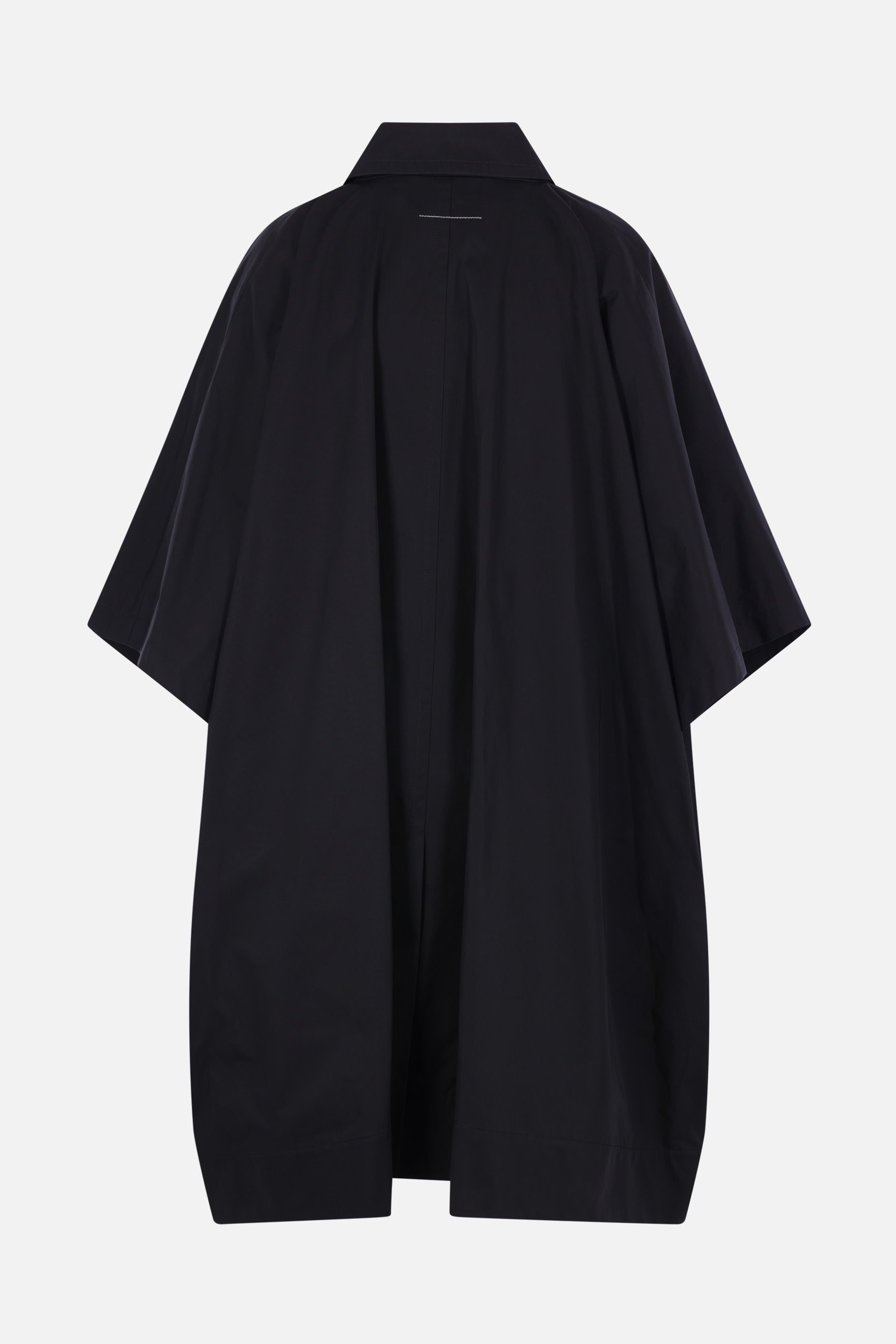 MM6 oversize overcoat crafted from black water-repellent cotton. It features a pointed collar, concealed front button closure, welt pockets, wide sleeves, a central back vent, and a lined interior.