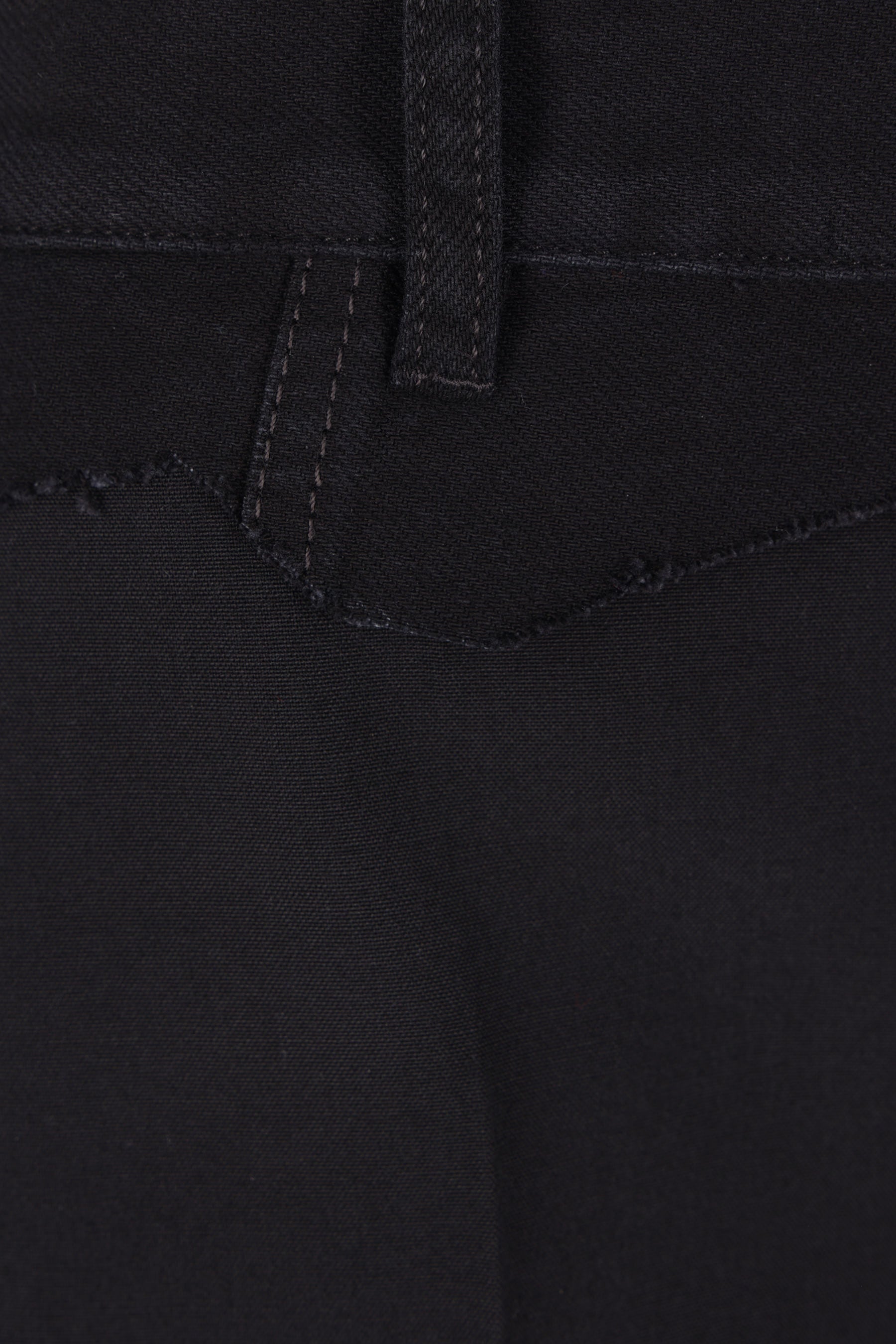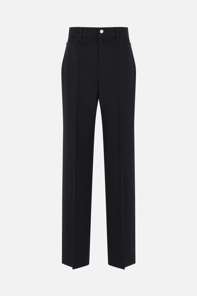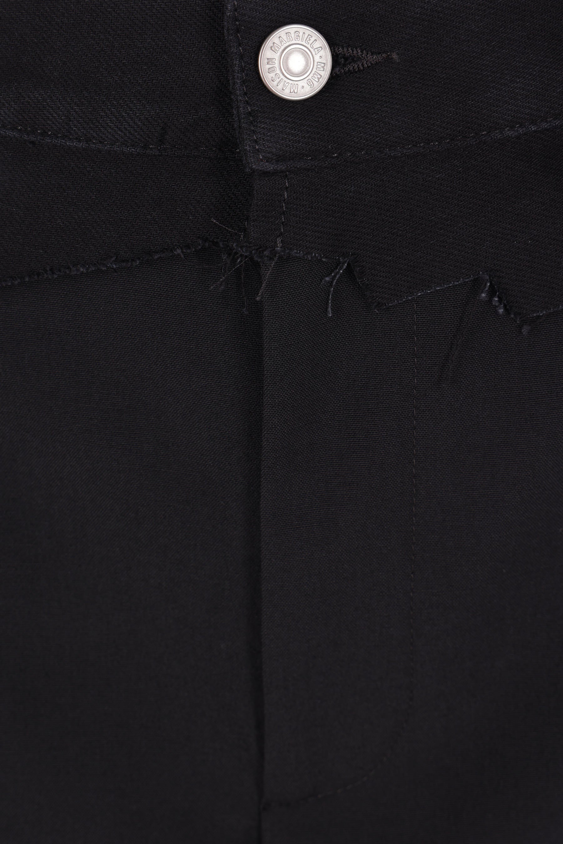 MM6 straight-leg trousers crafted in black wool blend with a denim waistband insert. Featuring a front metal button and zip closure, belt loops, multiple pockets, and a central crease. The design is completed with the Maison's signature white stitching on the back.