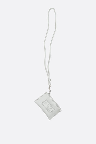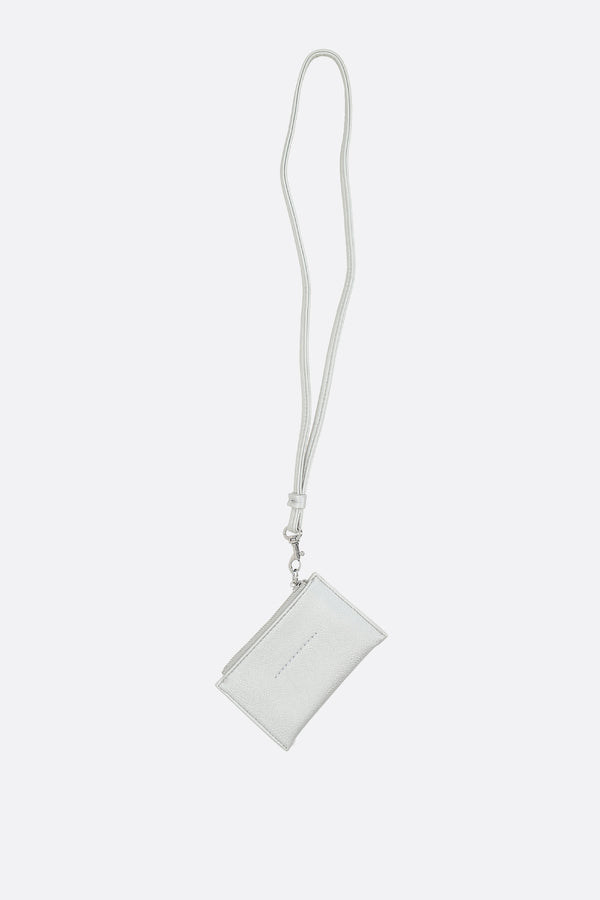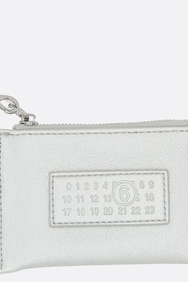 MM6 coin purse crafted in silver faux leather with a numeric logo patch on the front. Featuring silver-tone hardware, zip closure, and a removable neck strap. The interior is fabric-lined, and the design is completed with the Maison's signature white stitching on the back.