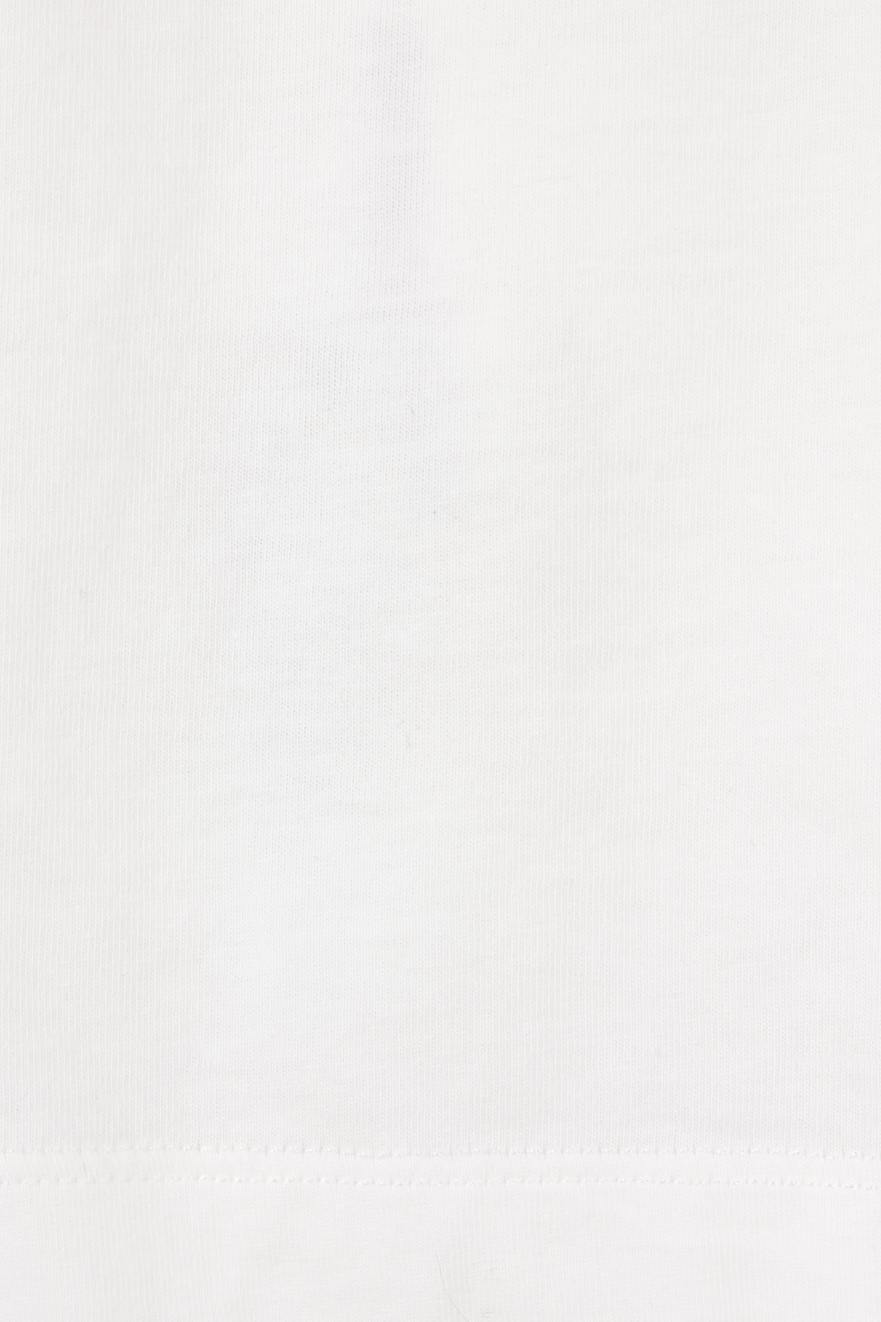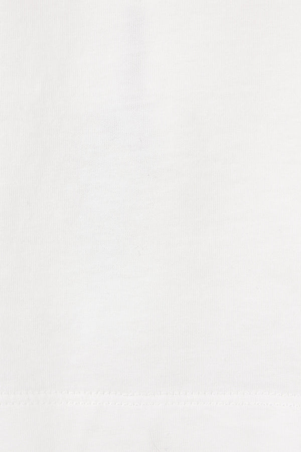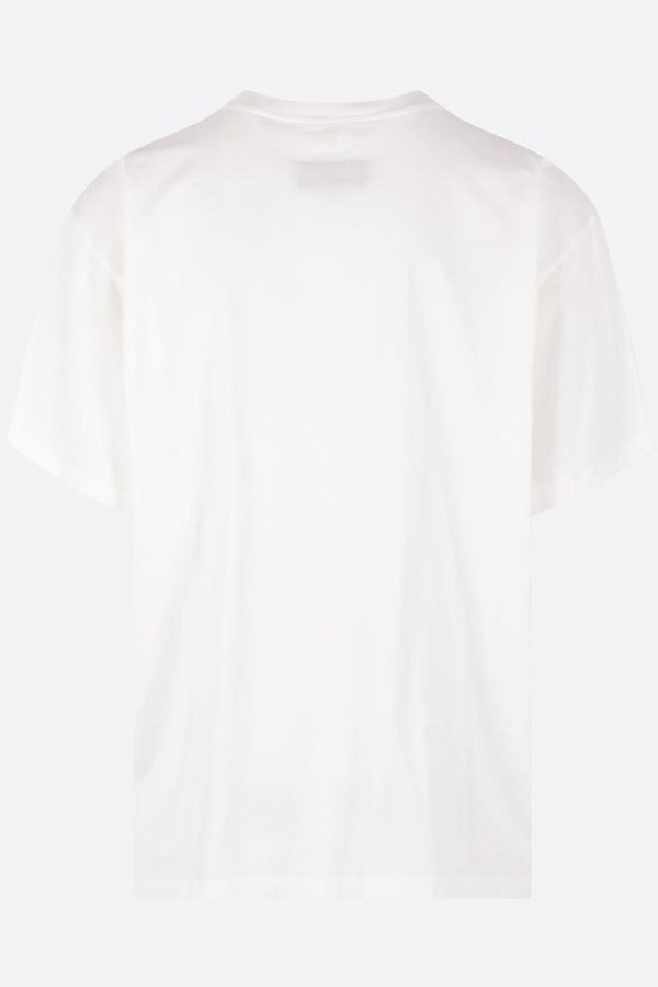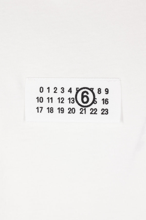 MM6 t-shirt crafted from white cotton jersey with a numeric logo patch on the chest. It features a crew neckline, short sleeves, and a straight hem, completed by the Maison's signature white stitching at the back.