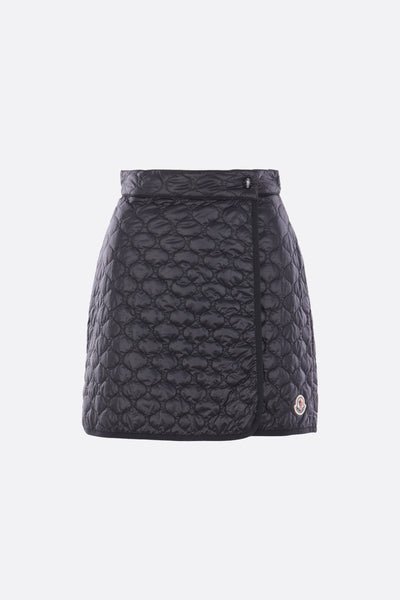 Moncler mini skirt made of black quilted nylon. Features a wrap-style snap button closure and a front logo patch.