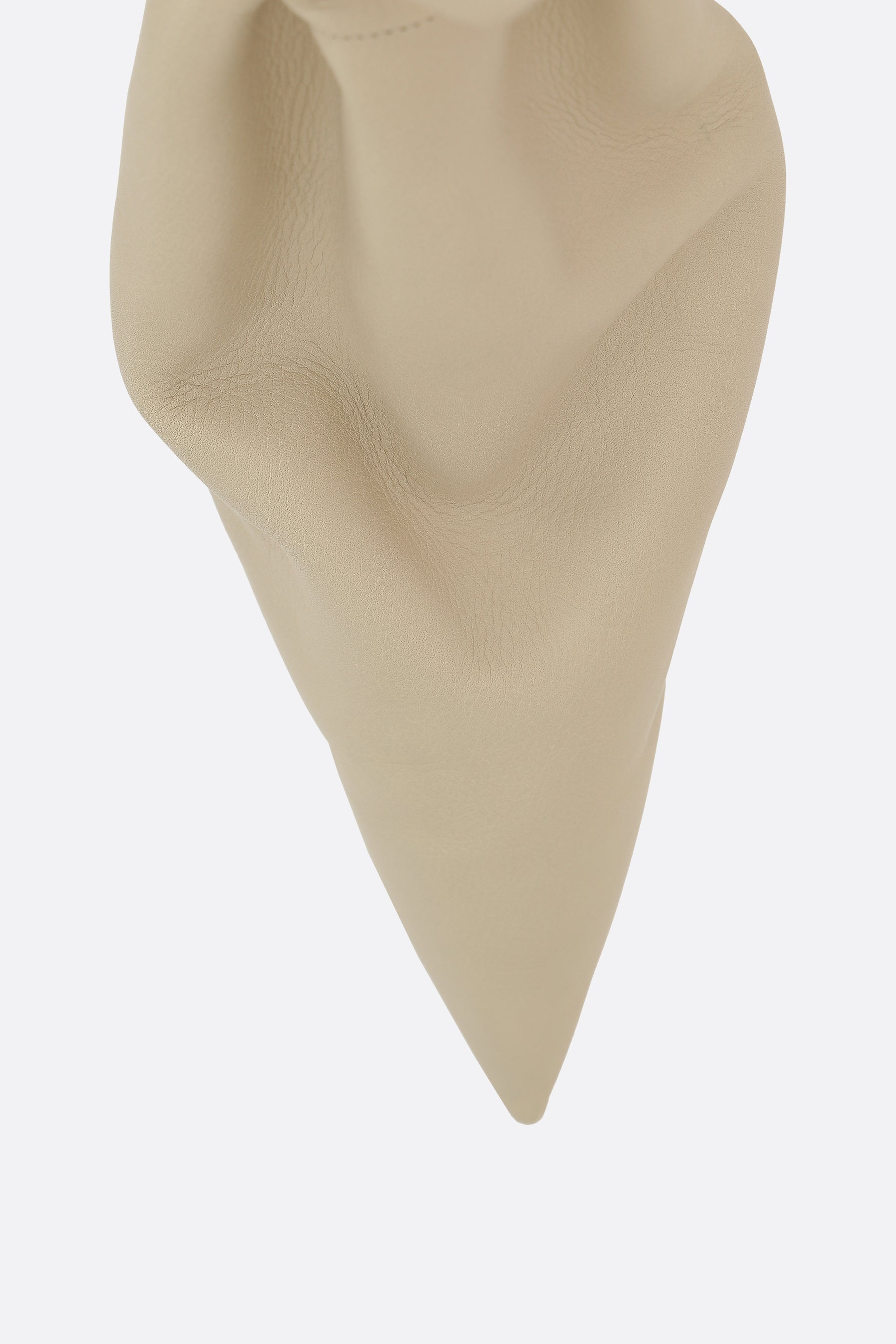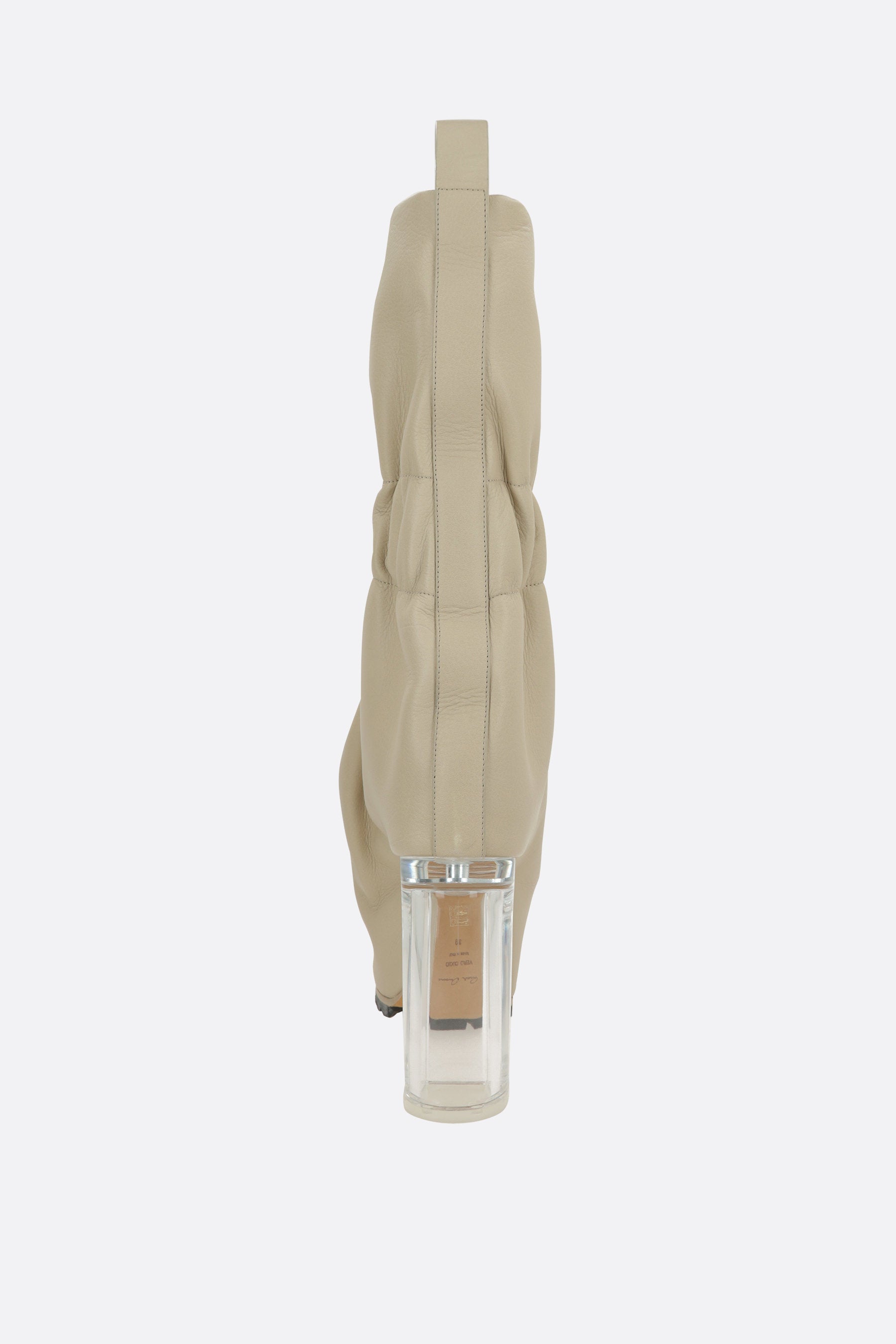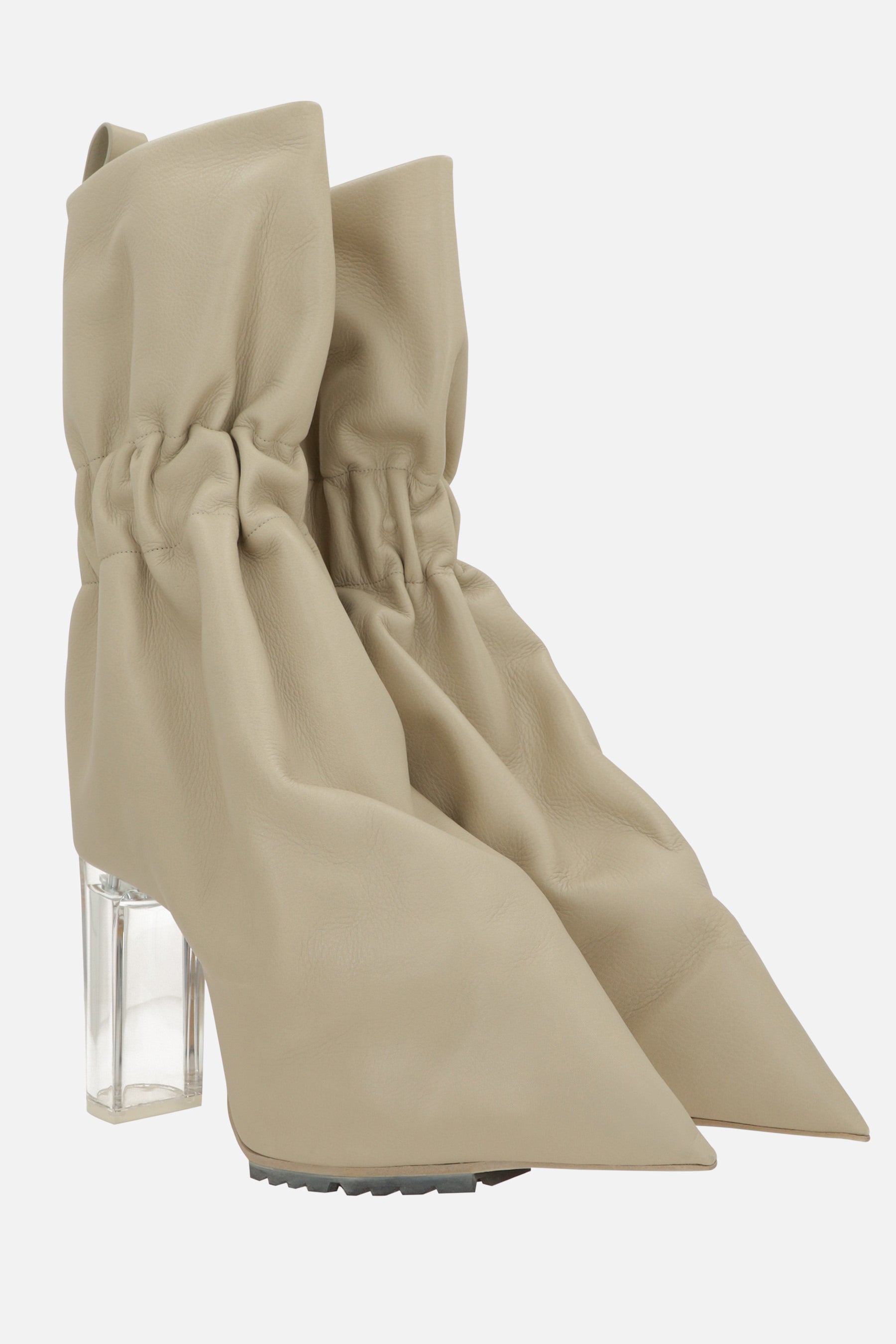 Rick Owens platform ankle boots crafted in light beige hammered leather. Featuring a pointed toe, an elastic ankle band, leather linings, and a leather/rubber sole. The design is completed by a chunky transparent plexiglass heel.