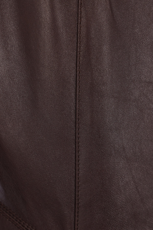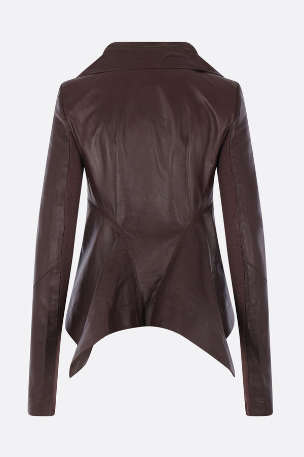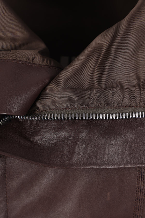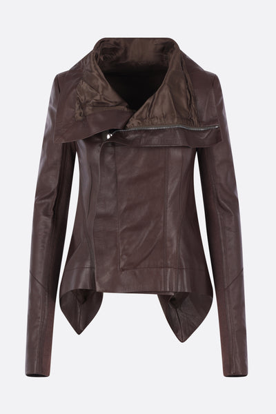 Rick Owens jacket crafted in brown leather. Features a high collar, asymmetrical zip closure, long sleeves with ribbed jersey underarms, an asymmetric hem, and a fully lined interior.