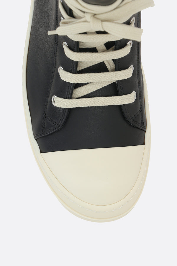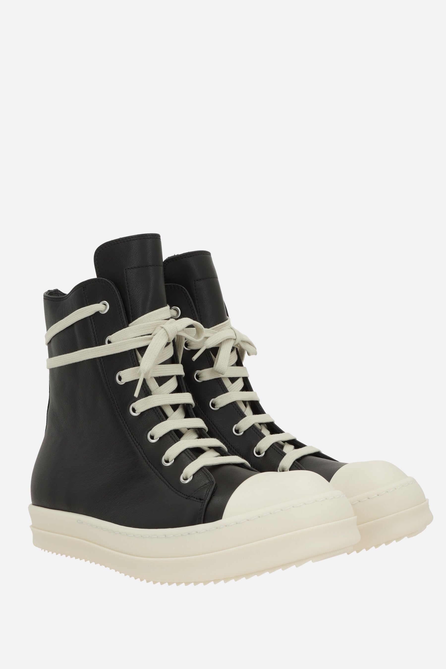 Rick Owens high-top sneakers crafted from smooth black leather with a contrasting rubber toe cap. Featuring a side zip closure, oversized laces, a round toe, leather lining, and a ridged rubber sole.