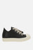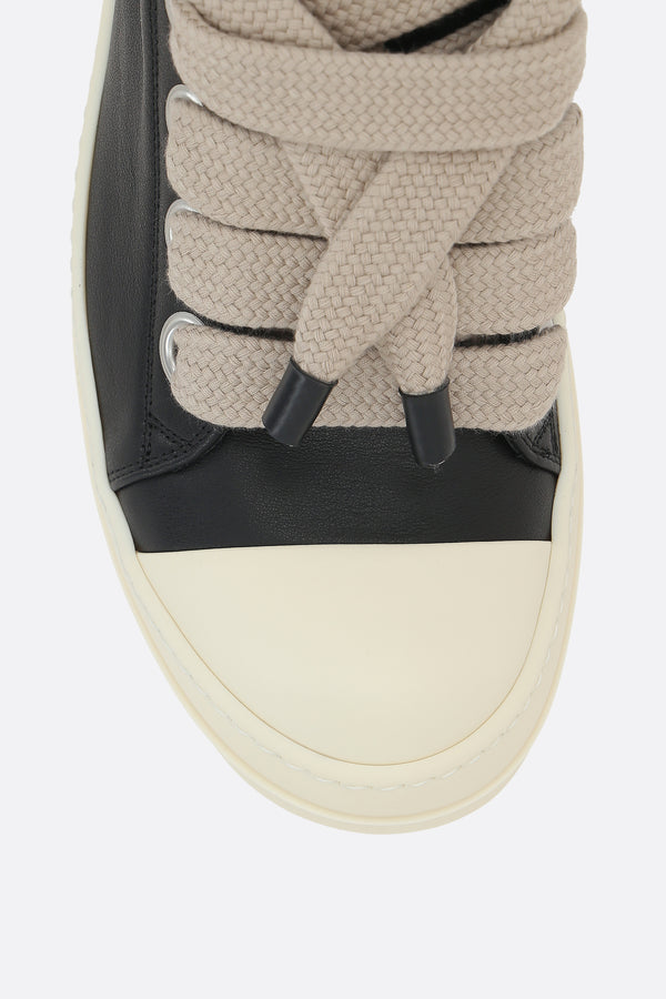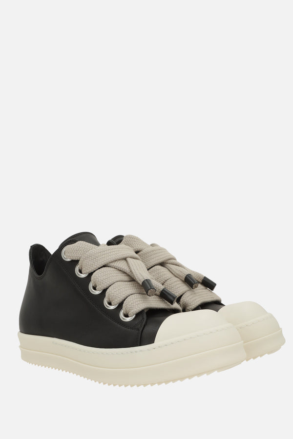 Rick Owens low-top sneakers crafted from smooth black leather with a contrasting rubber toe cap. Featuring oversized laces, a round toe, leather lining, and a ridged rubber sole.