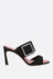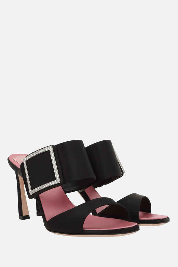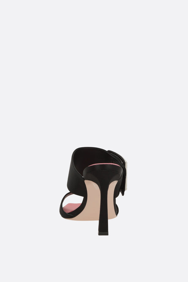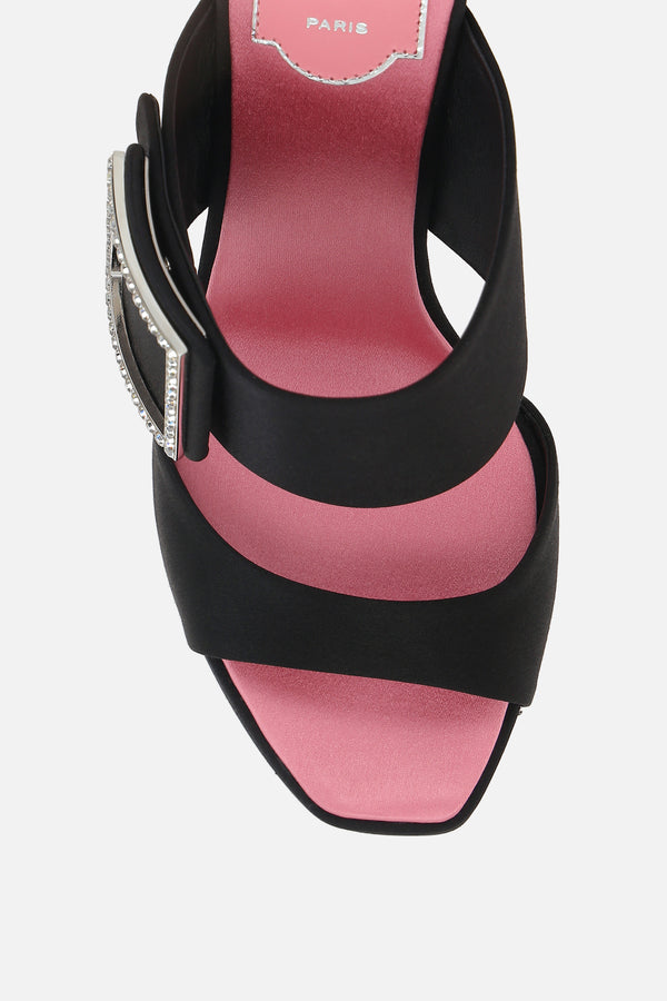 Roger Vivier mule sandals crafted in black satin, featuring the iconic side buckle adorned with crystals. Featuring a square toe, leather/fabric linings, and a leather sole. The design is completed by a flared Trompette heel.