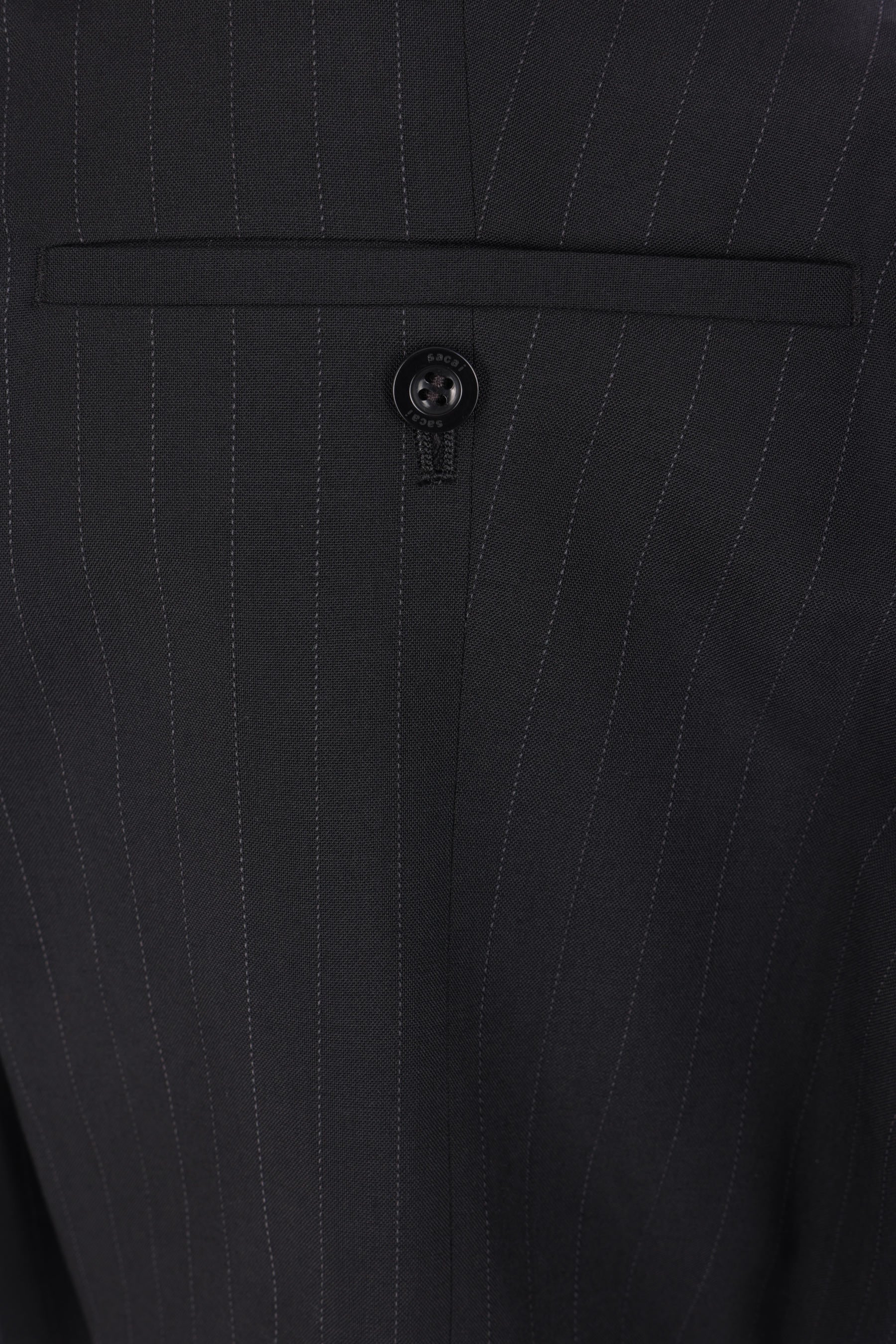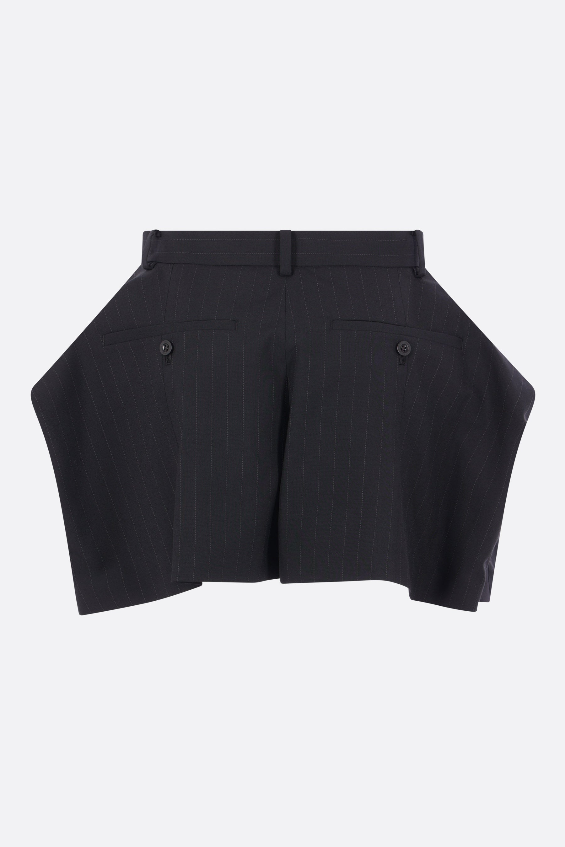 Sacai shorts crafted from black wool-blend with a pinstripe pattern. They feature a front hook-and-zip closure, belt loops, buttoned welt pockets at the back, and shaped side drapes with satin panels. The interior is lined in nylon.