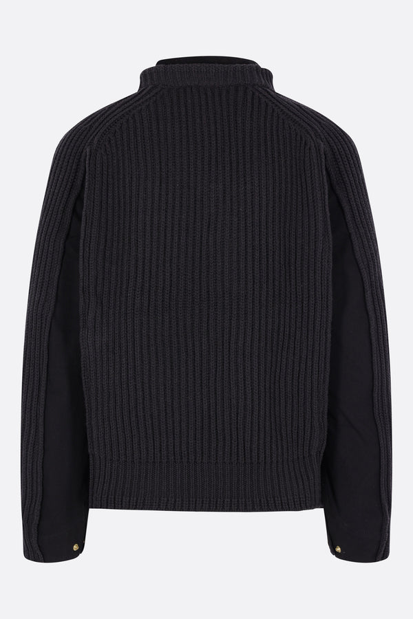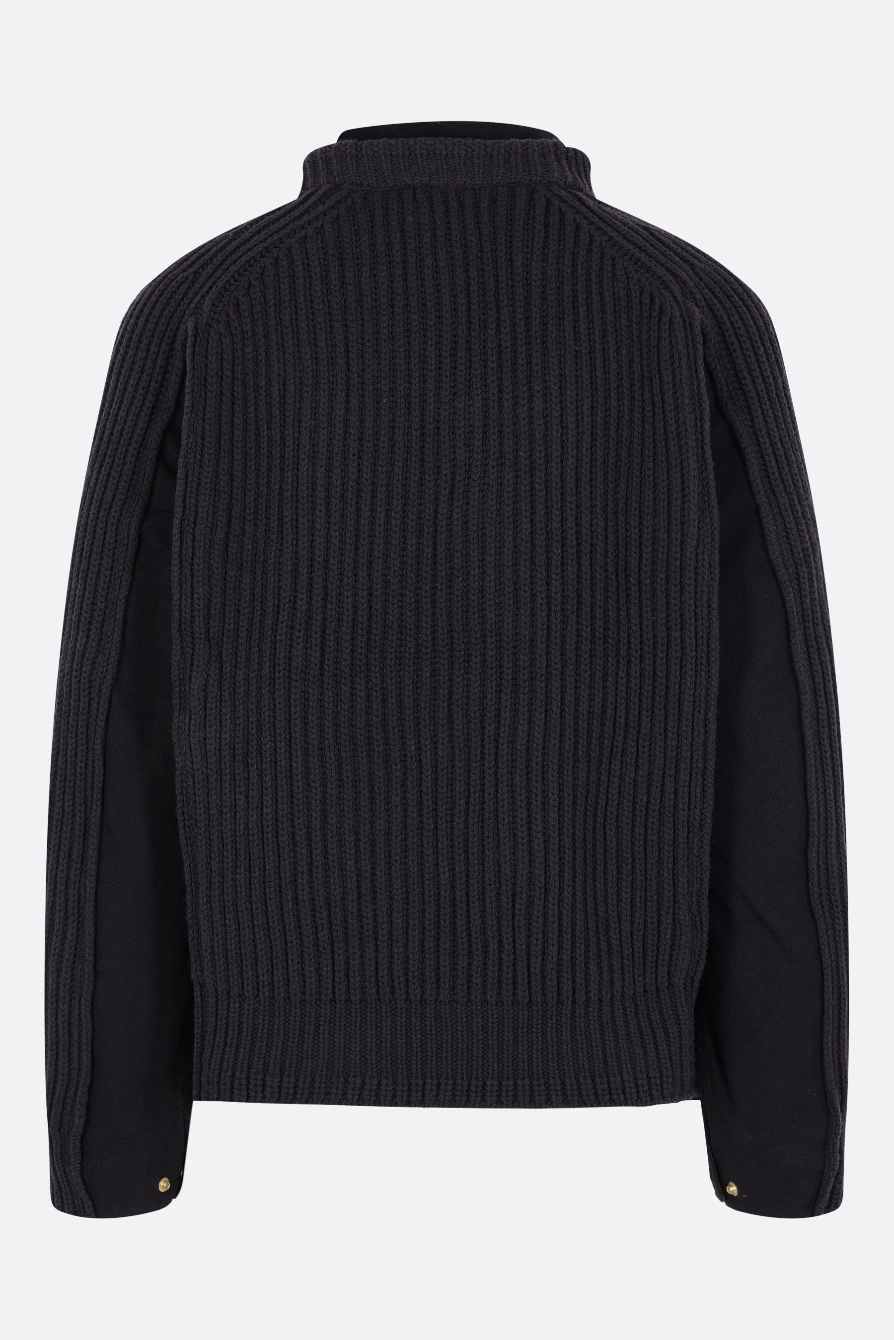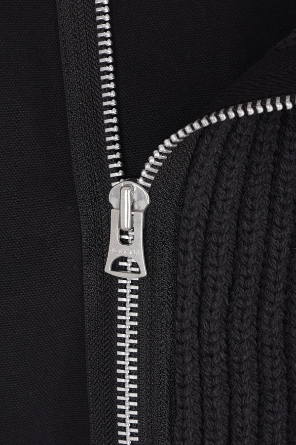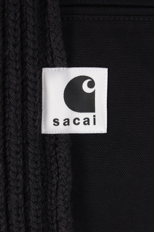 Sacai x Carhartt Wip deconstructed jacket crafted from black cotton canvas and wool-blend ribbed knit. Featuring a corduroy pointed collar, off-center double-slider zip closure, multiple pockets, long sleeves with buttoned cuffs, and a straight hem with adjustable side tabs. Partially lined interior. The design is completed with a Sacai/Carhartt logo patch on the chest.