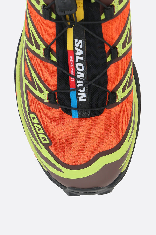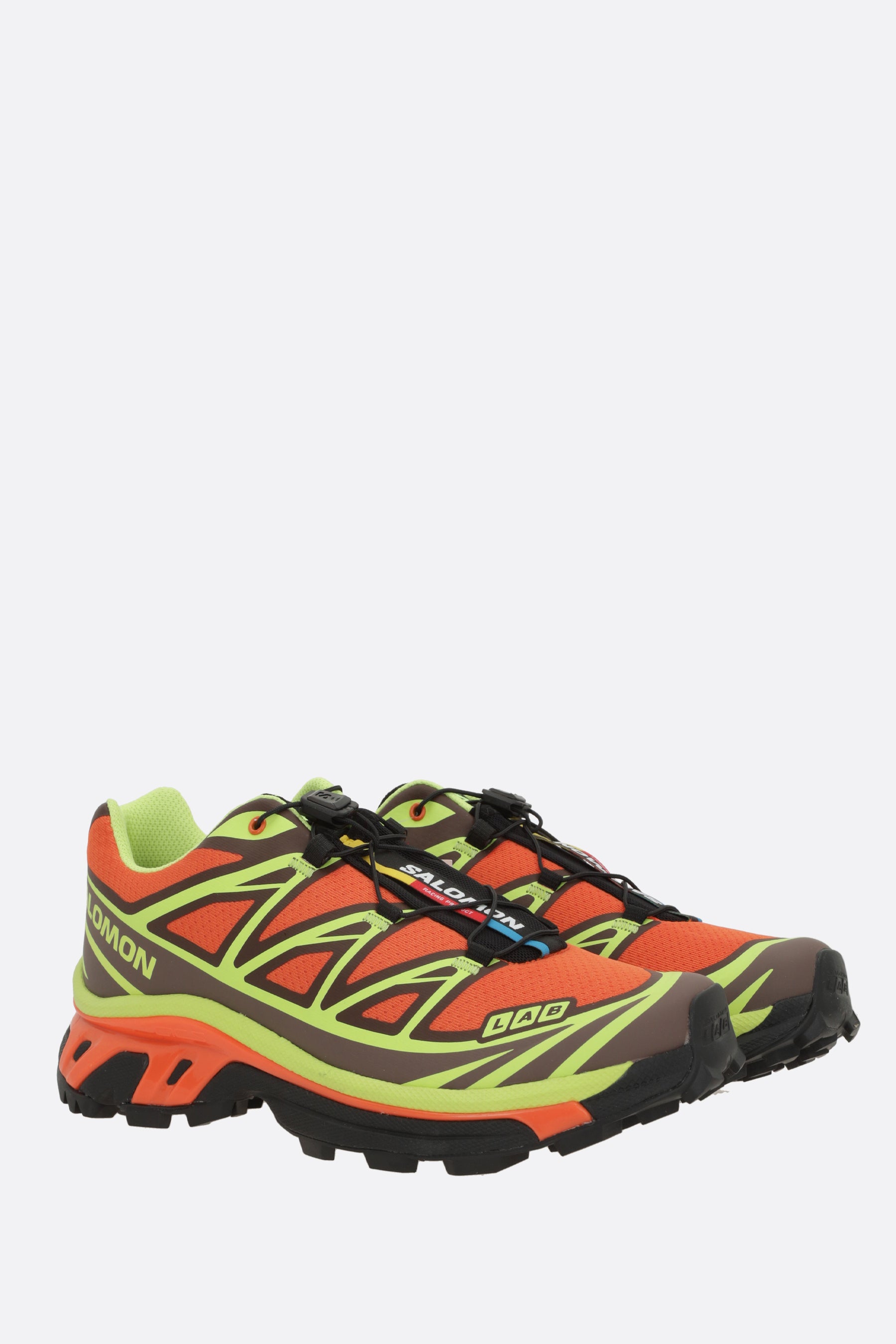 Salomon S/Lab low-top sneakers crafted from orange mesh with contrasting heat-sealed details. Features a toggle lace-up closure, round toe, molded OrthoLite® insole, fabric lining, and a textured rubber sole with Mud Contagrip® technology. The design is completed with a logo label on the tongue and a printed logo on the side.
