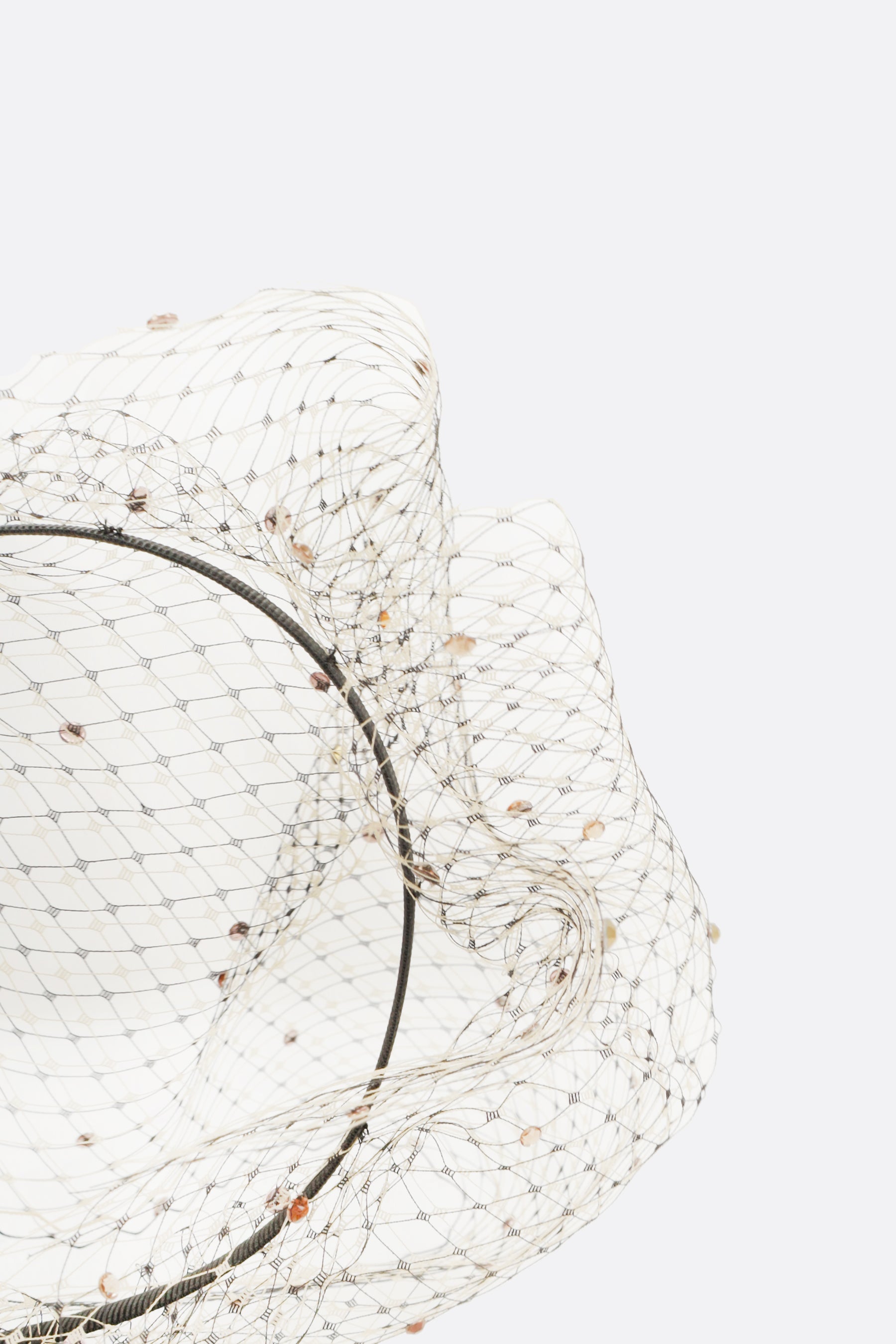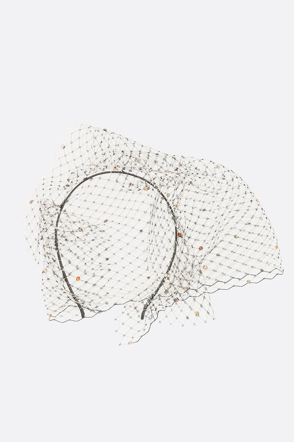 Stephen Jones headband made of black grosgrain, featuring a front veil decorated with orange crystals.