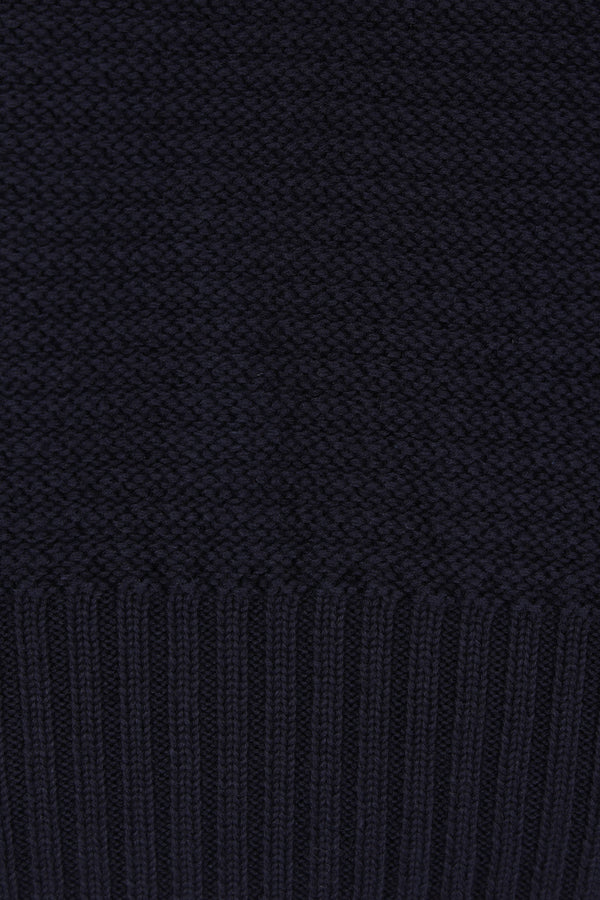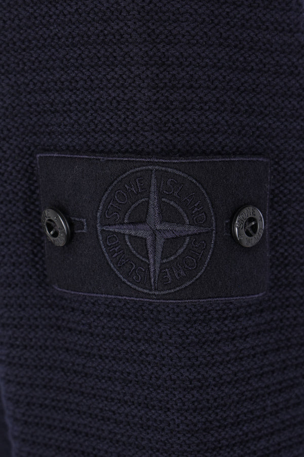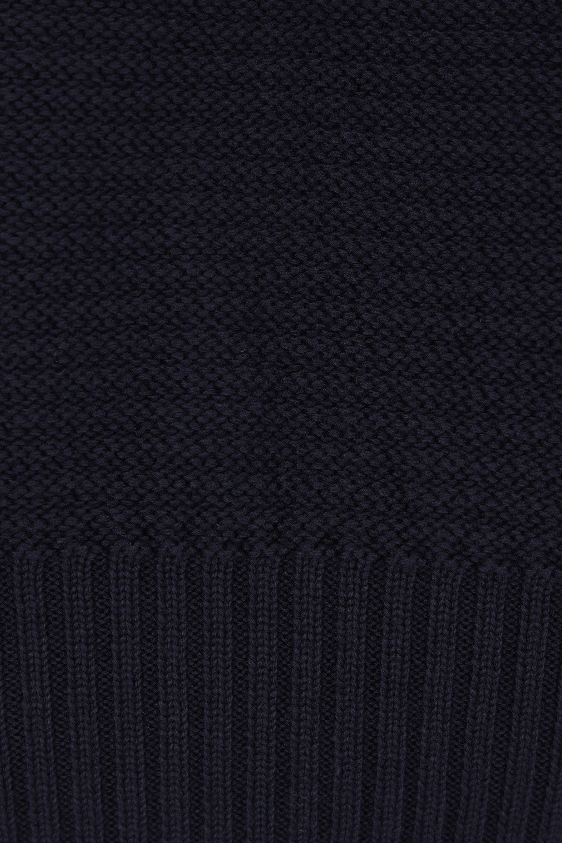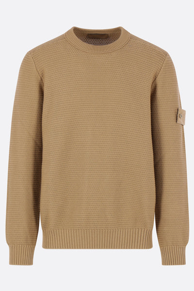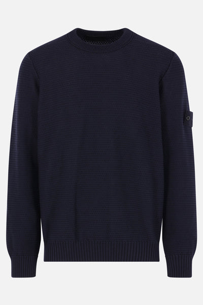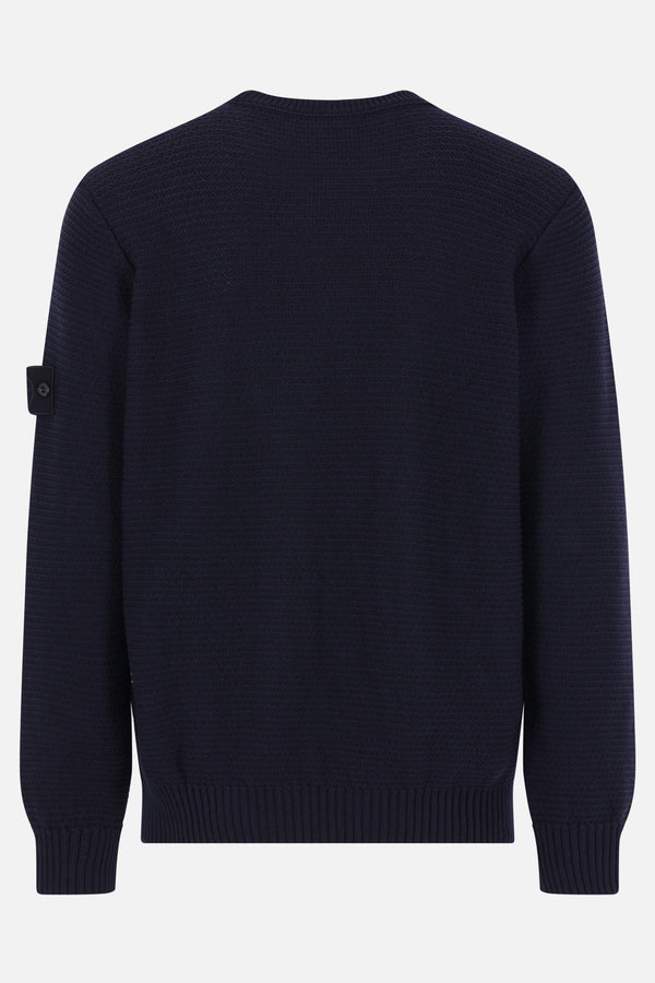 Stone Island sweater crafted from blue cotton-cashmere knit with a removable logo badge. It features a crew neckline, long sleeves, and ribbed trims. Ghost Collection.